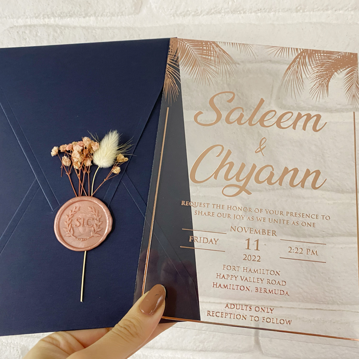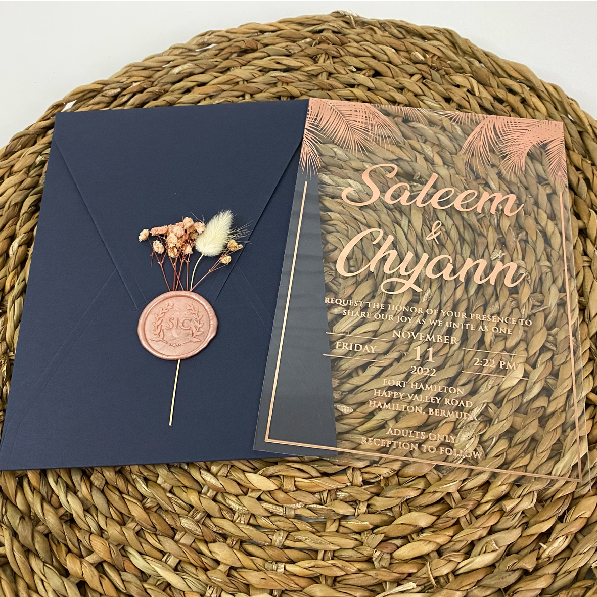Clear acrylic wedding invitation. Rose gold foil printing. Navy blue envelope. Rose wax seal and dried flowers