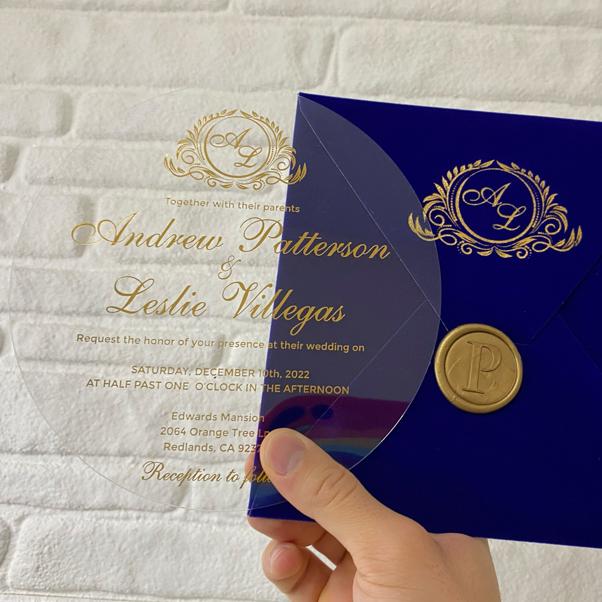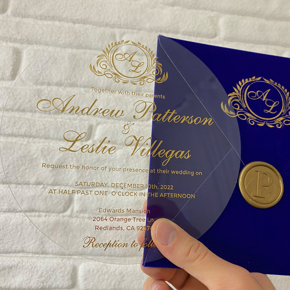 Gold foil printed  0.70 micron flexible acrylic invitation + Velvet envelope + Wax seal