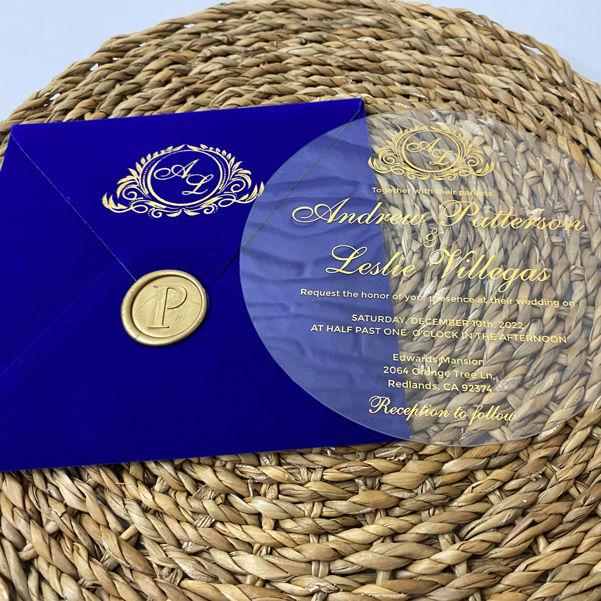 Acrylic wedding invitation with velvet envelope, Gold wax seal, Navy blue velvet envelope. Gold wax seal