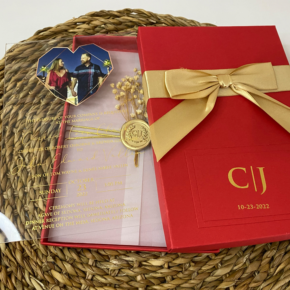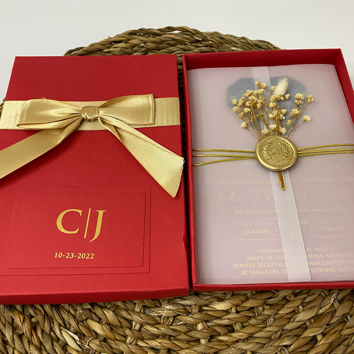 Gold foil printed 0.70 micron flexible acrylic invitation + Parchment wrapWax Seal and dried flowers Wedding invitation box.