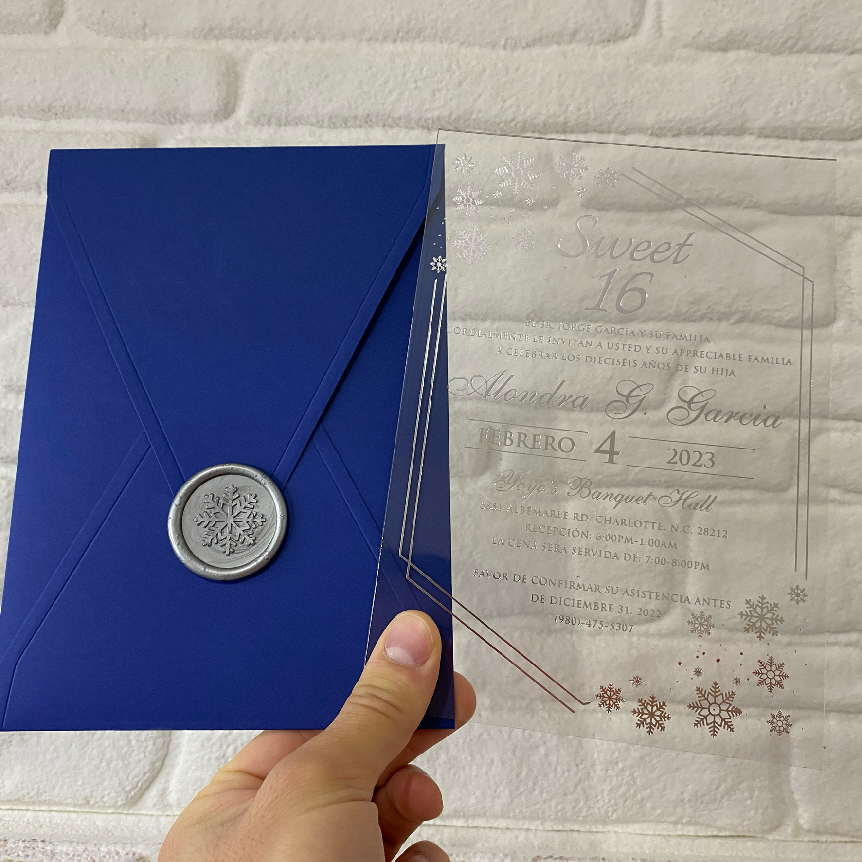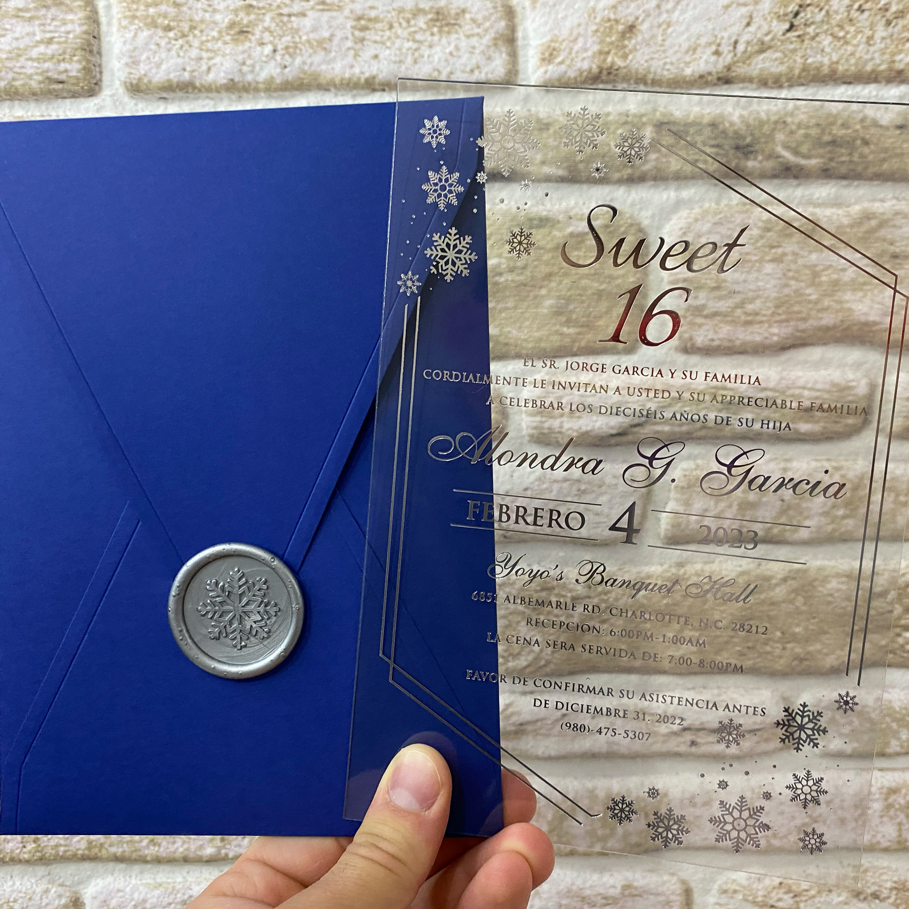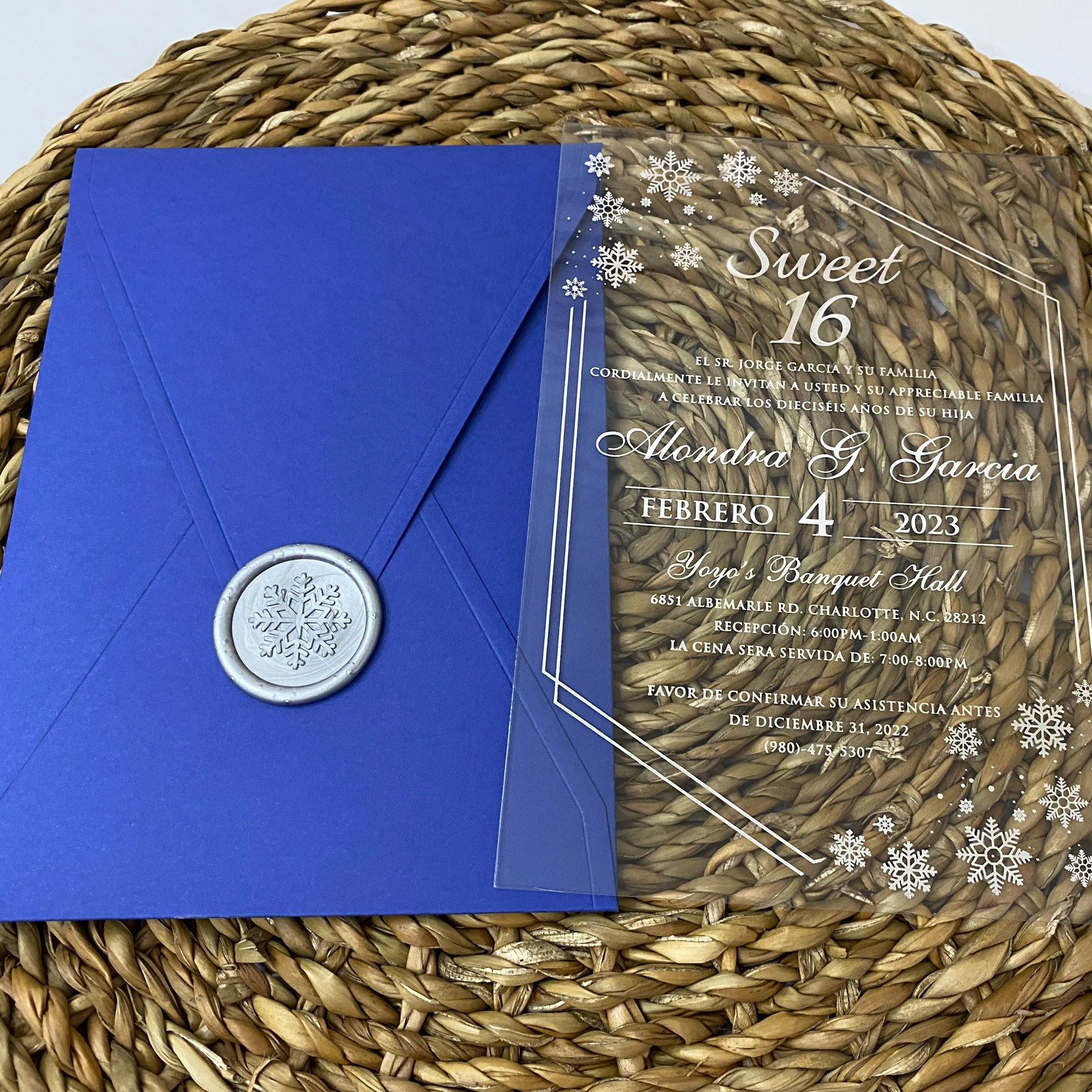 Tags: Winter themed Acrylic Sweet 16 invitation, Silver foil print, Royal blue envelope, Silver foil print, Silver wax seal