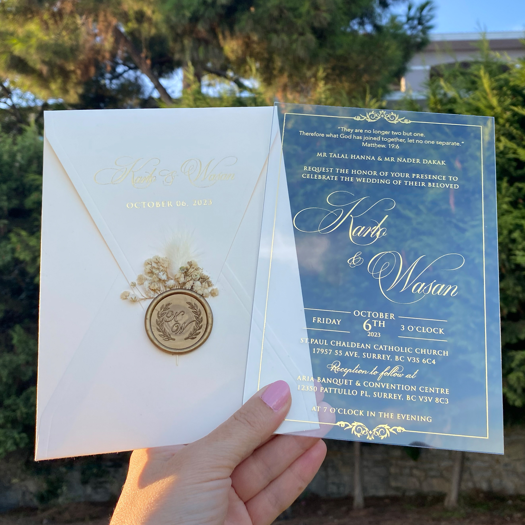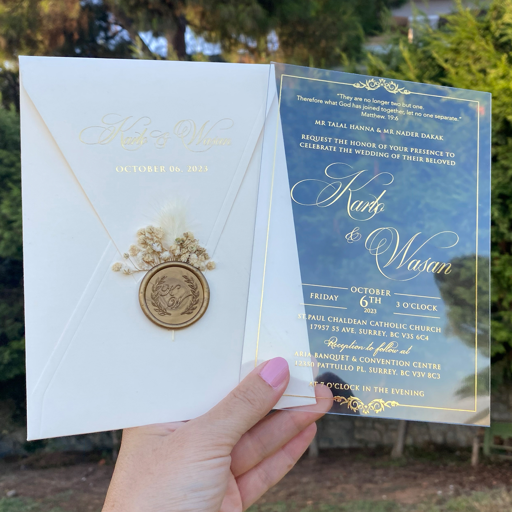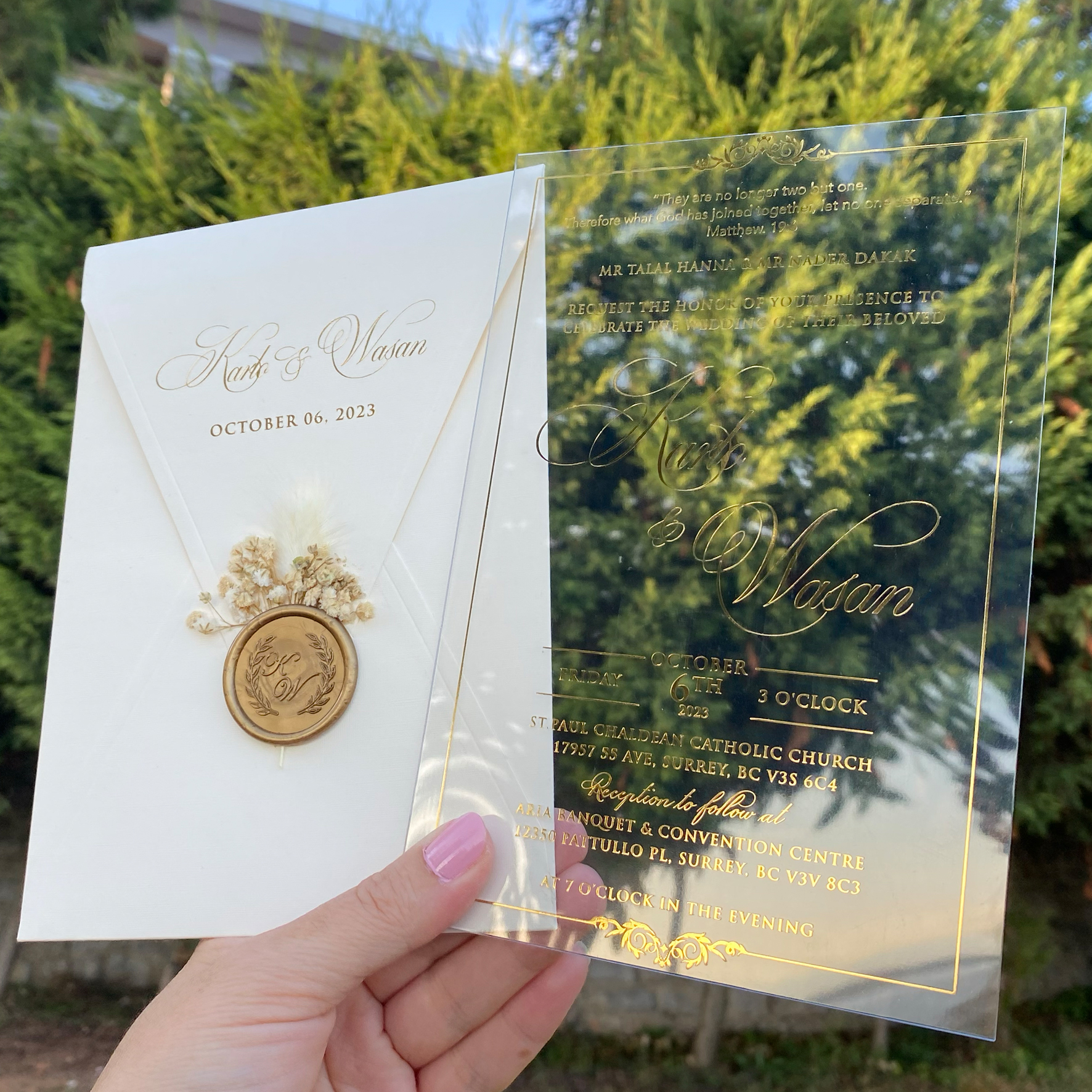 Acrylic Wedding Invitation, Gold foil print, Ivory envelope, Gold wax seal and dried flowers