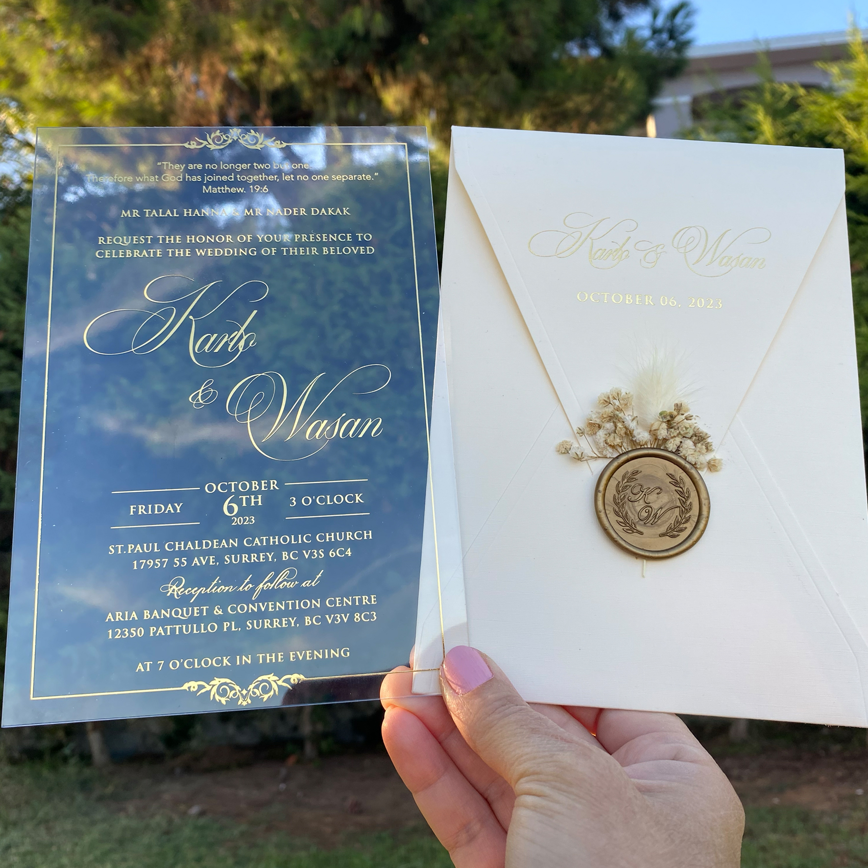 Gold foil printed 0.70 micron flexible acrylic invitation + Envelope + Wax seal+ Dried Flowers