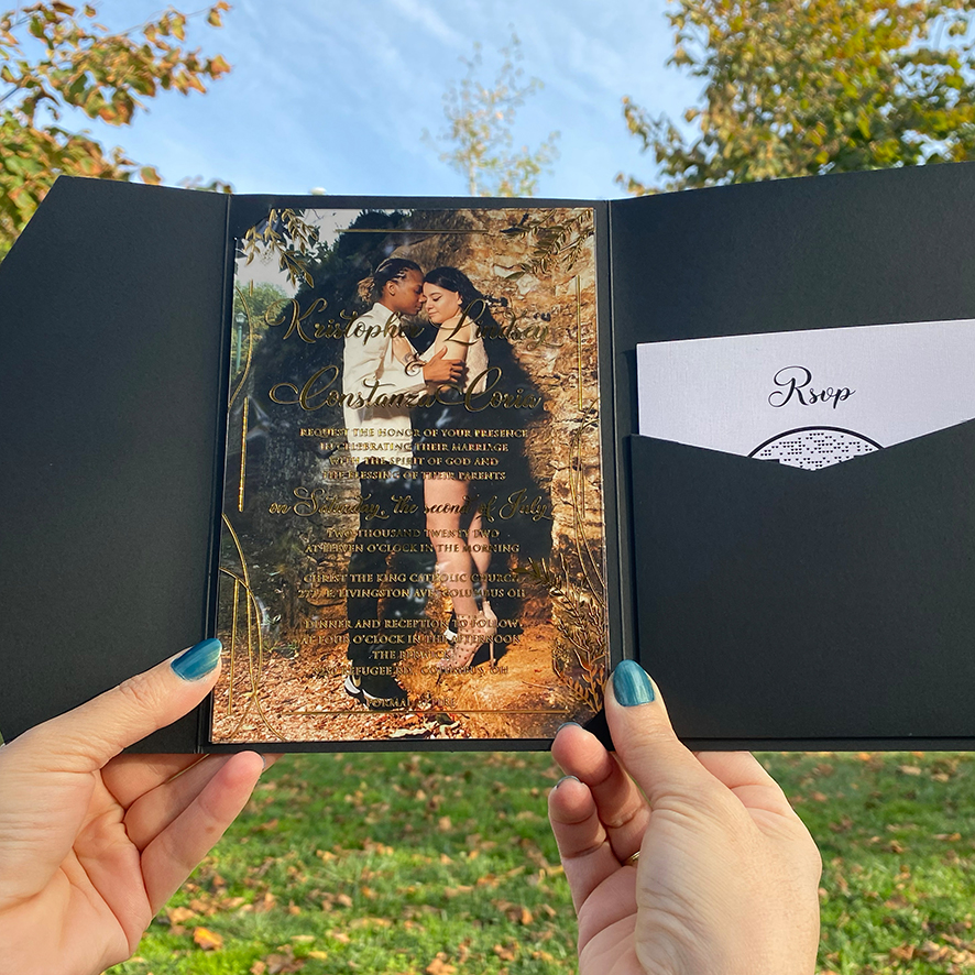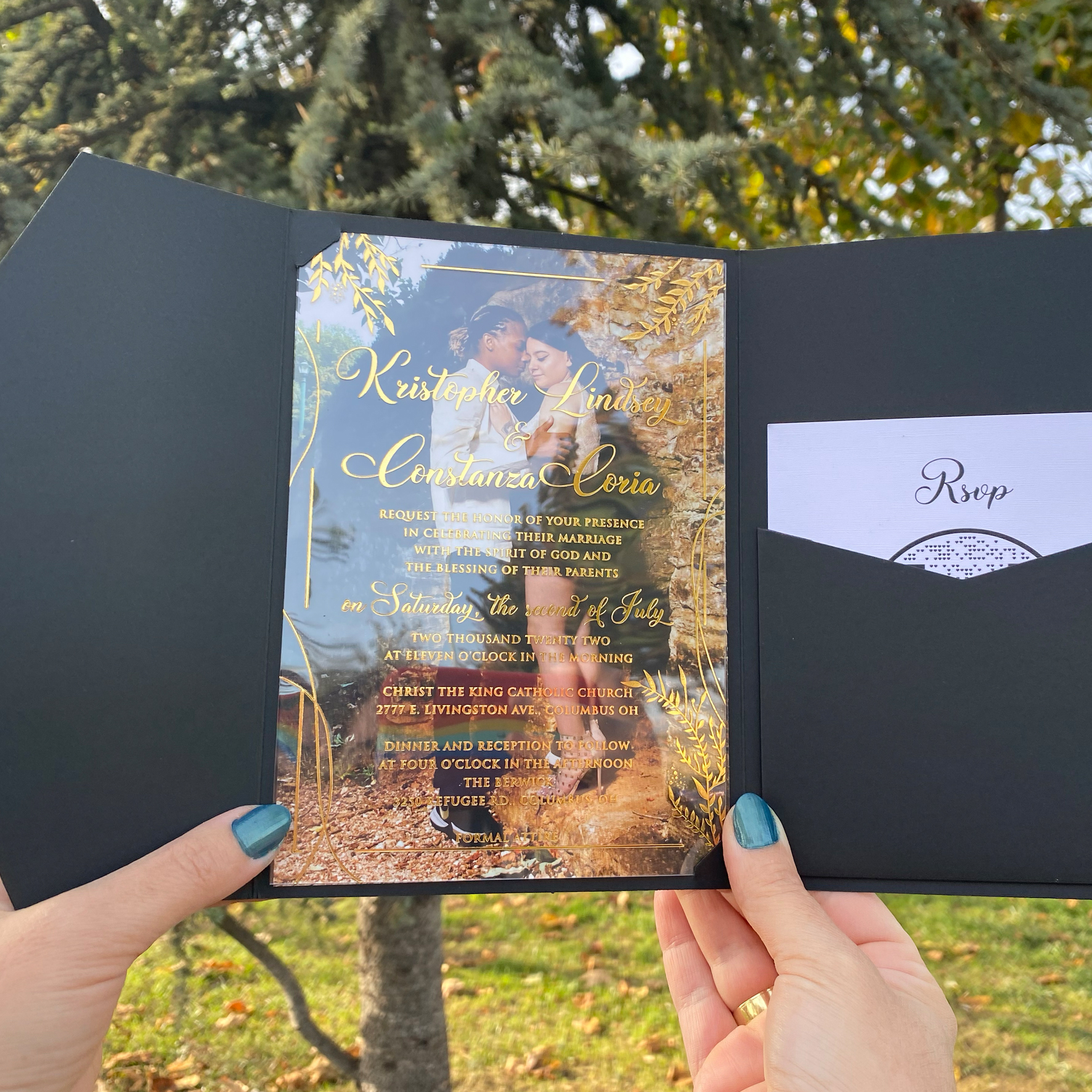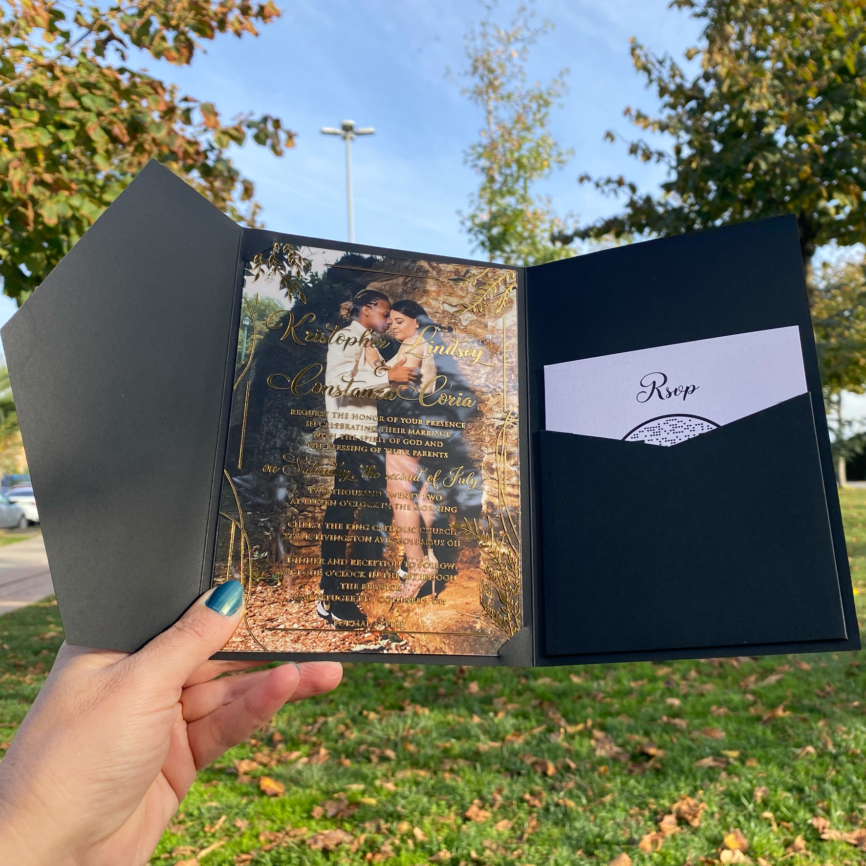 Acrylic wedding invitation with photo,  Photo printed card, Black pocket envelope, Detail card, Gold wax seal