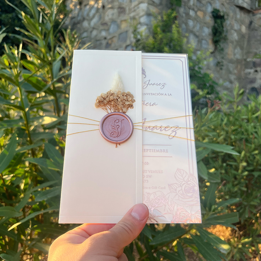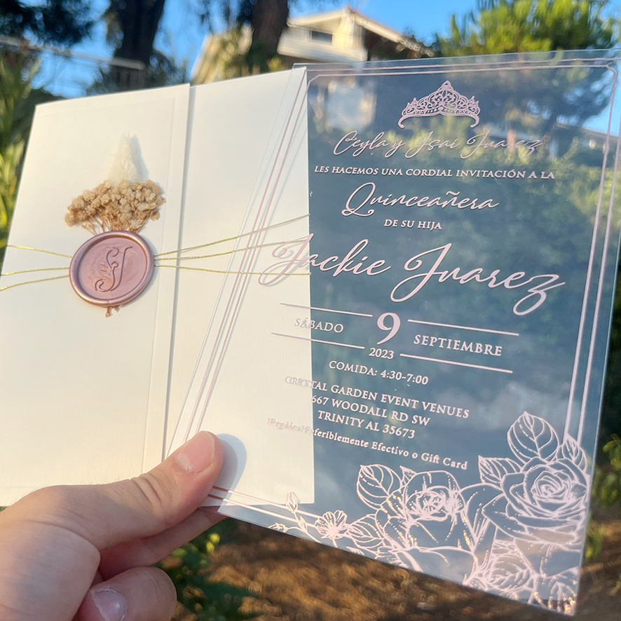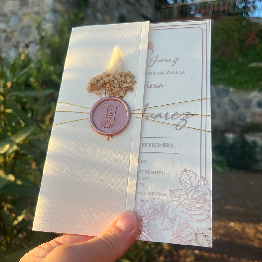 Quinceañera Invitation. Acrylic Quinceanera Invitations. Ivory half Envelope. Rose gold foil print. Wax seal and dried flowers