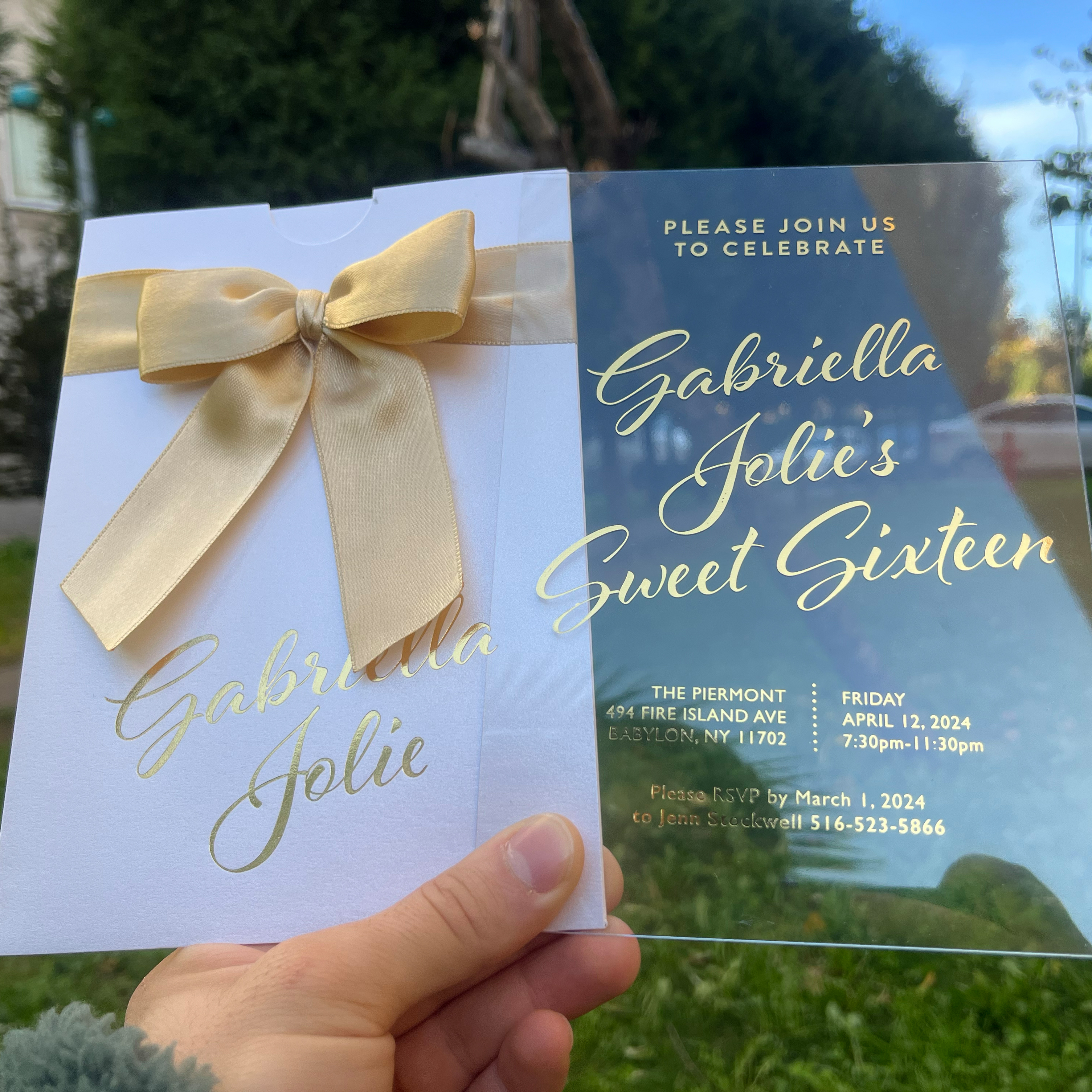 Acrylic Quinceañera Invitation. Sweet sixteen. White envelope with mother-of-pearl and ribbon. Clear Acrylic Invitation.