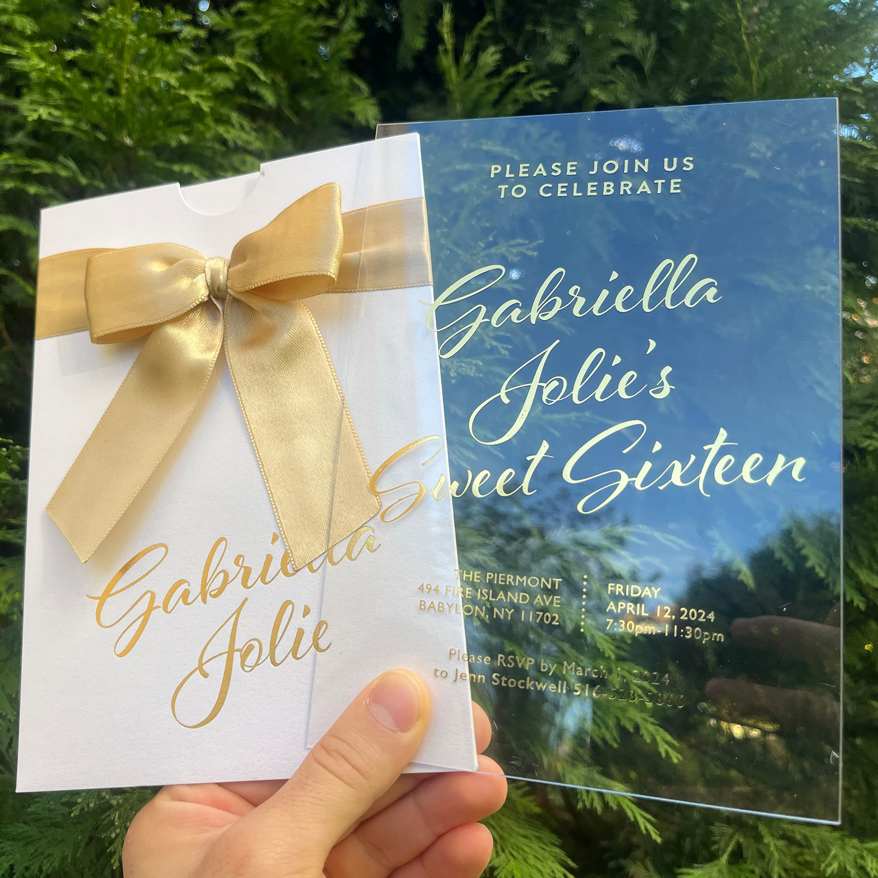 Acrylic Quinceañera Invitation. Sweet sixteen. White envelope with mother-of-pearl and ribbon