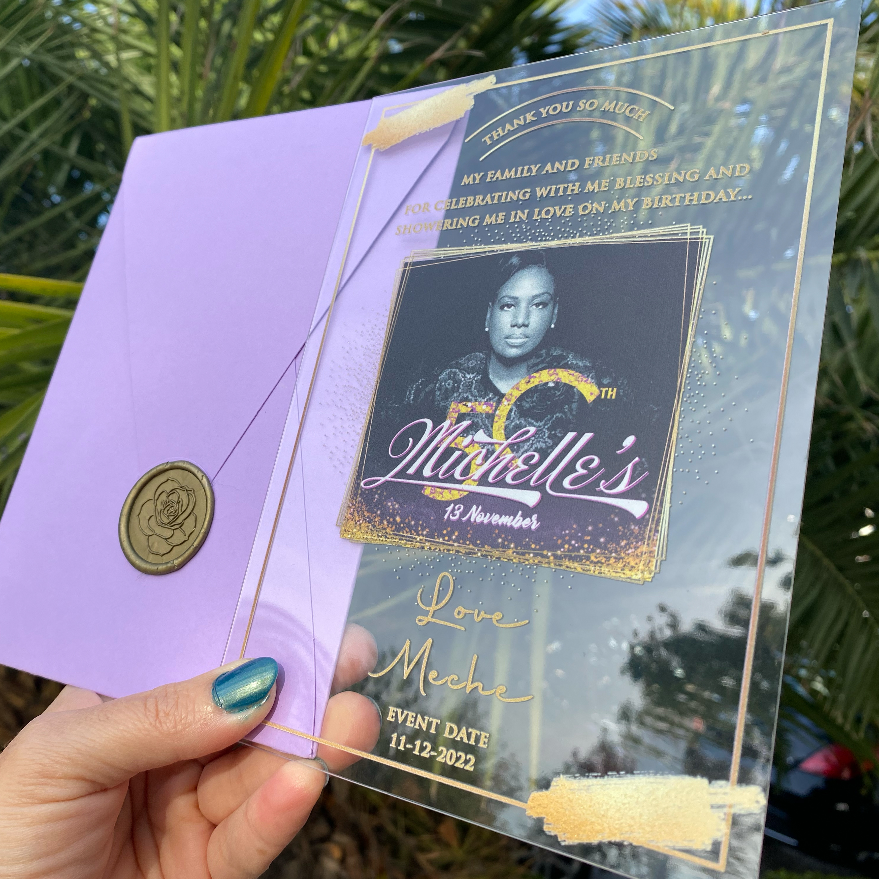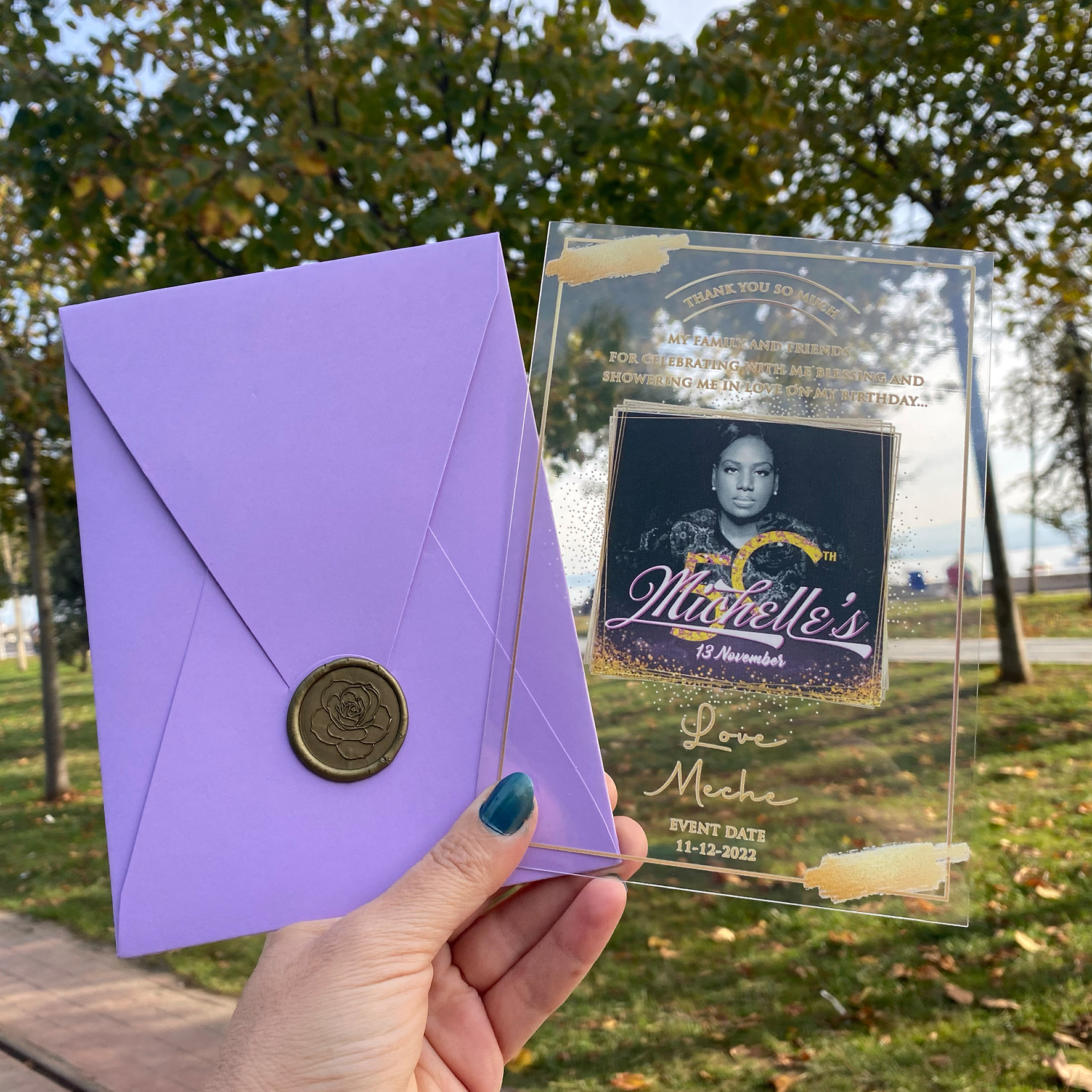 Acrylic invitation card with photo. Birthday invitation with acrylic photo. UV printed. Lilac envelope. Gold wax seal