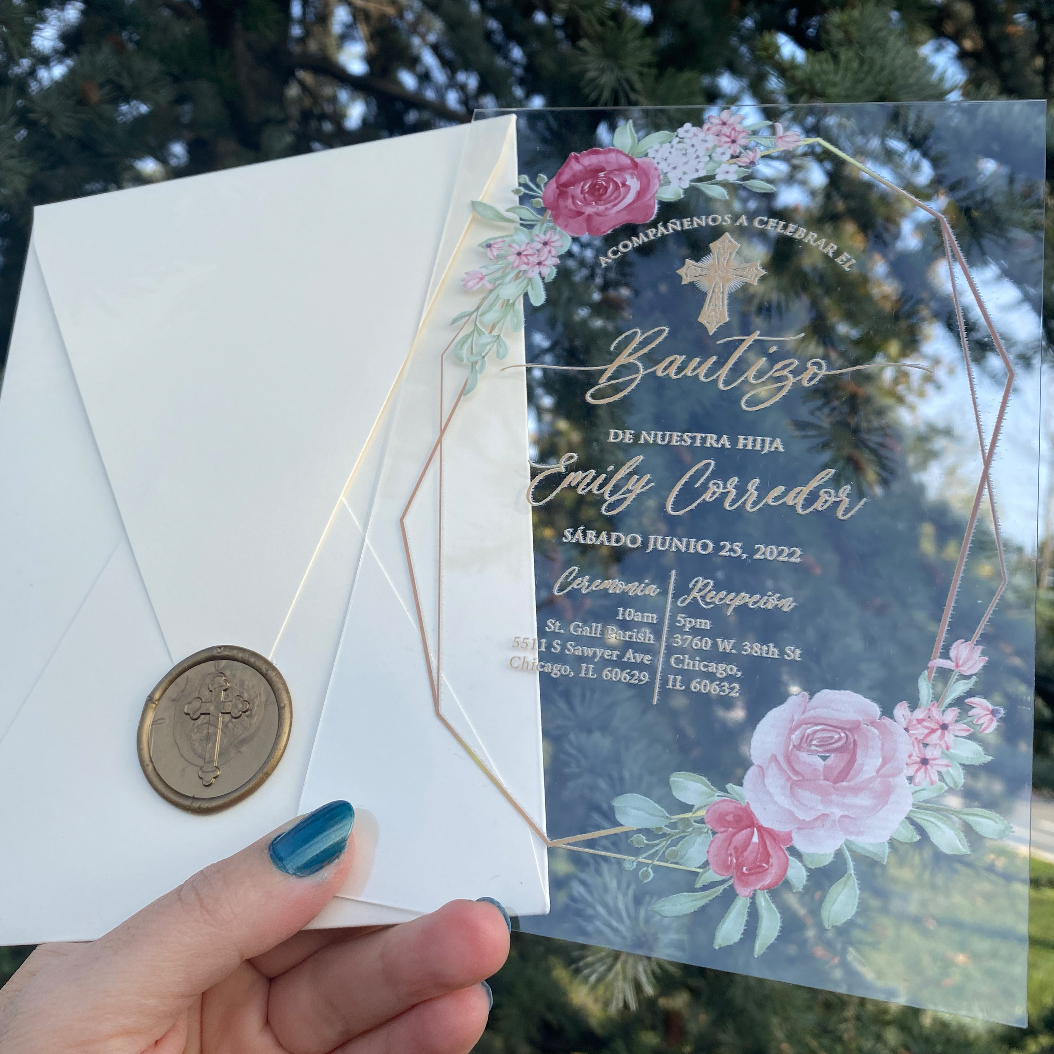 Acrylic Baptism Invitations. Floral Acrylic Baptism Invitation. Ivory envelope. Wax seal UV Printed