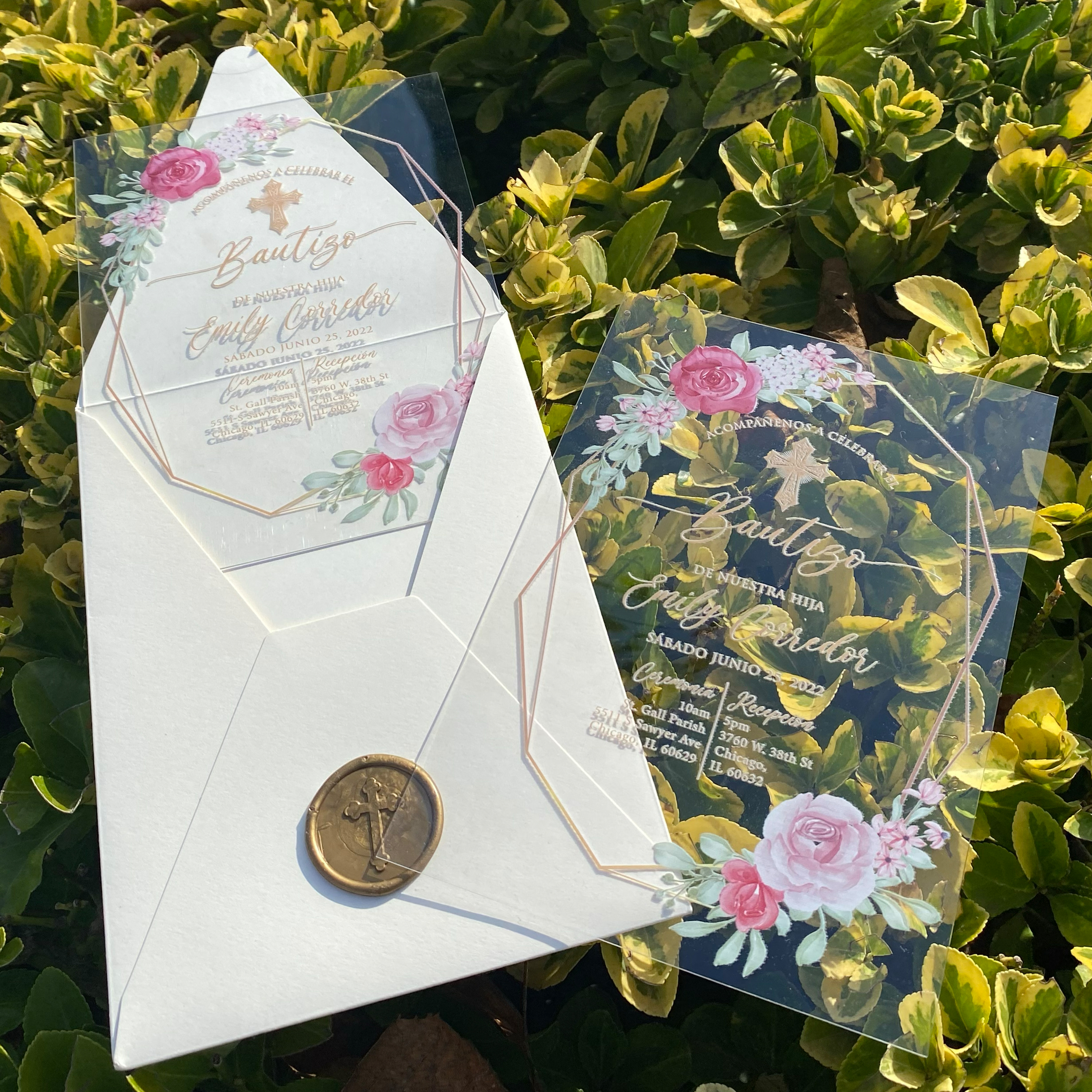 Tags: Acrylic Baptism Invitations. Floral Acrylic Baptism Invitation. Ivory envelope. Wax seal .UV Printed