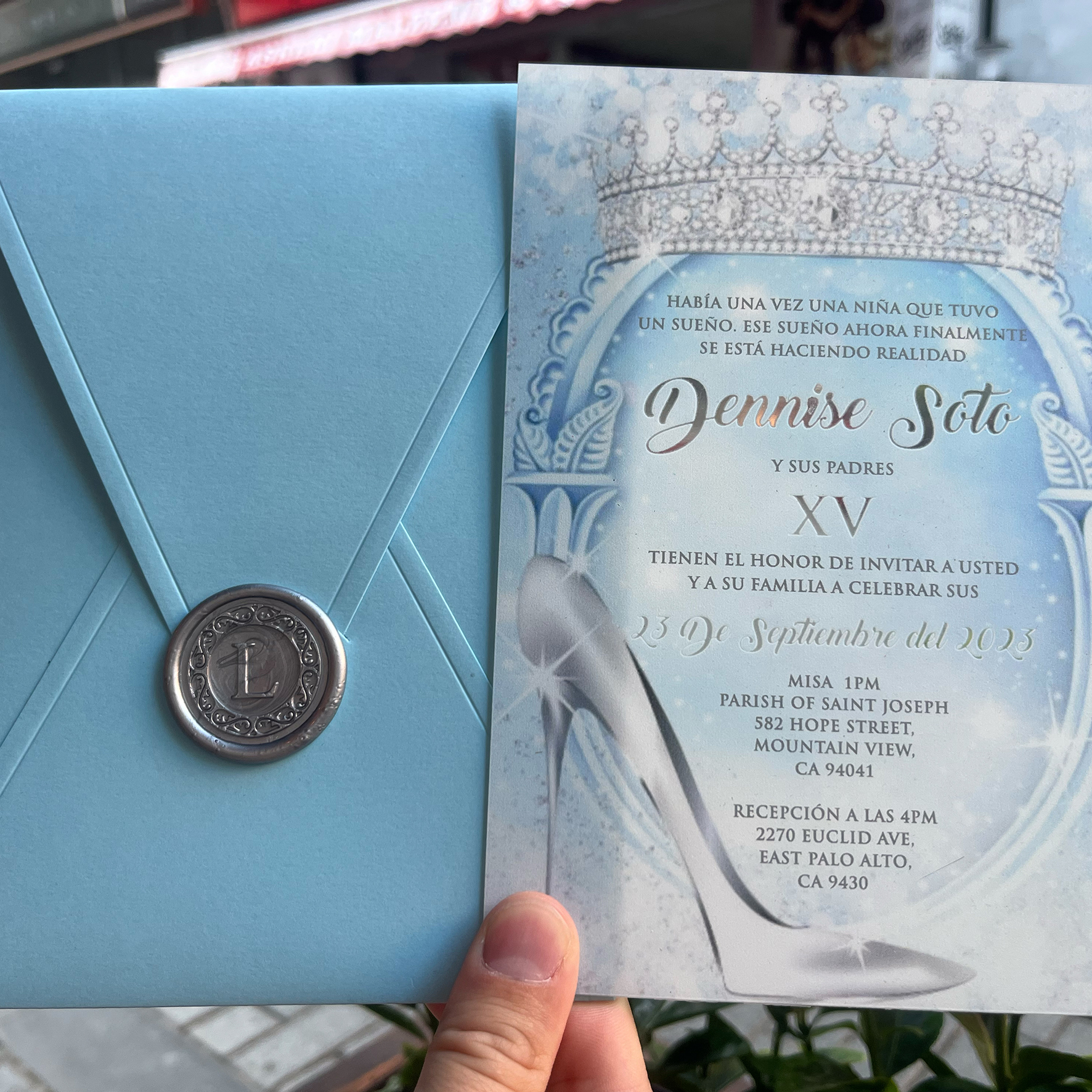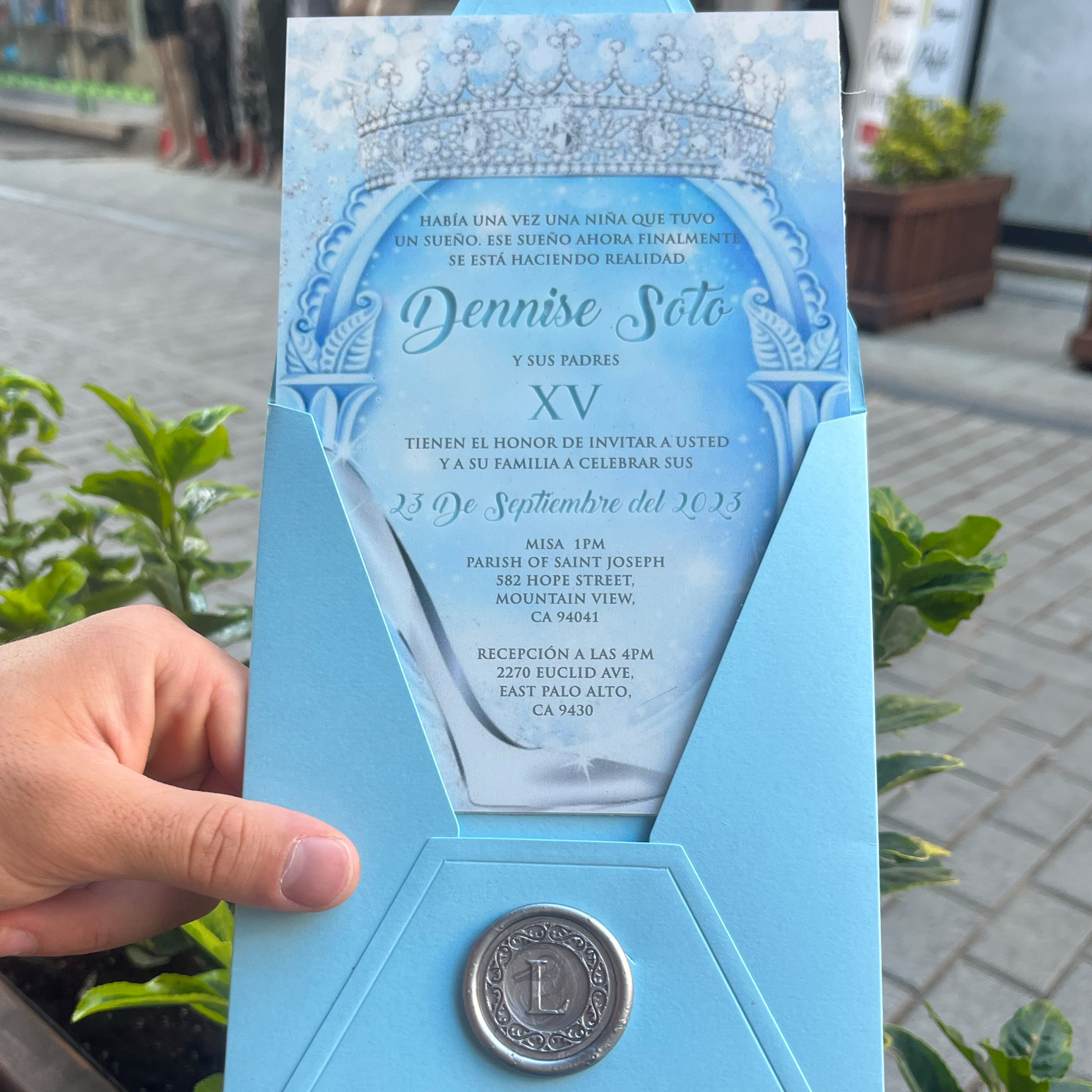 Princess themed acrylic Quinceañera invitation. Light blue envelope. UV printing. Silver wax seal