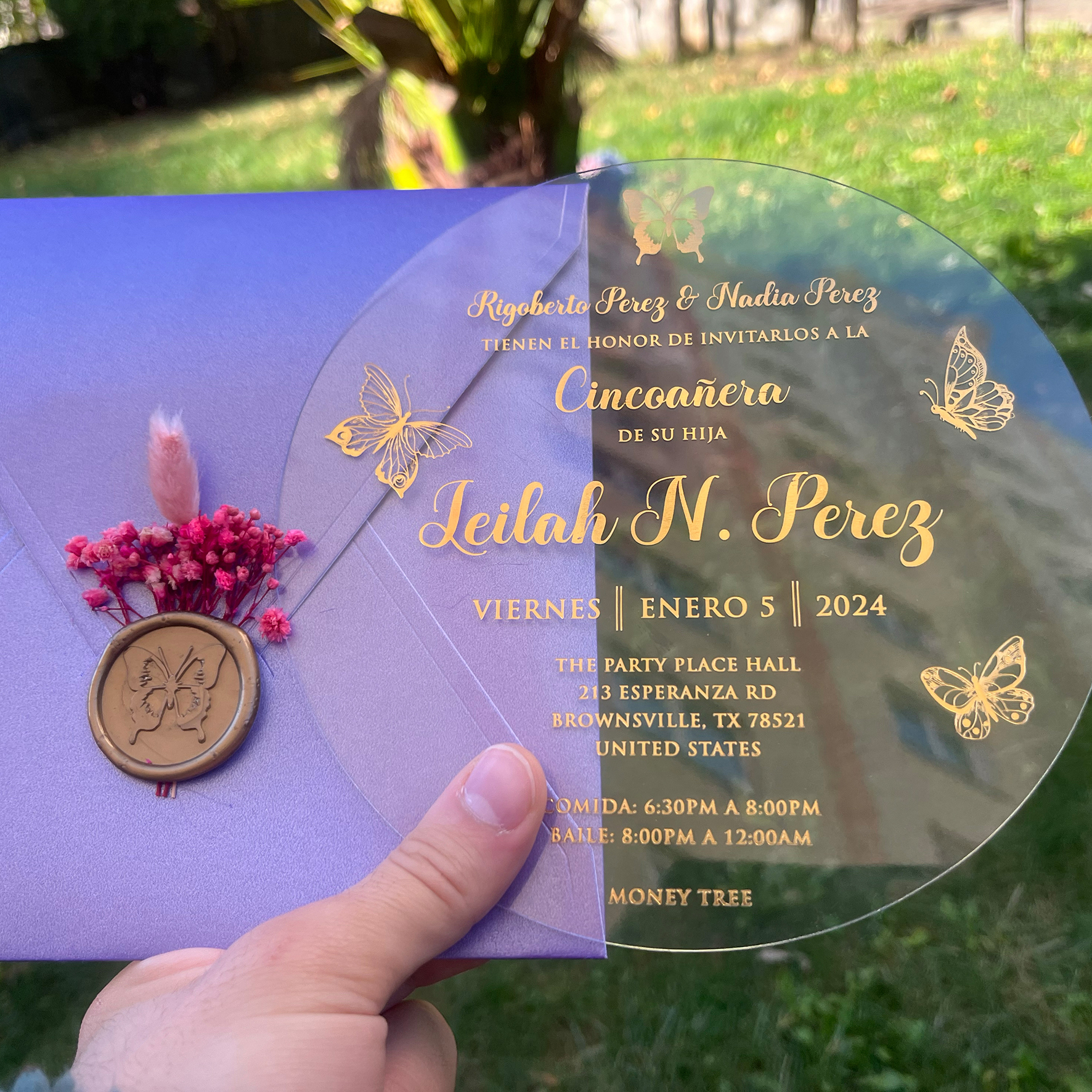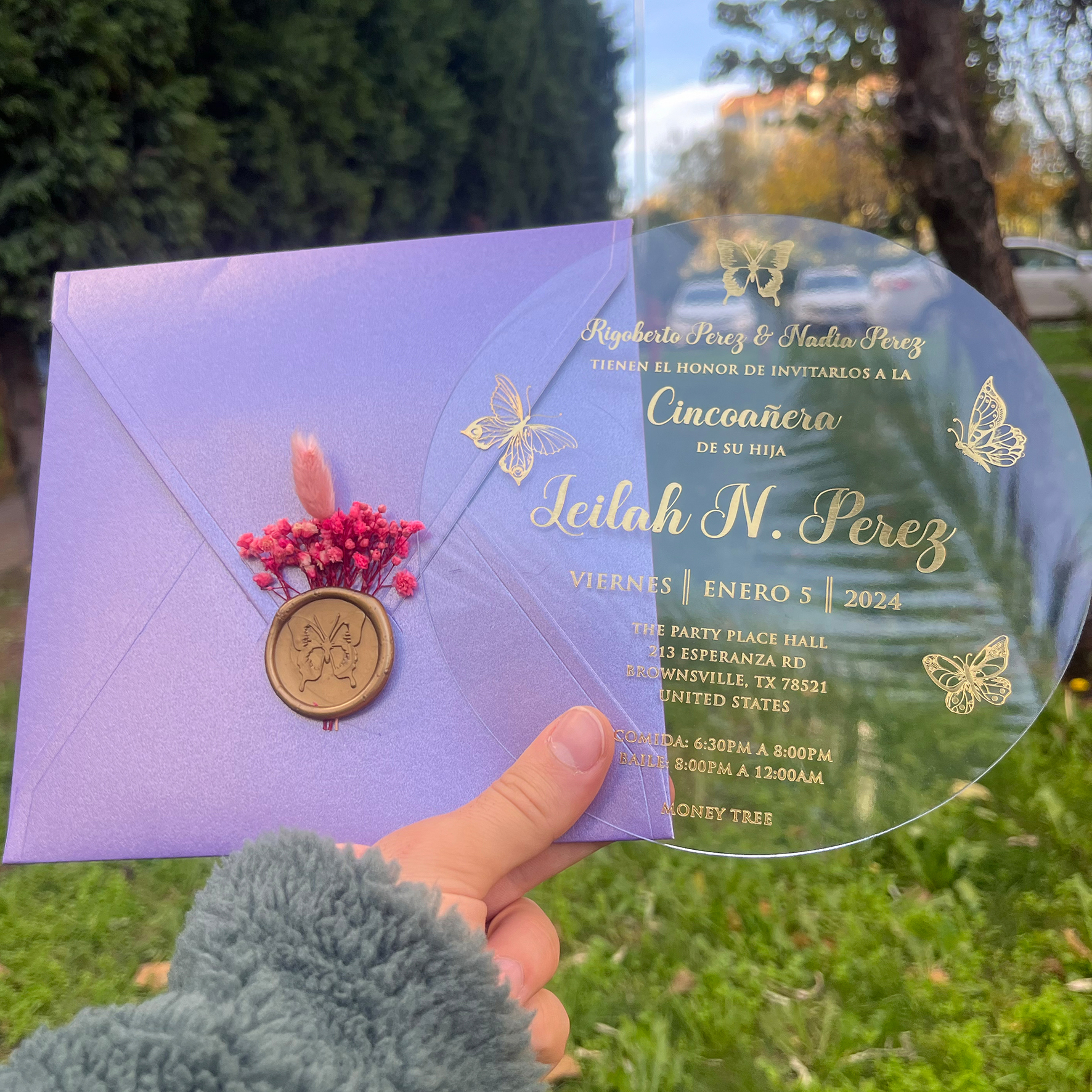 Quinceañera invitation with acrylic butterflies. Acrylic Round invitation card. Lilac mother-of-pearl envelope. Gold foil print. Golden wax seal and dried flowers.
