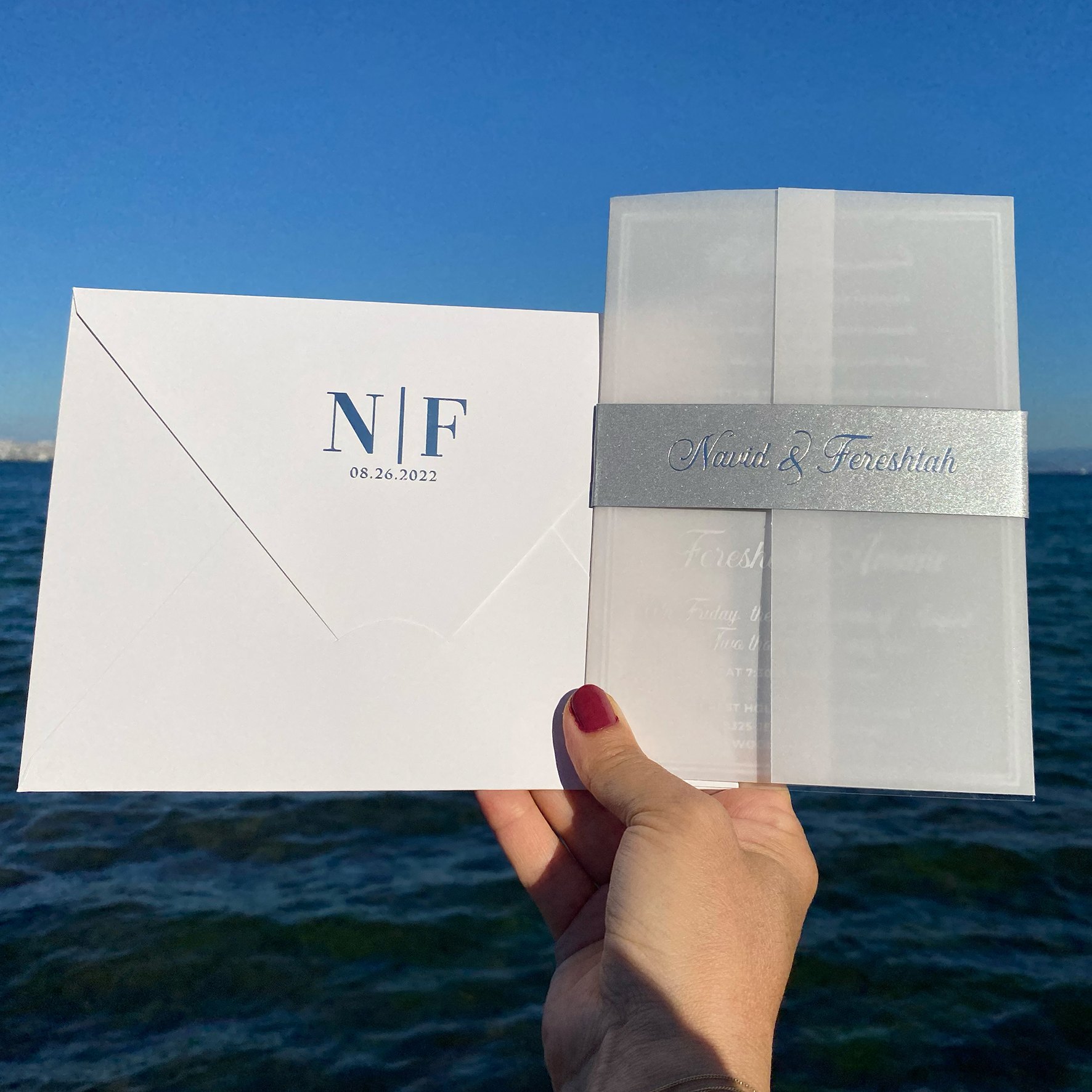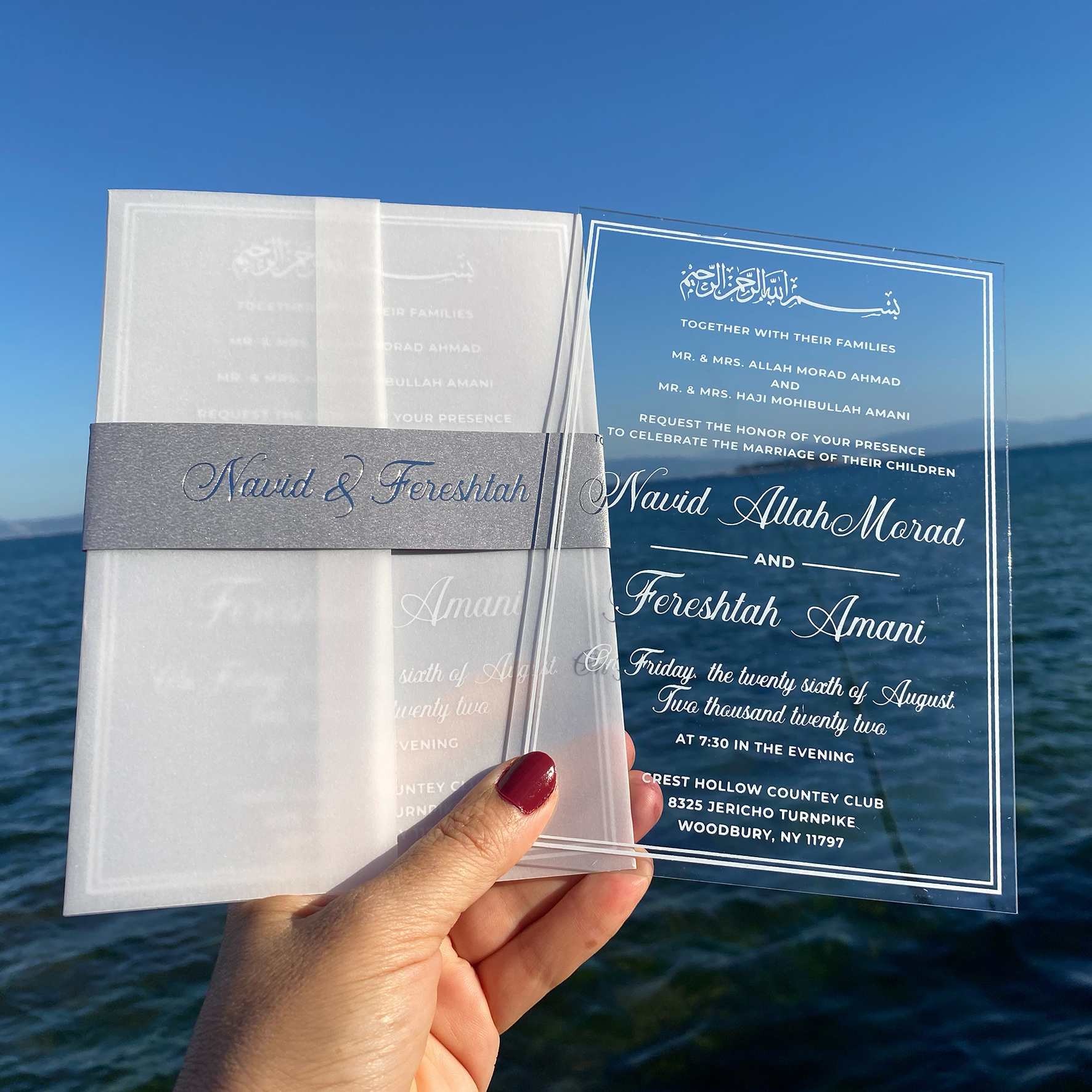 White printed clear acrylic wedding invitation. Parchment wrapping. Belly band with silver foil print. White mailing envelope.
