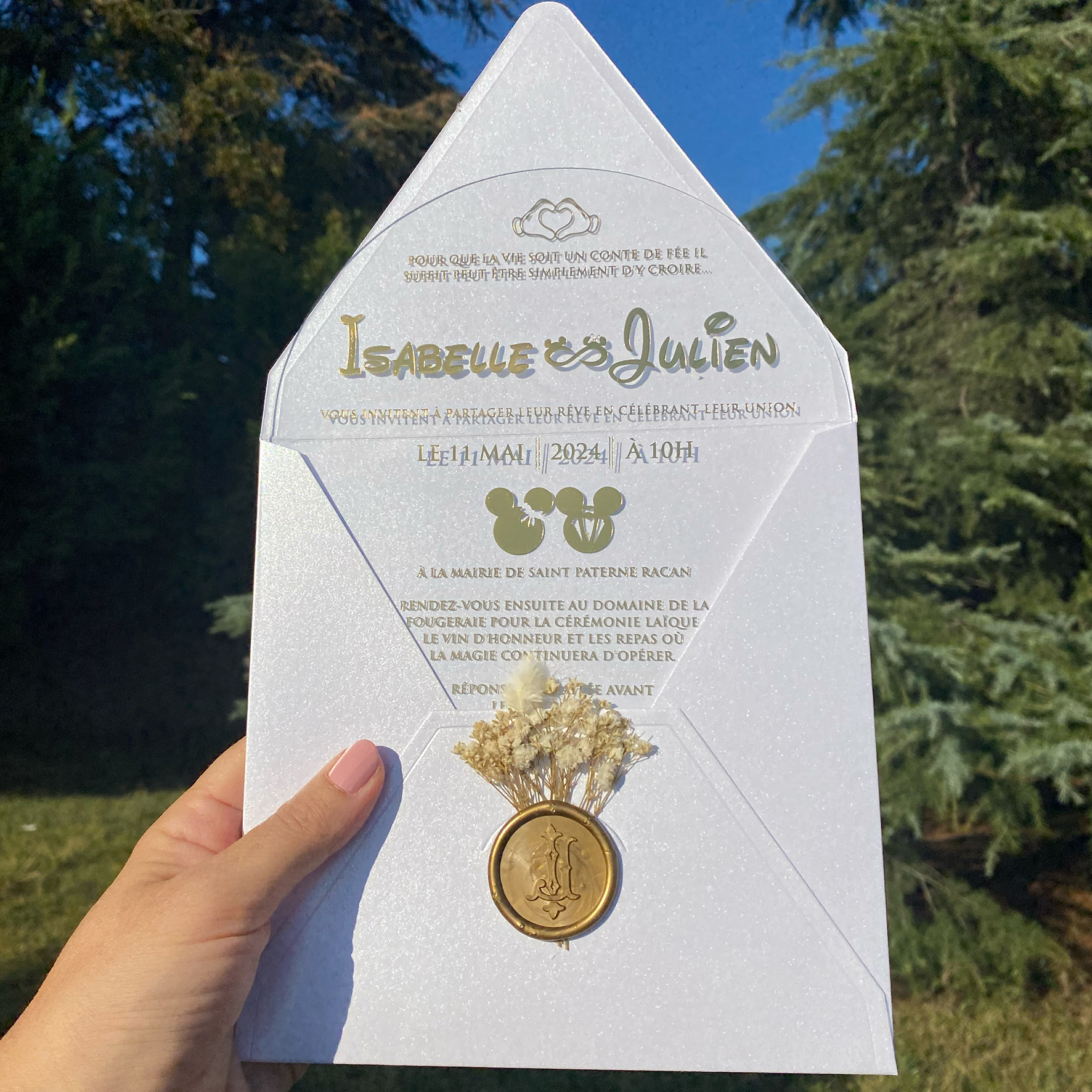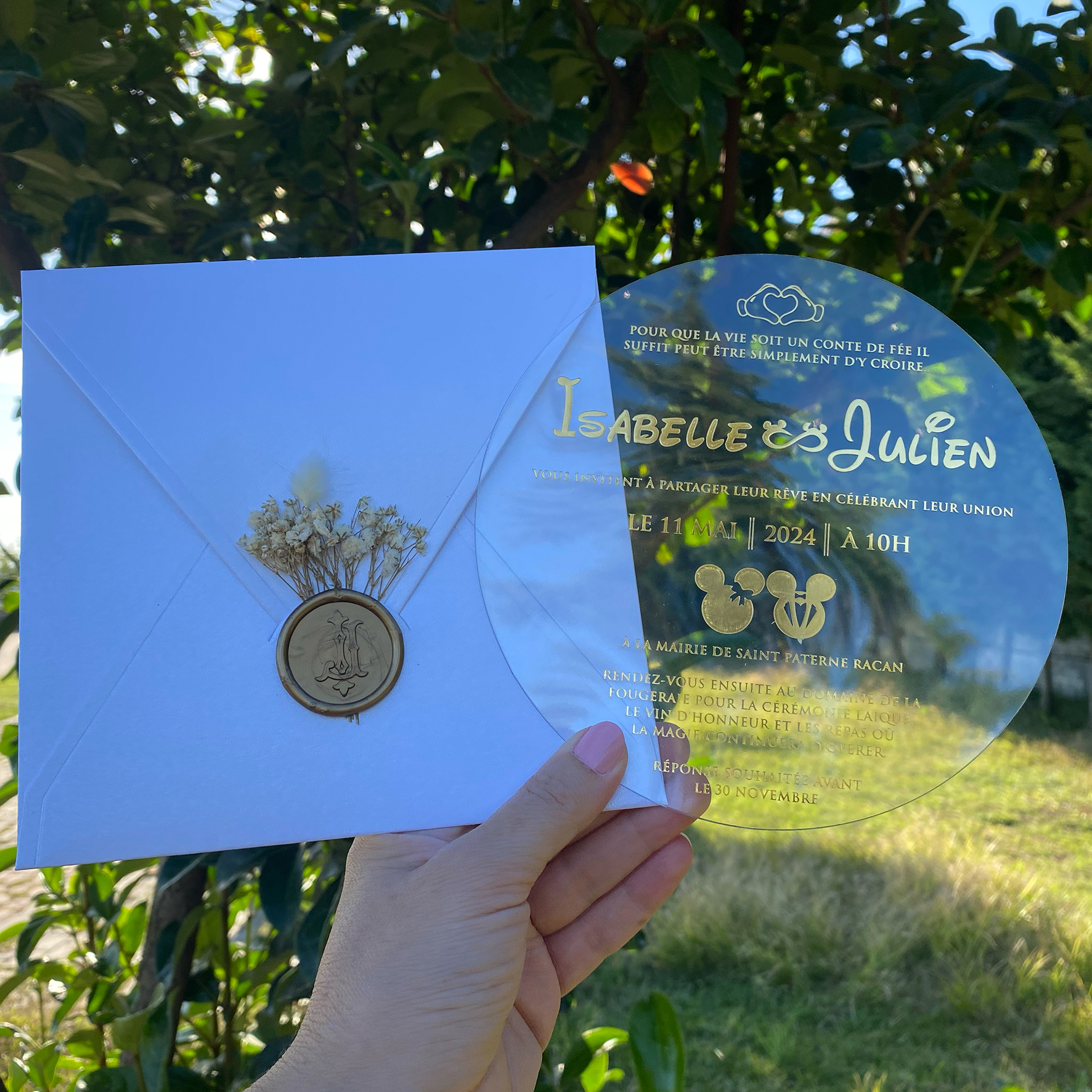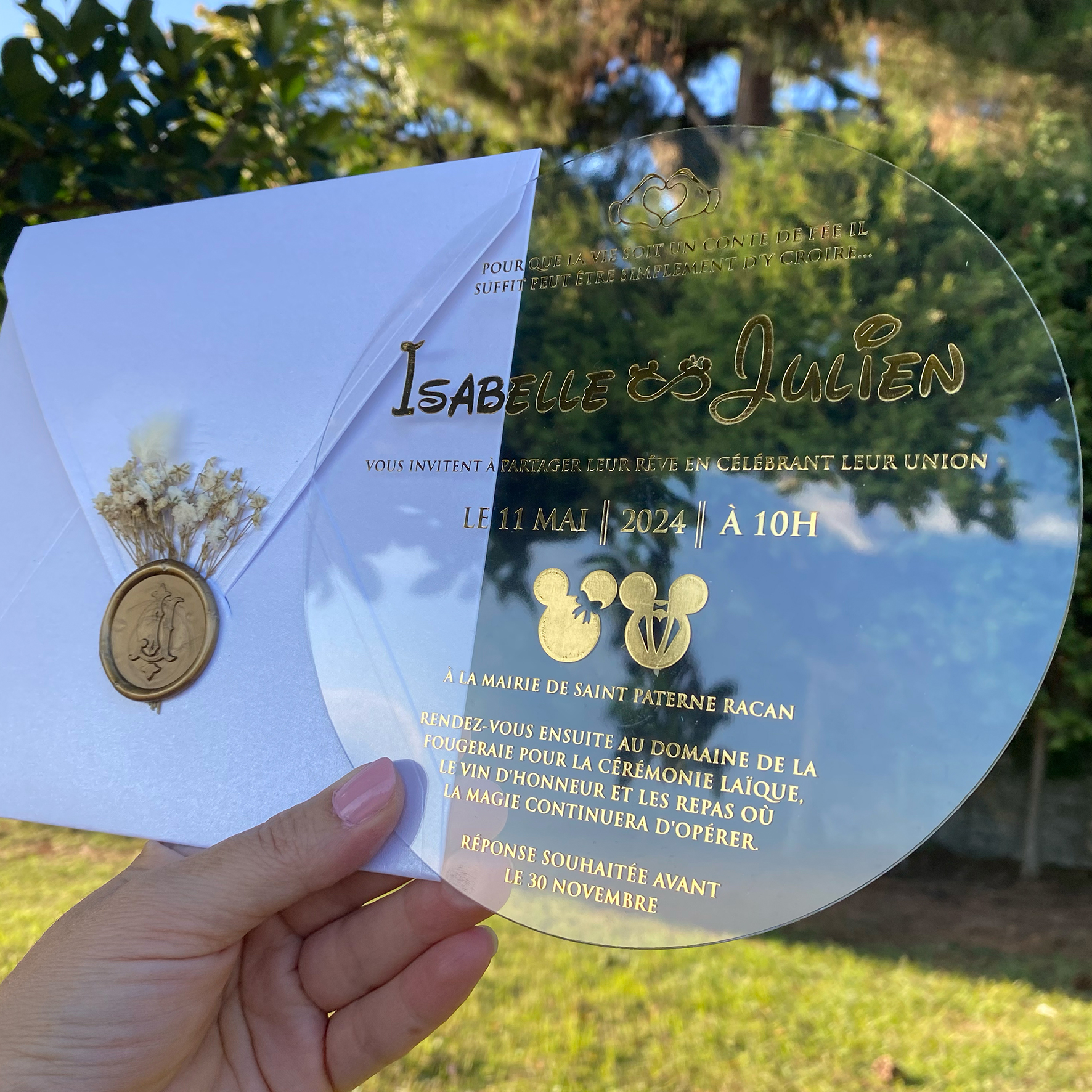 Mickey and Minnie themed acrylic wedding invitation with gold foil print. White pearlescent envelope. Golden wax seal and dried flowers.