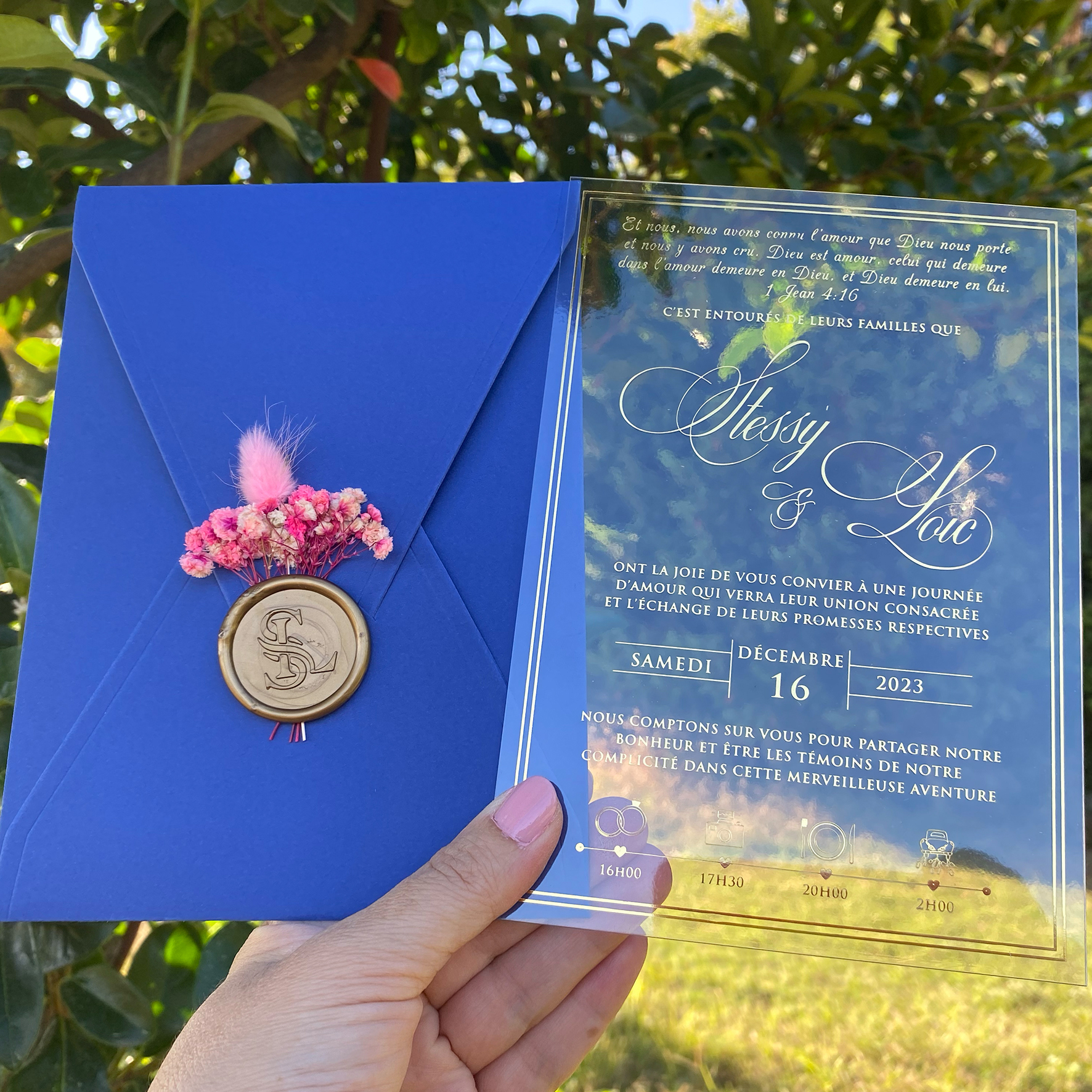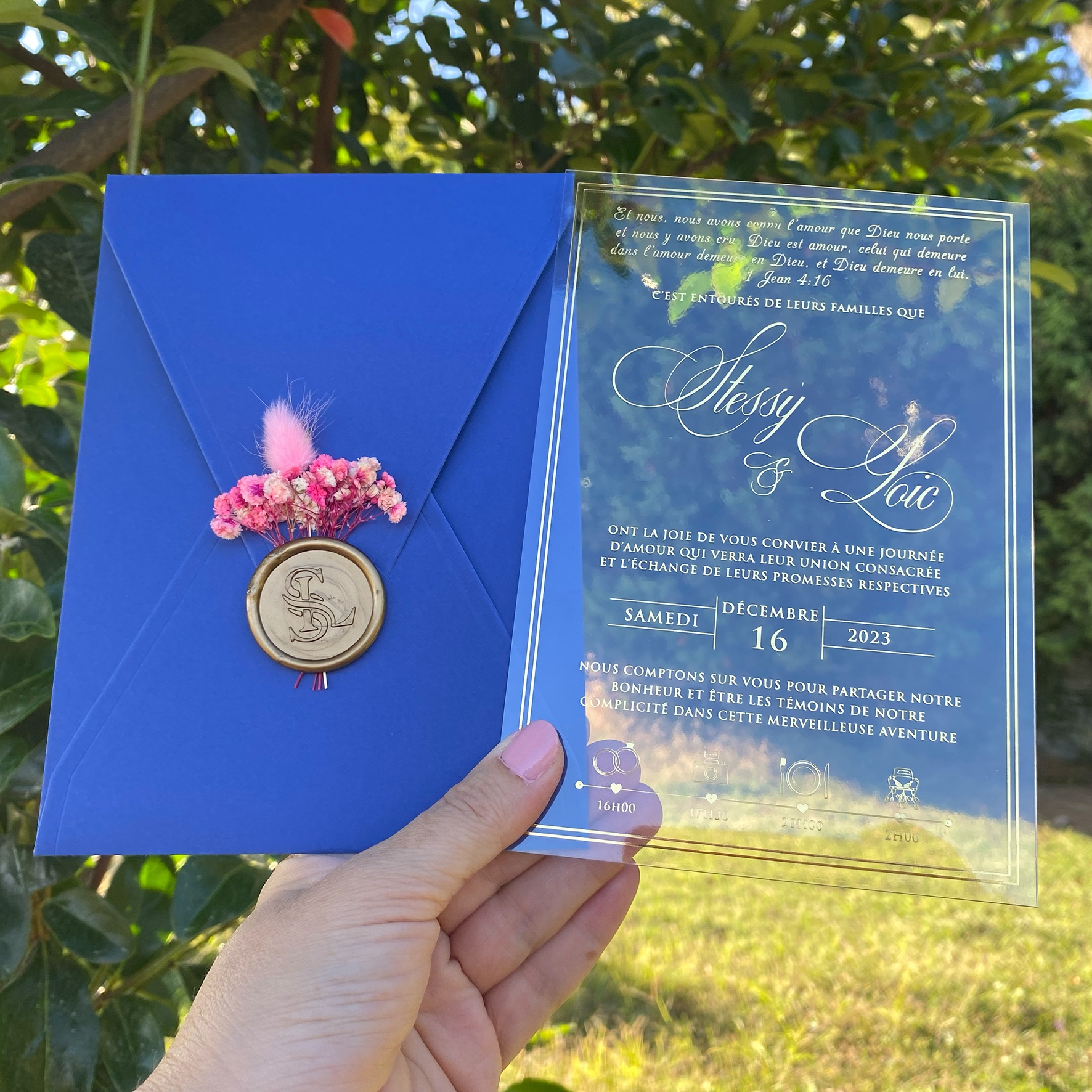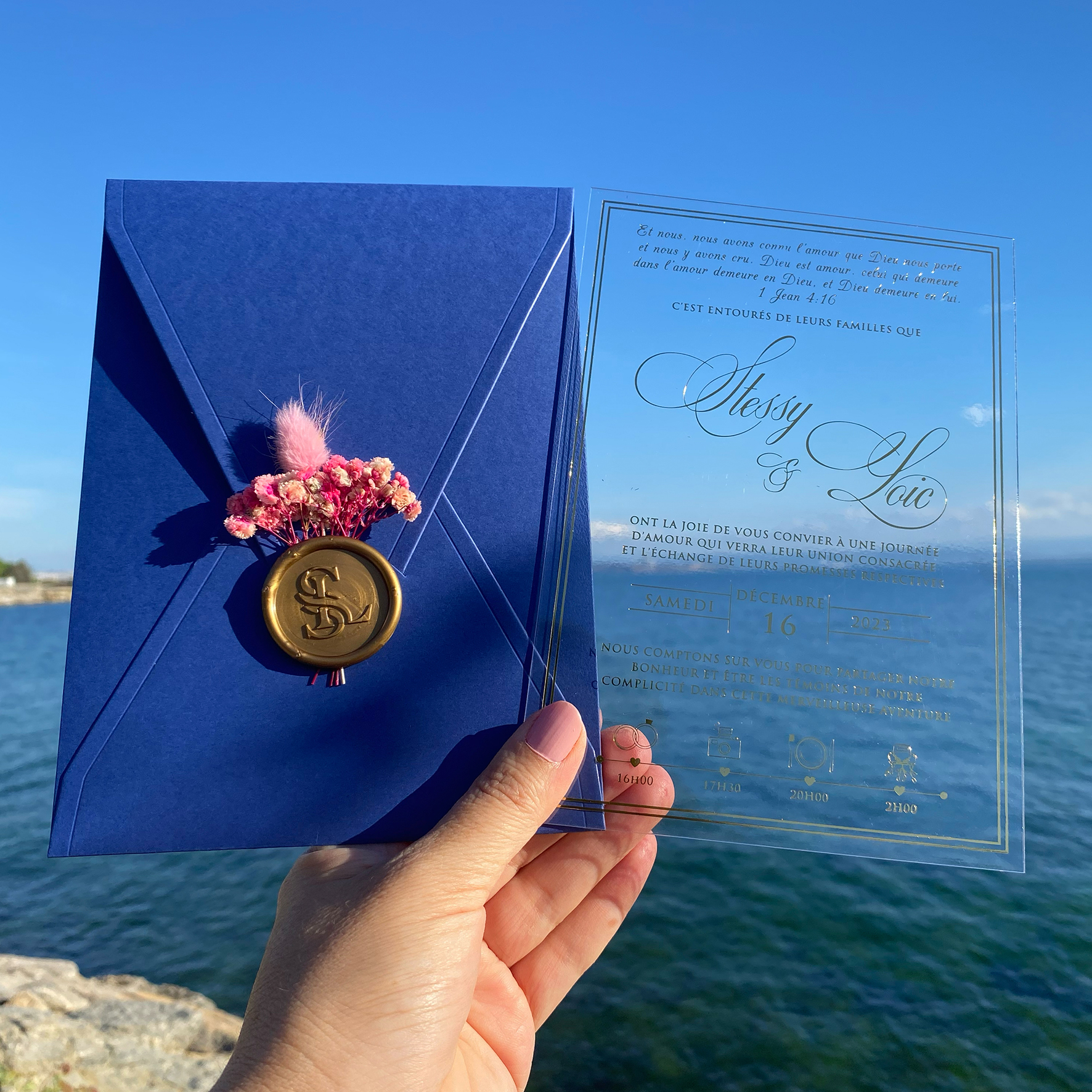 Acrylic wedding invitation. Gold foil print. Royal Blue envelope. Gold wax seal and dried flowers
