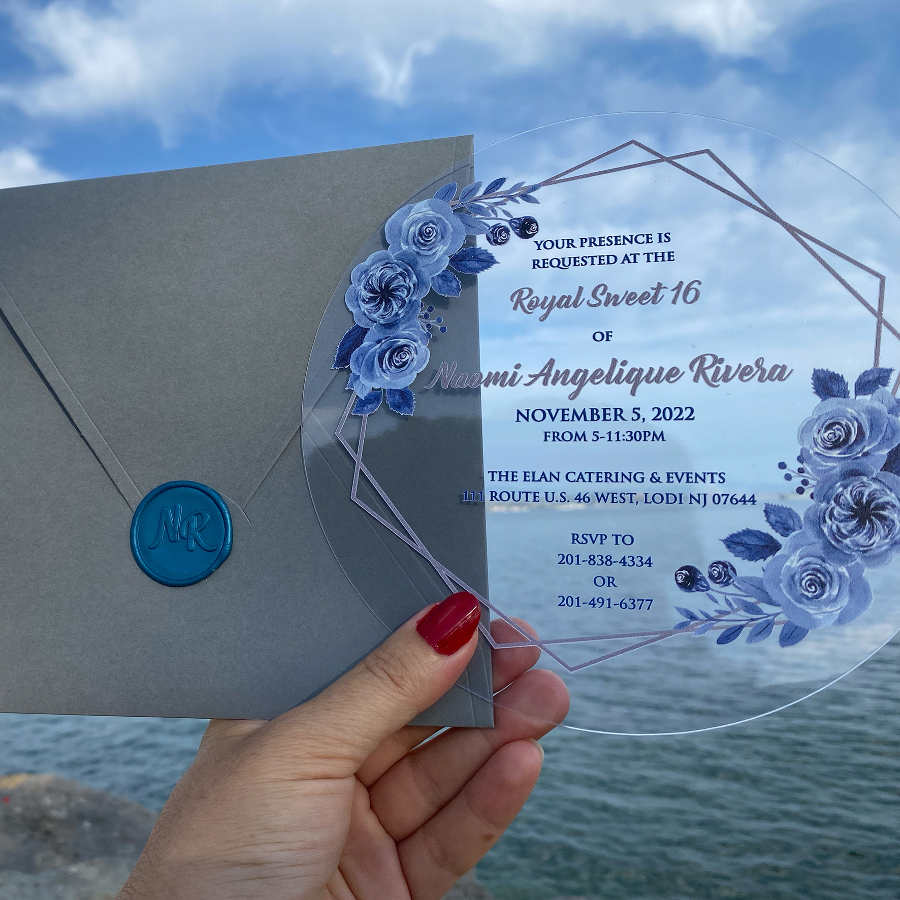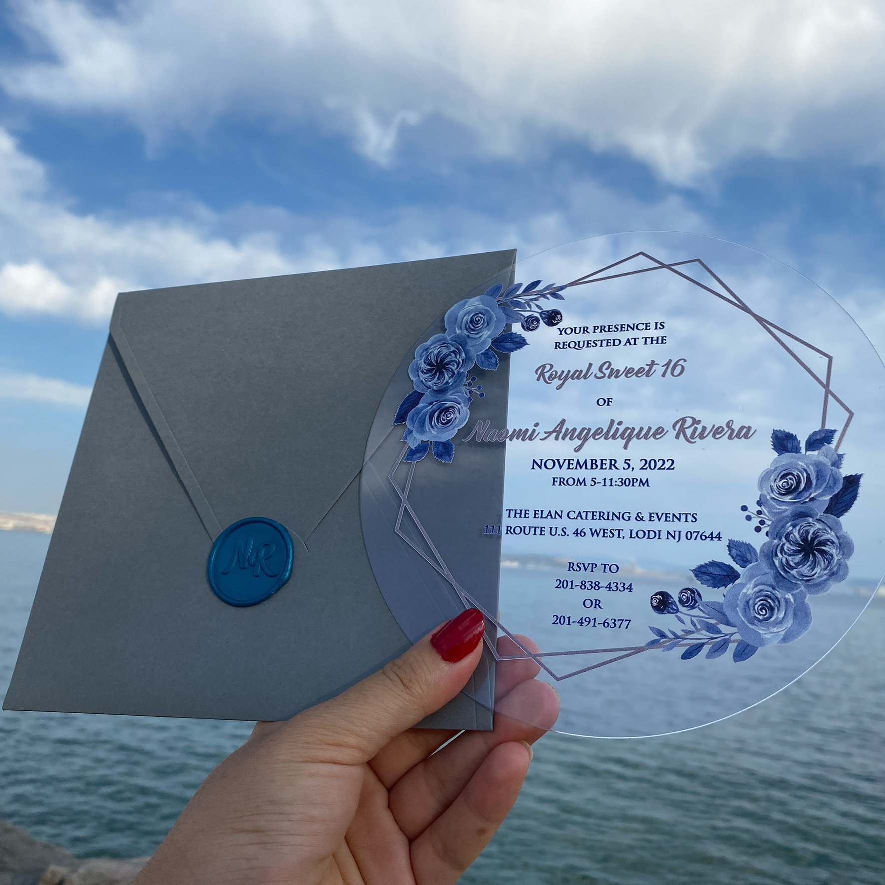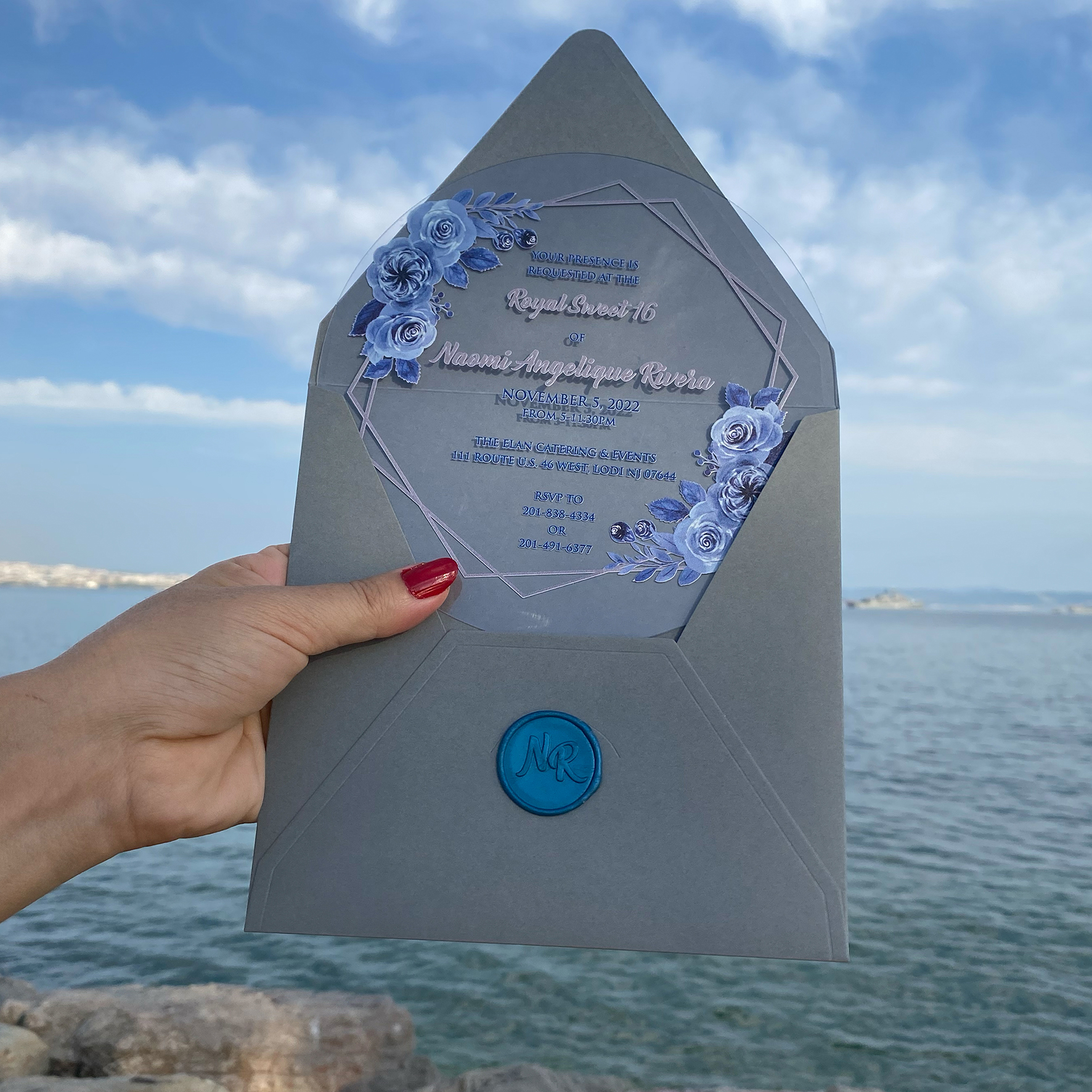 Acrylic Royal Sweet 16 invitation. Acrylic invitation card with blue flowers. Gray square envelope. Blue wax seal