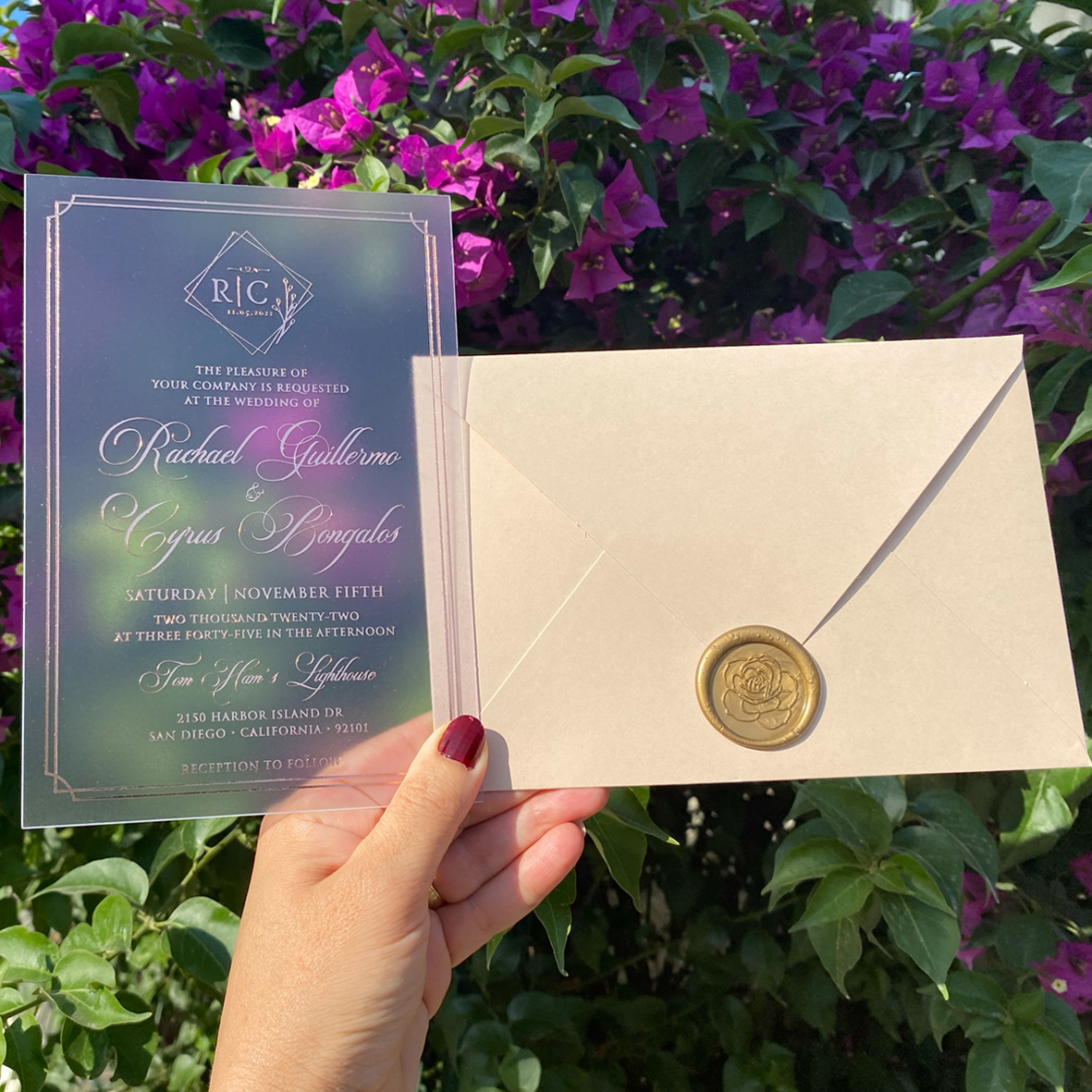 Gold foil printed 0.70 micron flexible acrylic invitation + Envelope + Wax seal