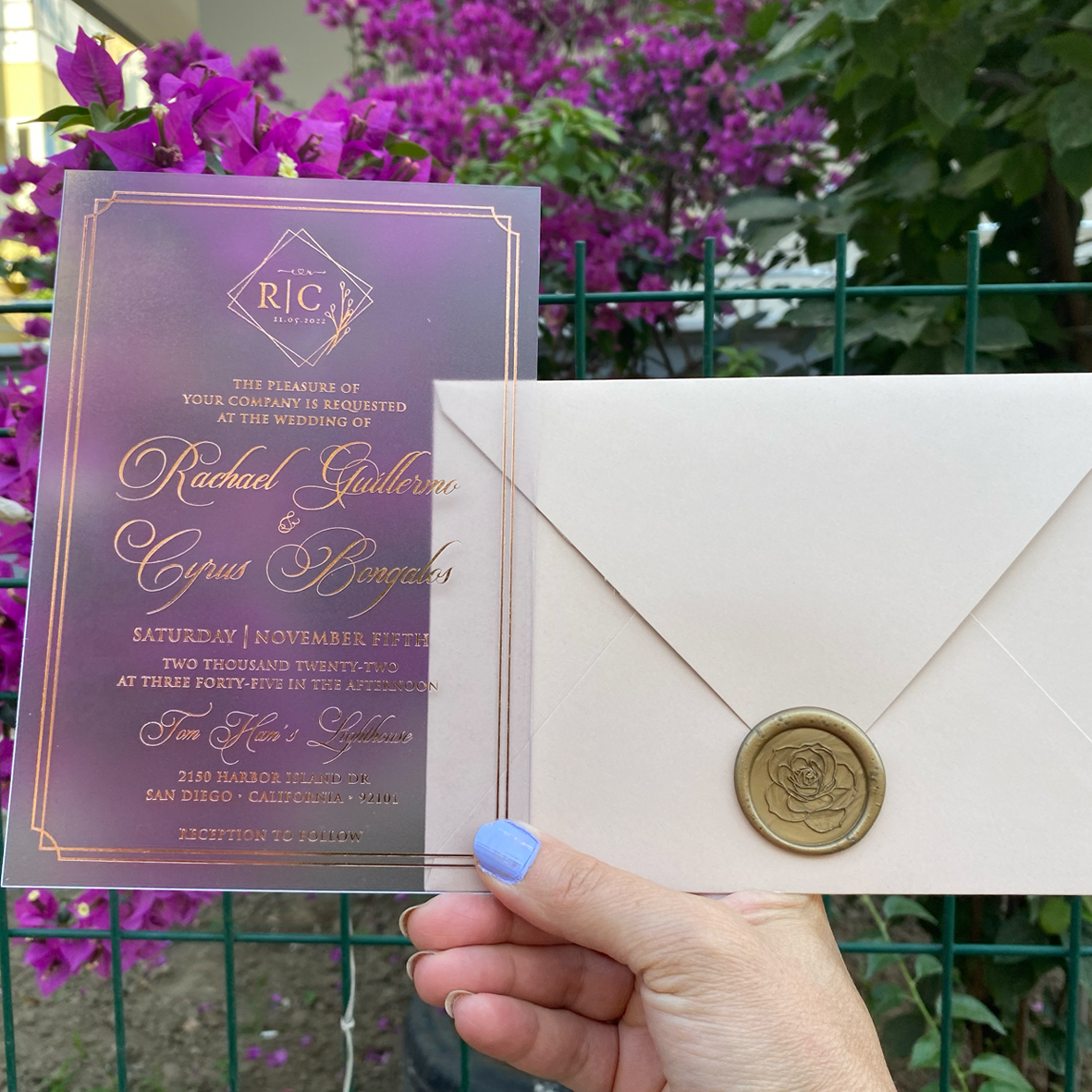 Frosted acrylic wedding invitation, Rose gold foil printing, Blush color envelope, Wax seal