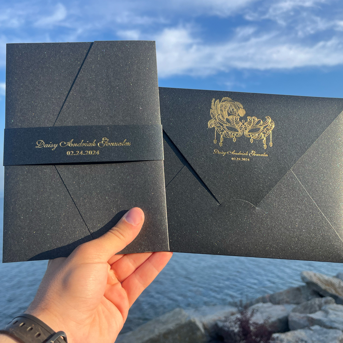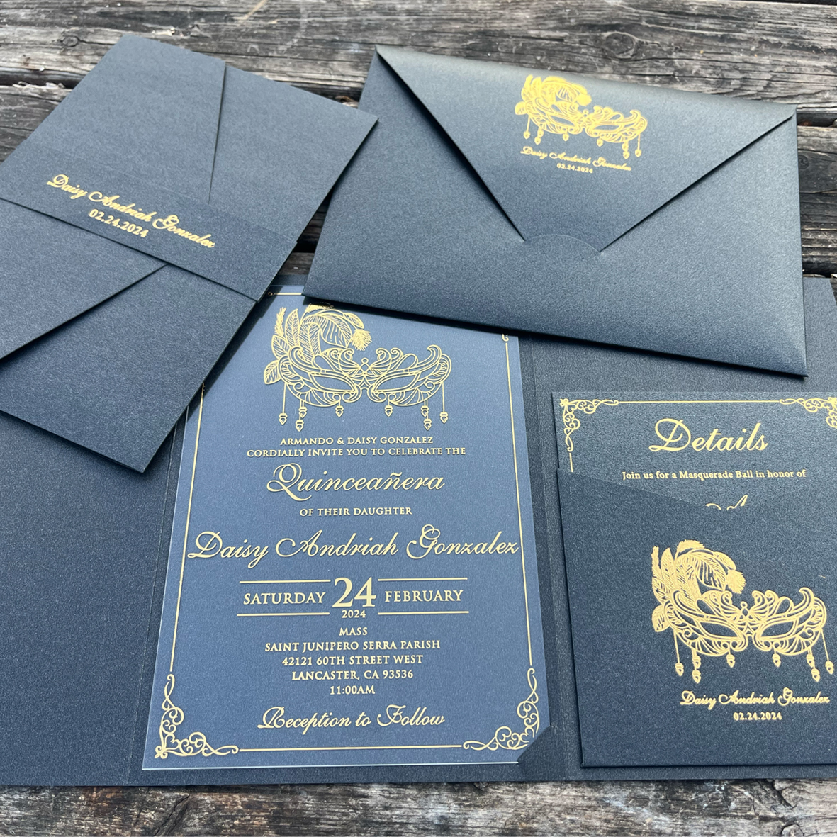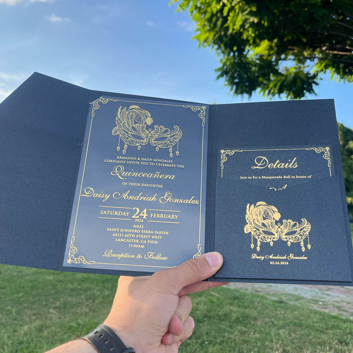 Masquerade themed invitation. Acrylic Quinceañera invitation, Gold foil print, Black pearlescent pocket envelope, Detail card, Mailing envelope