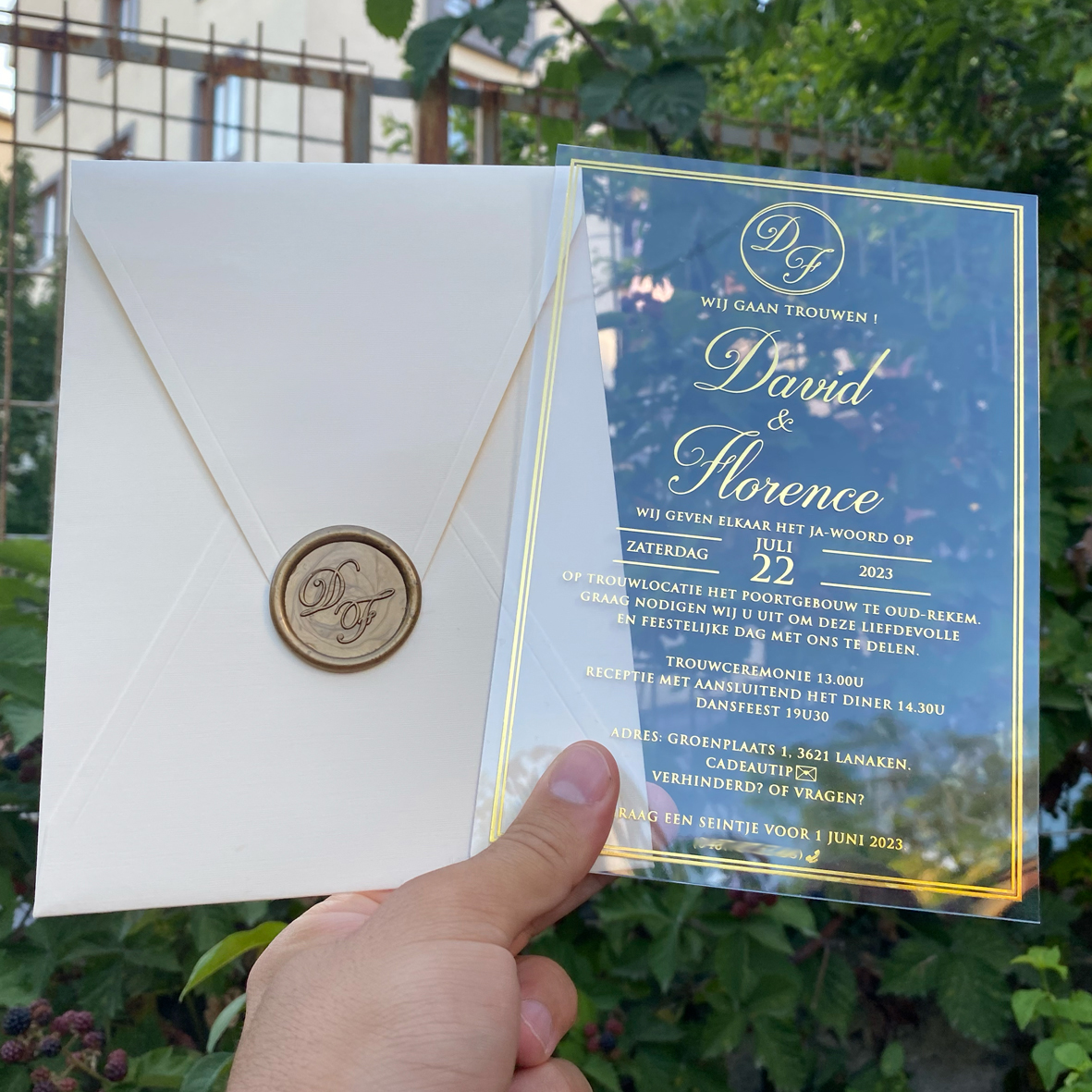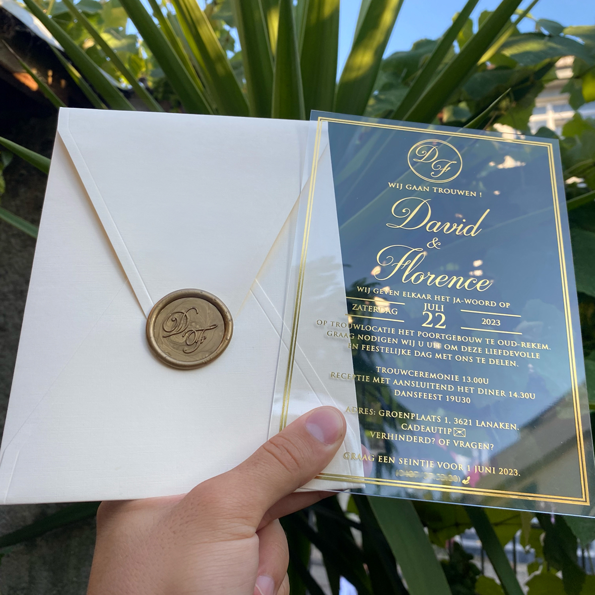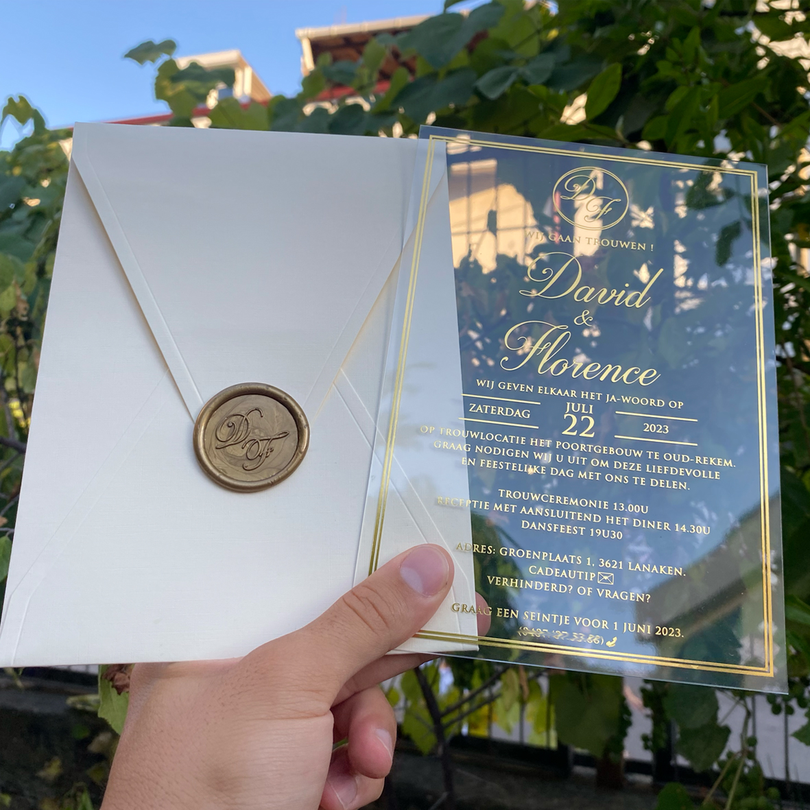 Acrylic Wedding invitation, Gold foil printing, Ivory envelope, Gold wax seal
