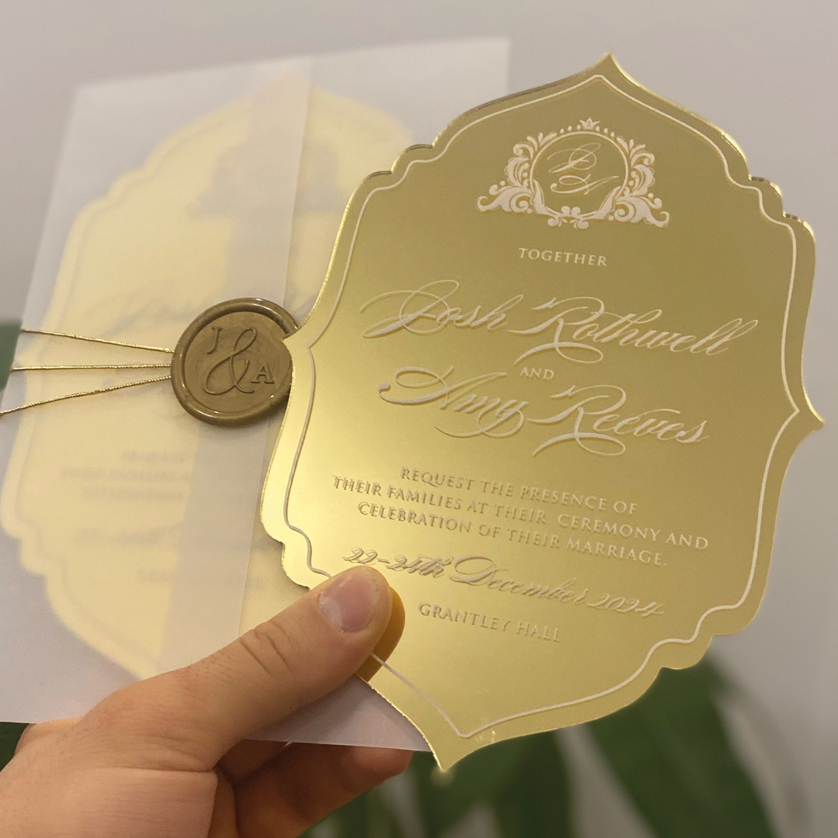 Custom Cut Gold Mirrored Invitation Card, Parchment Wrap, Gold Wax Seal and Dried Flowers