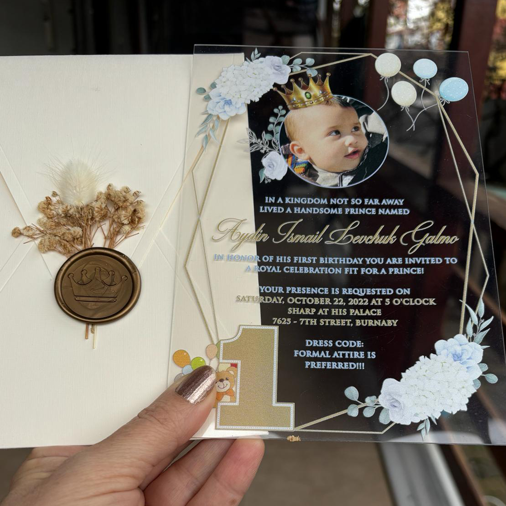Tags: Photo Acrylic Birthday Invitation. 1st birthday invitation, UV printing, Ivory envelope, Gold wax seal