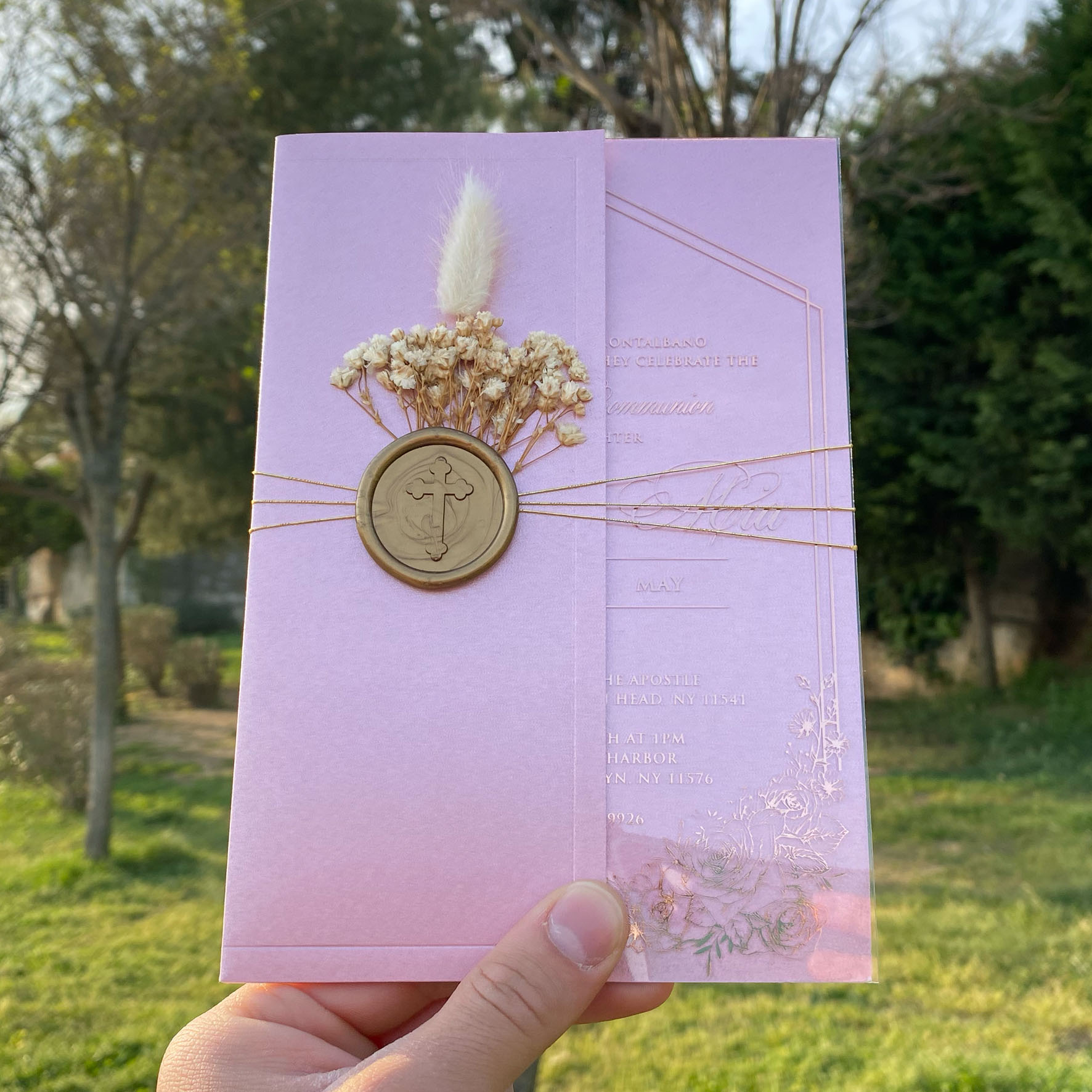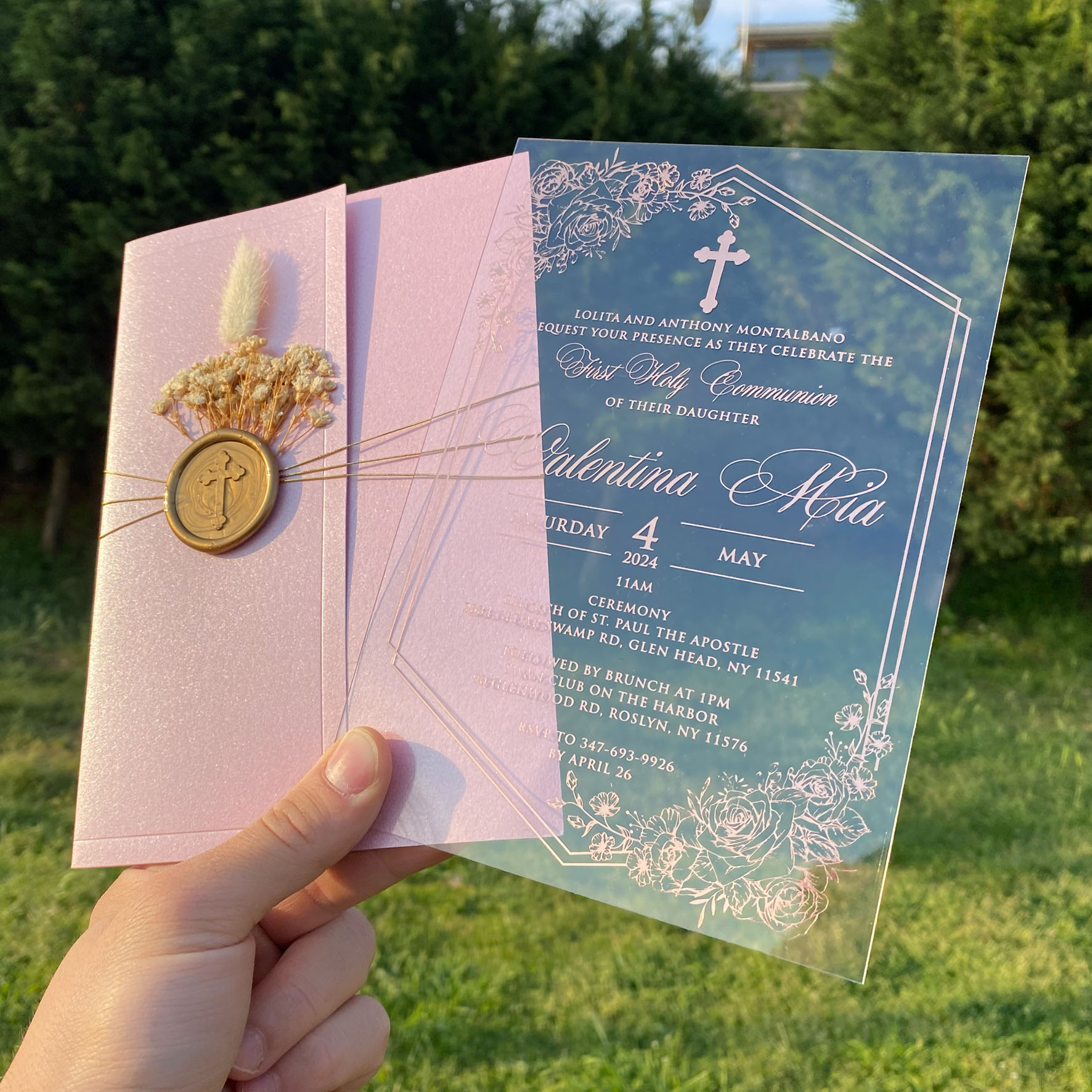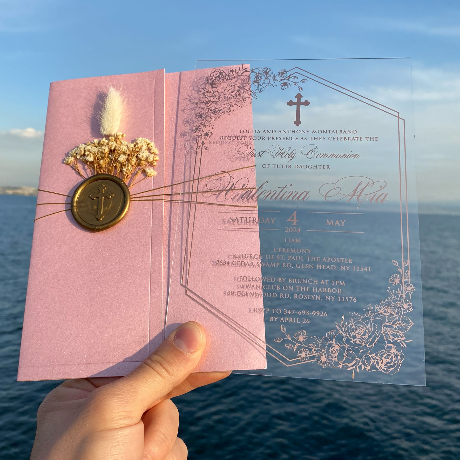First holy communion. Acrylic baptism invitation. Rose gold foil printing. Pink pearlescent half envelope. Wax seal and dried flowers.