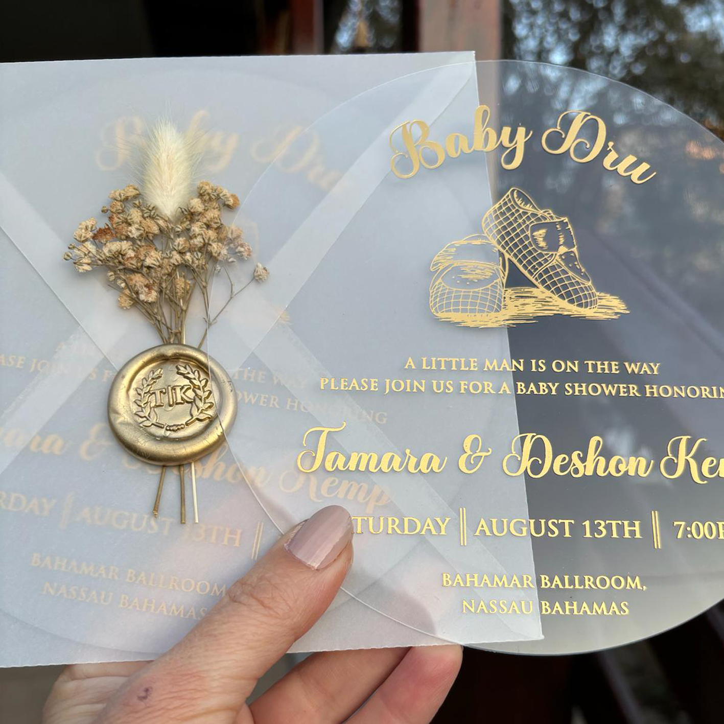Baby Shower invitation, Acrylic Baby Shower invitation, Gold foil printing, Parchment envelope, Gold wax seal and dried flowers.