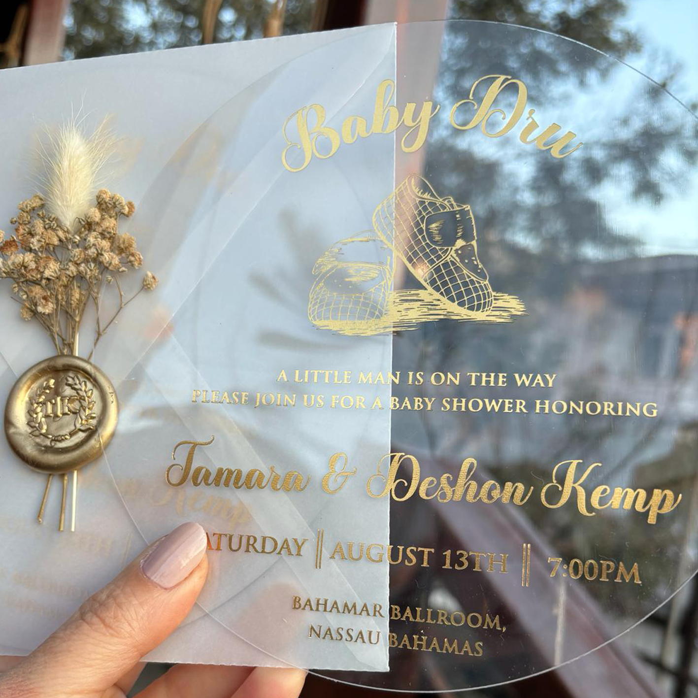 Tags: Baby Shower invitation, Acrylic Baby Shower invitation, Gold foil printing, Parchment envelope, Gold wax seal and dried flowers.