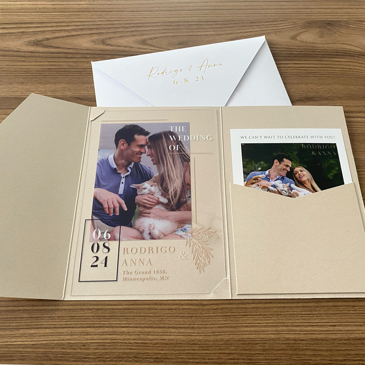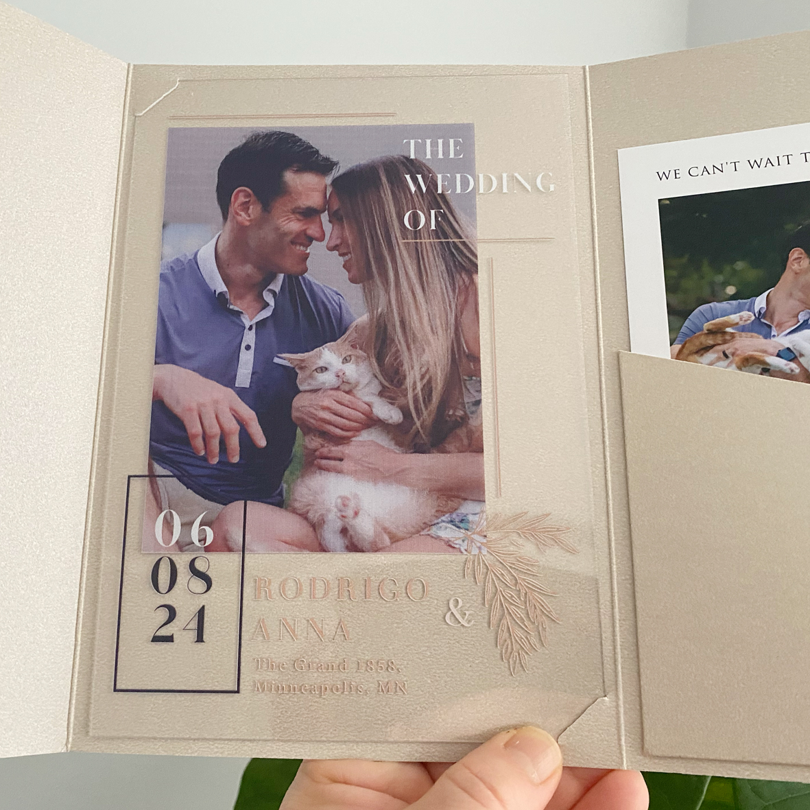 Save The Sate. Photo printed acrylic wedding invitation, Blush color envelope with pocket, Photo printed detail card, Gold wax seal