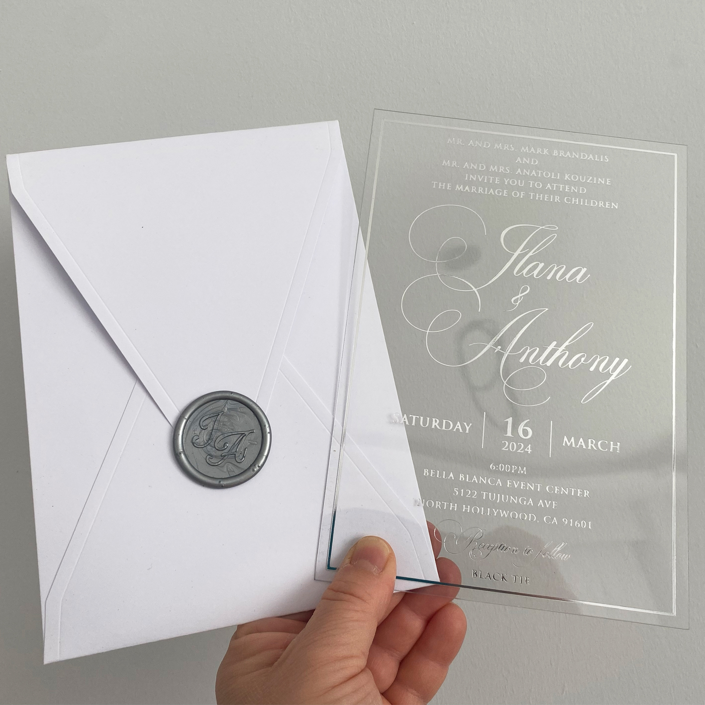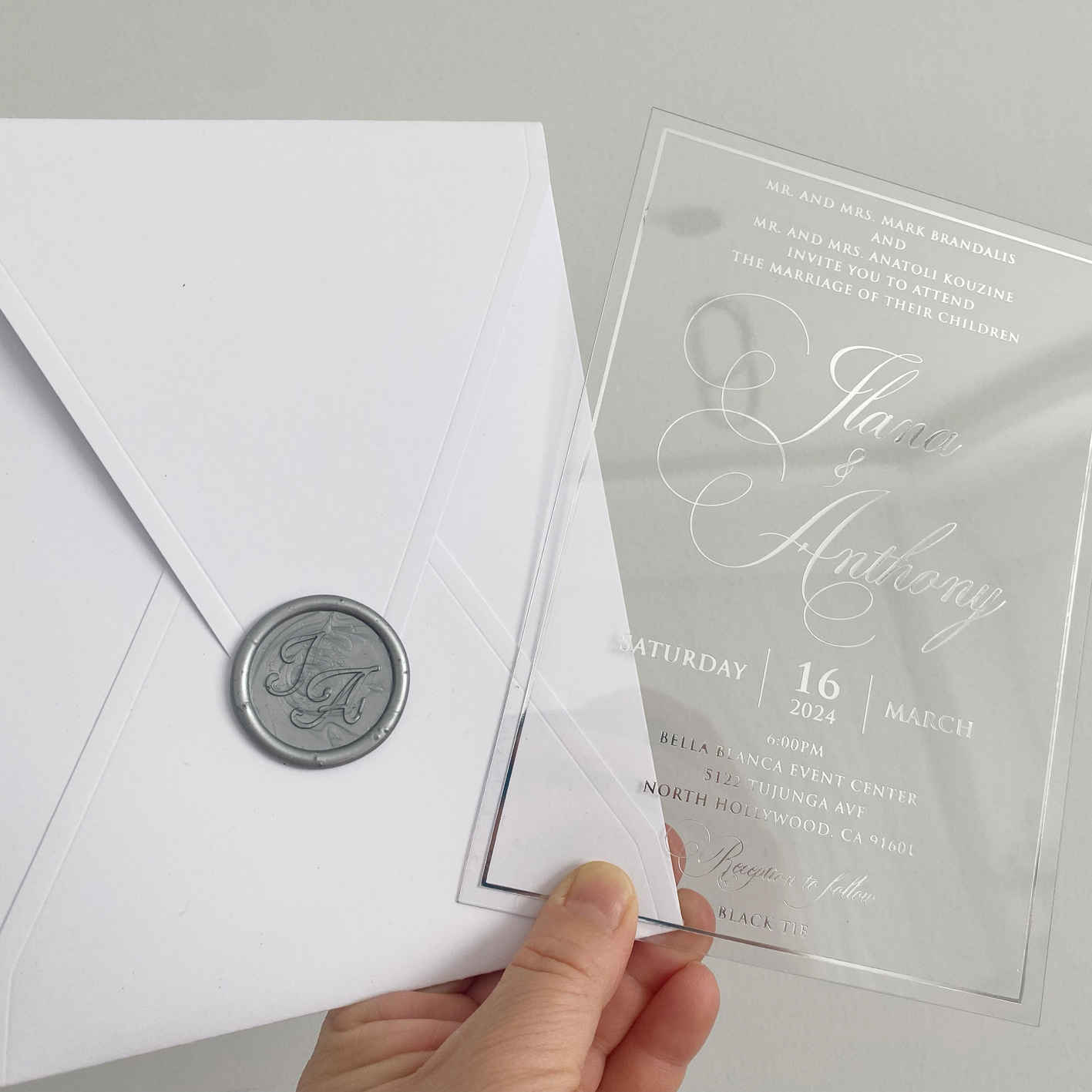Wedding Invitation, Clear Acrylic Wedding Invitation. White Envelope. Silver Foil Print. Silver Wax Seal