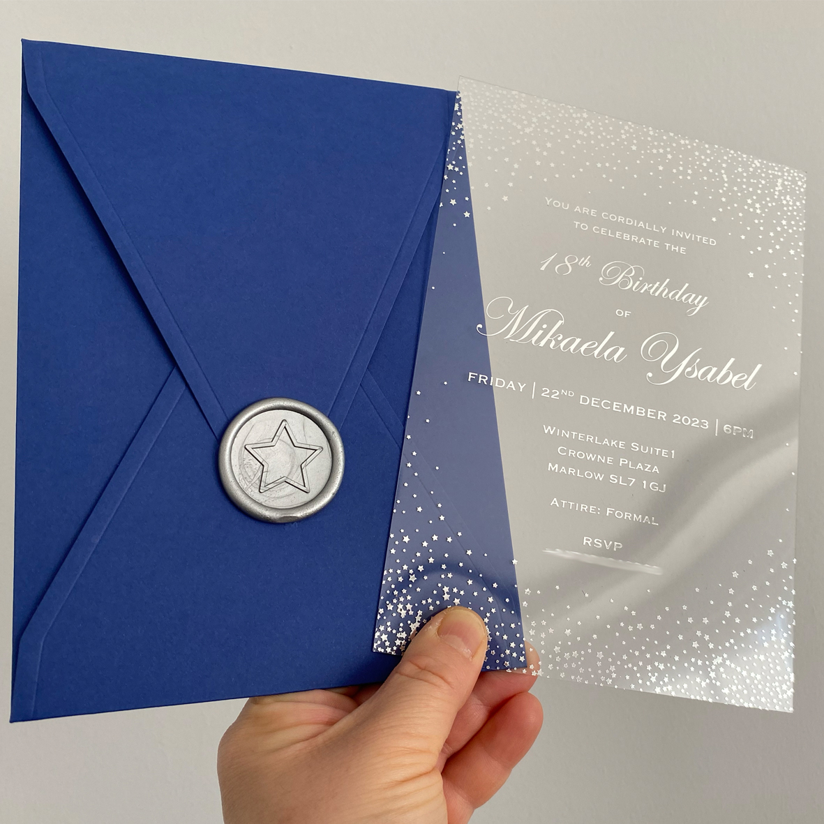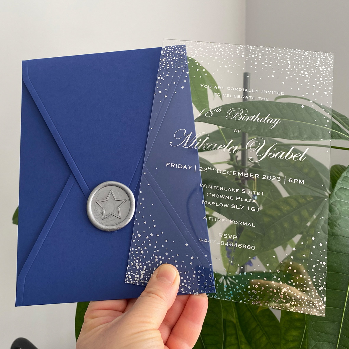 Tags: Starry night themed Birthday invitation, Quinceañera, Birthday invitation, Silver foil print, Royal blue envelope, Silver wax seal