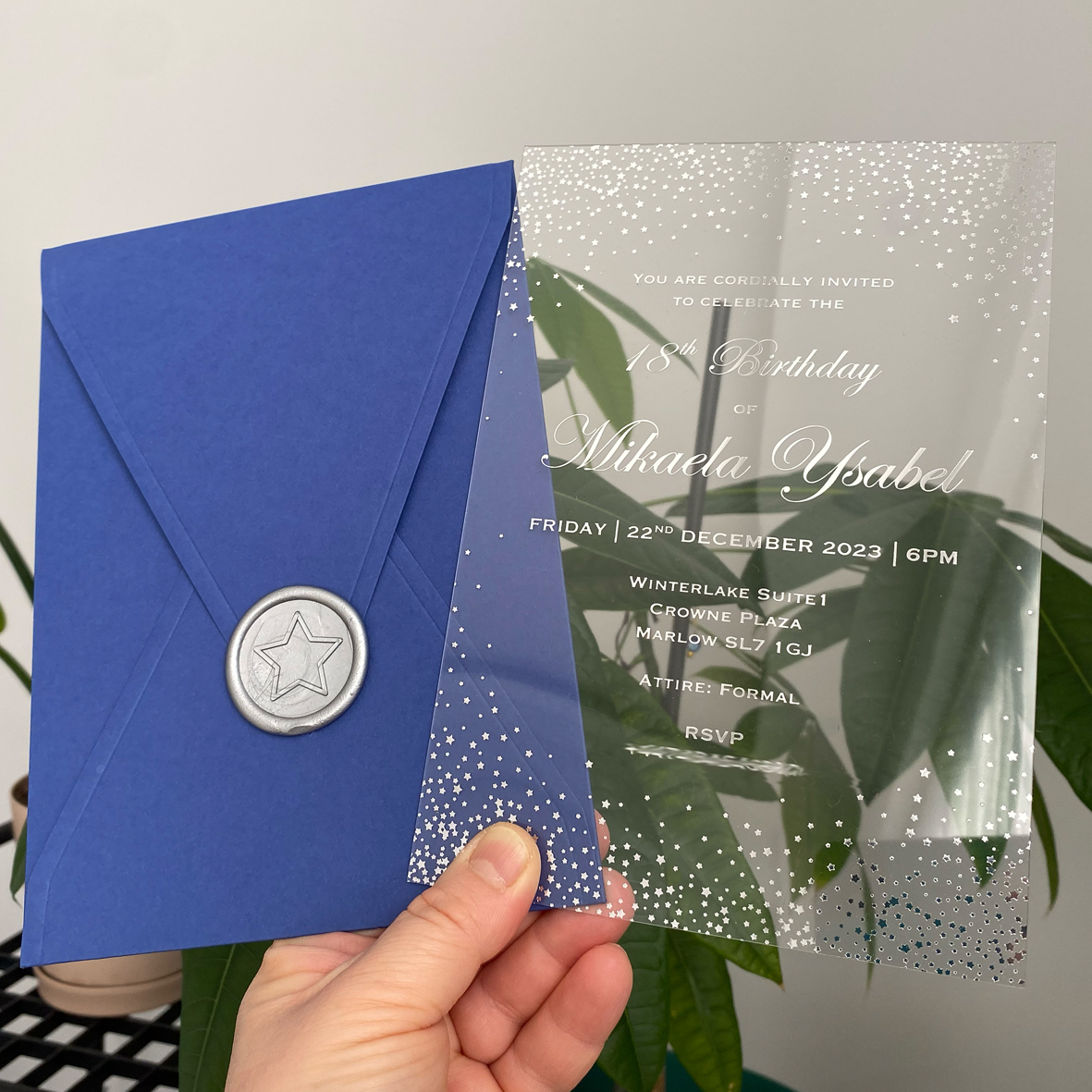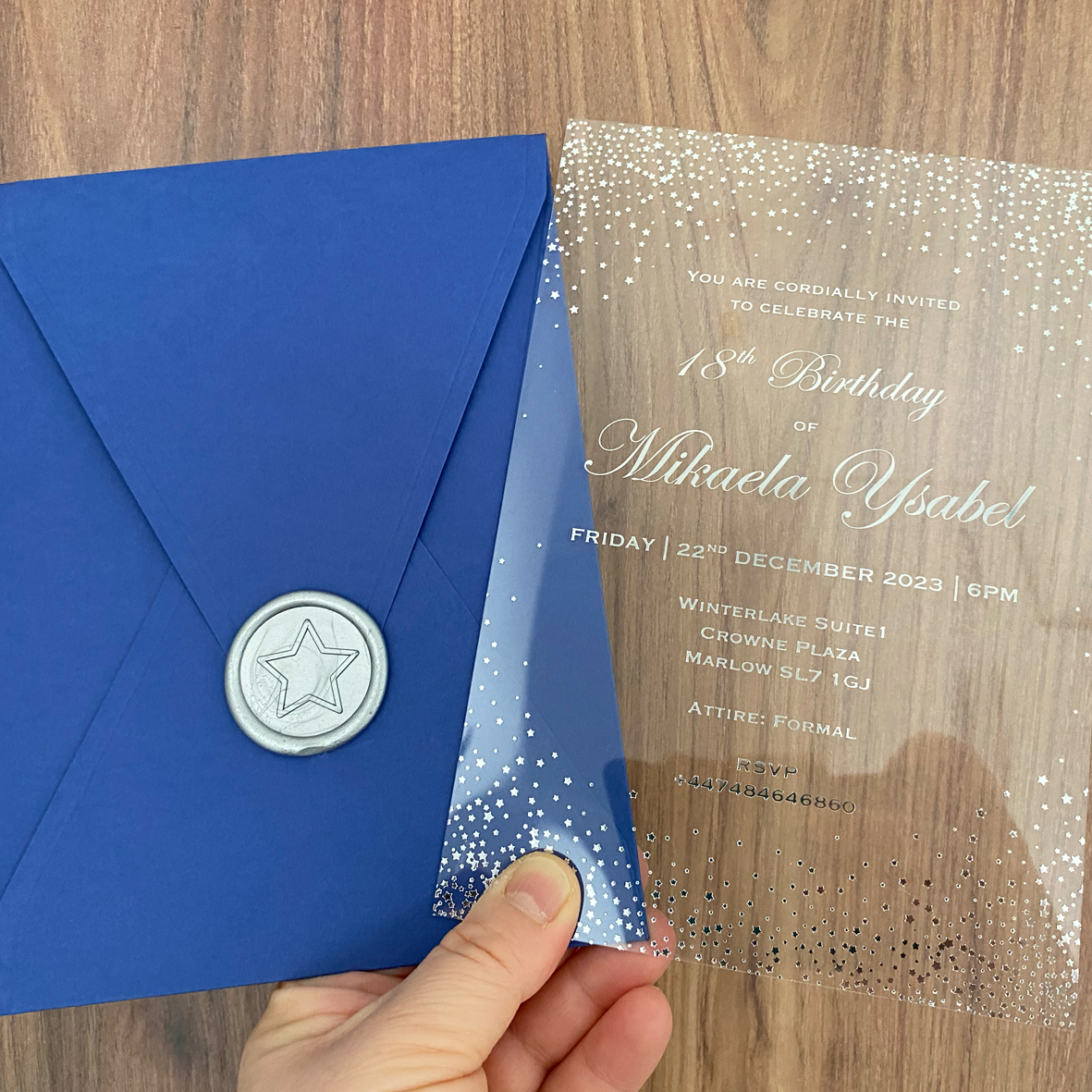 Starry night themed Birthday invitation, Quinceañera, Birthday invitation, Silver foil print, Royal blue envelope, Silver wax seal