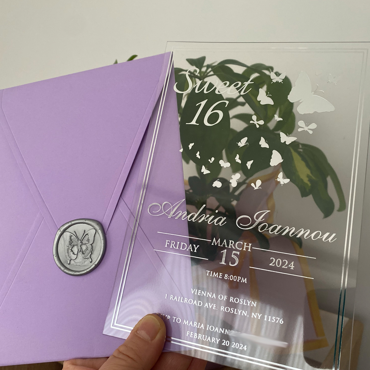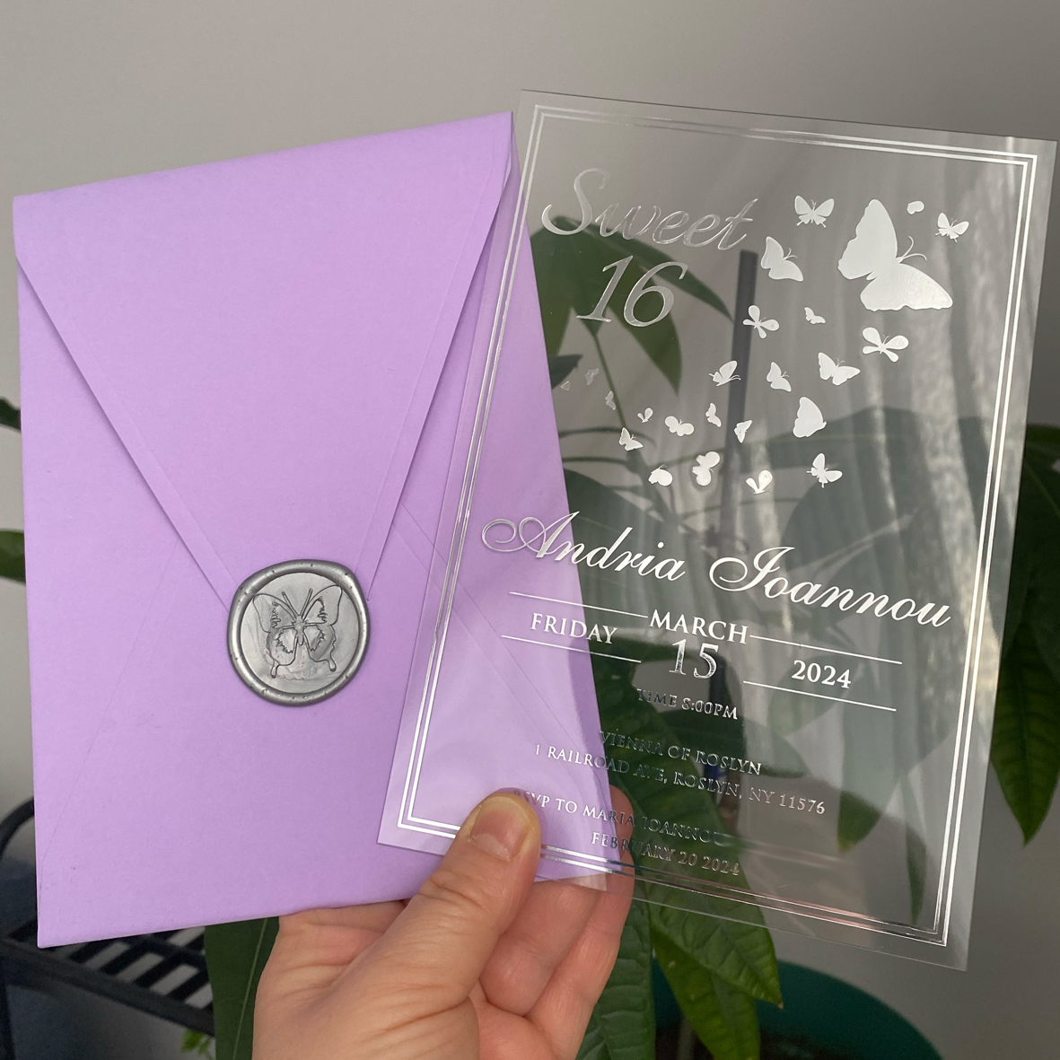 Color printed 0.70 micron flexible acrylic invitation + Envelope + Wax seal