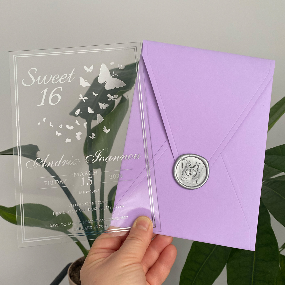 Sweet 16 invitation, Silver foil printed acrylic Sweet 16 invitation, Quinceañera invitation, Magenta envelope, Silver wax seal