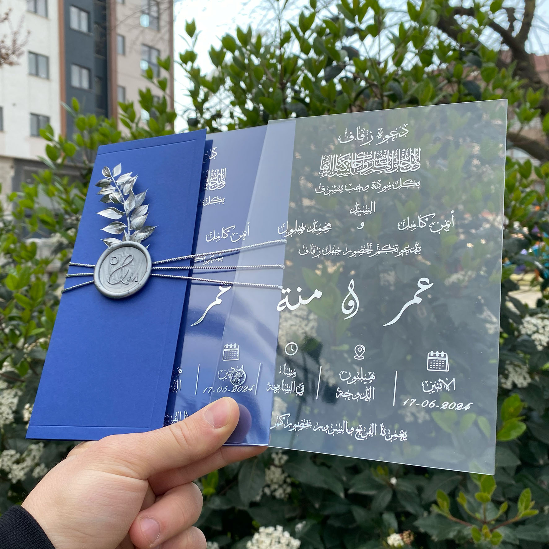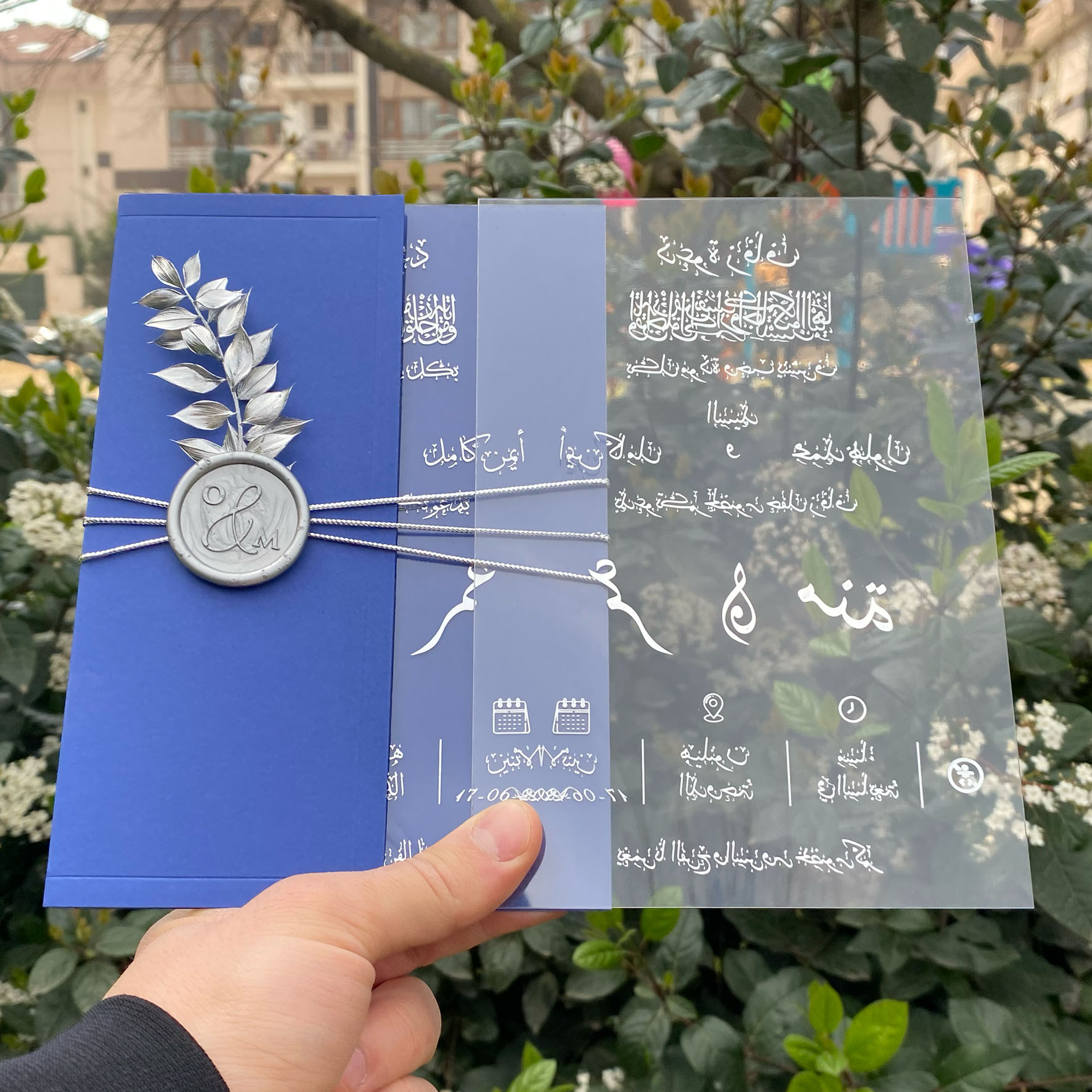 Tags: Wedding invitation, Acrylic wedding invitation, Gold foil printed acrylic wedding invitation, Royal blue half envelope, Gold wax seal and dried flowers.
