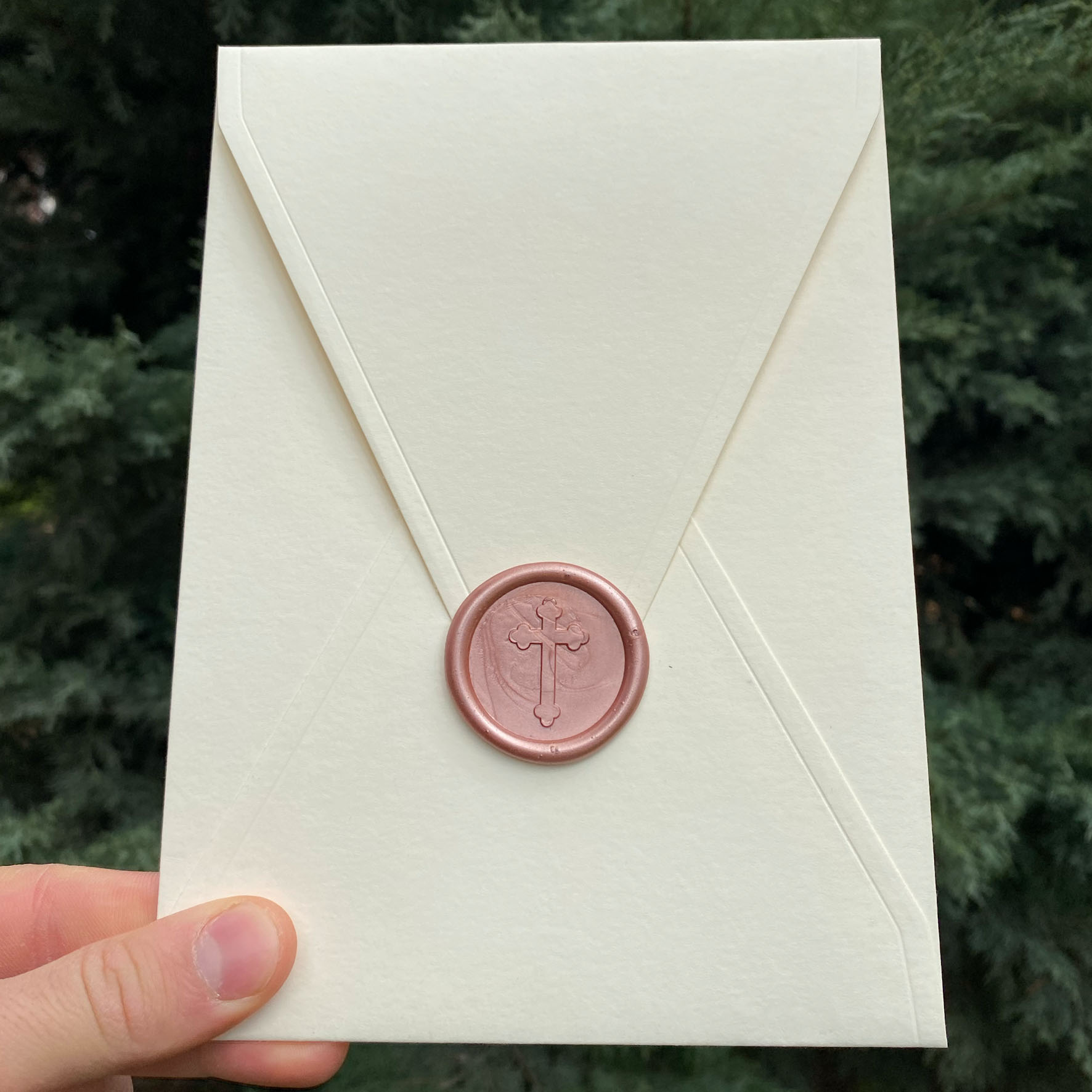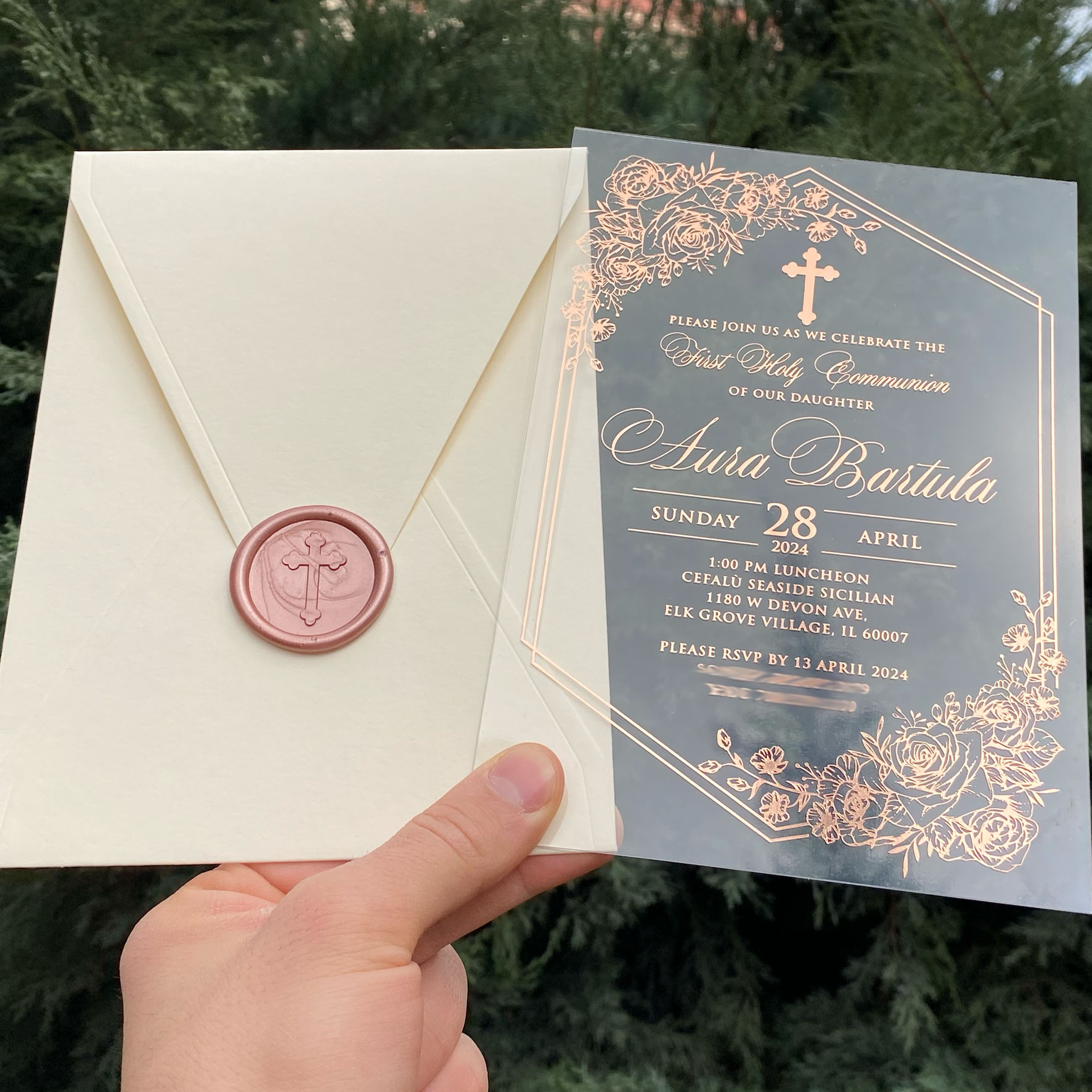 Tags: First holy community, Holy community, Christening invitation, Acrylic baptism invitation, Rose gold foil printing, Ivory envelope, Rose wax seal