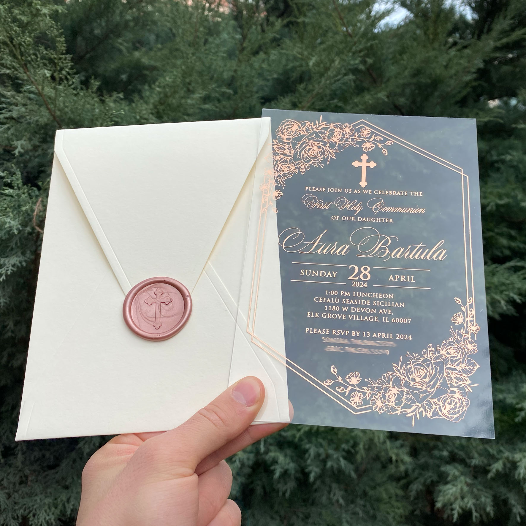 First holy community, Holy community, Christening invitation, Acrylic baptism invitation, Rose gold foil printing, Ivory envelope, Rose wax seal