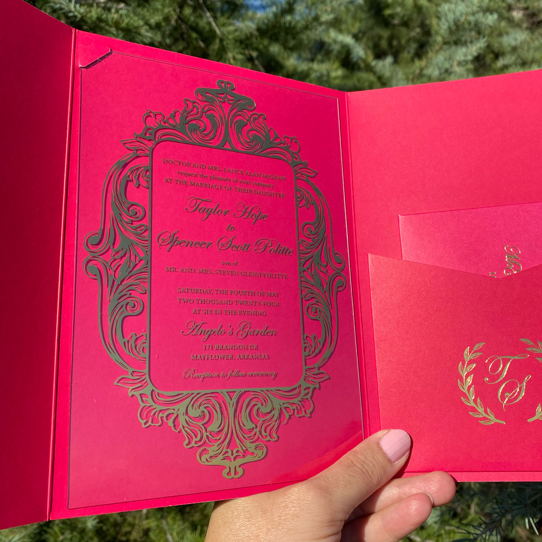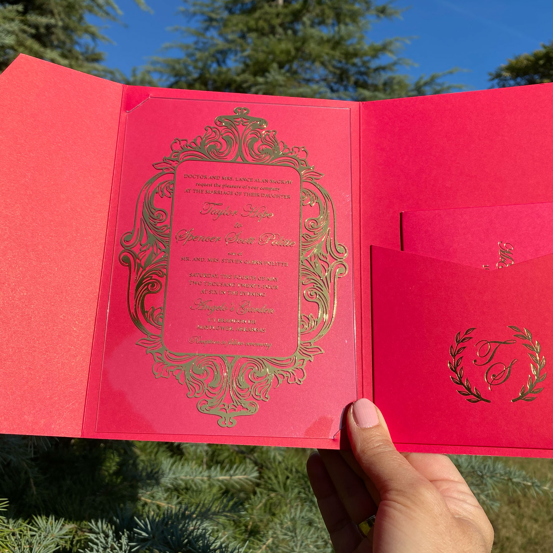 Gold foil printed acrylic invitation, Acrylic wedding invitation, Wedding invitation, Red pocket envelope, Gold wax seal, RSVP card and small return envelope, Mailing envelope.