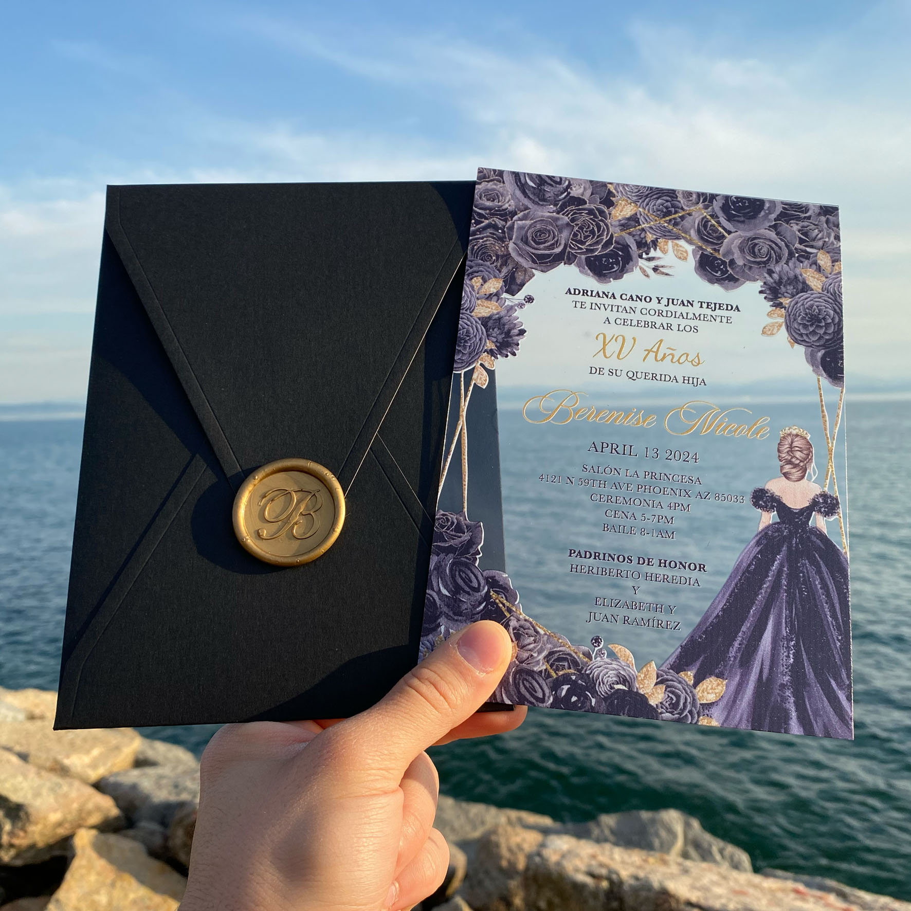 XV Anos invitation, Quince invitation, Princess invitation, Sweet Sixteen invitation, Quinceañera invitation, Birthday invitation, UV print, Black envelope, Gold wax seal