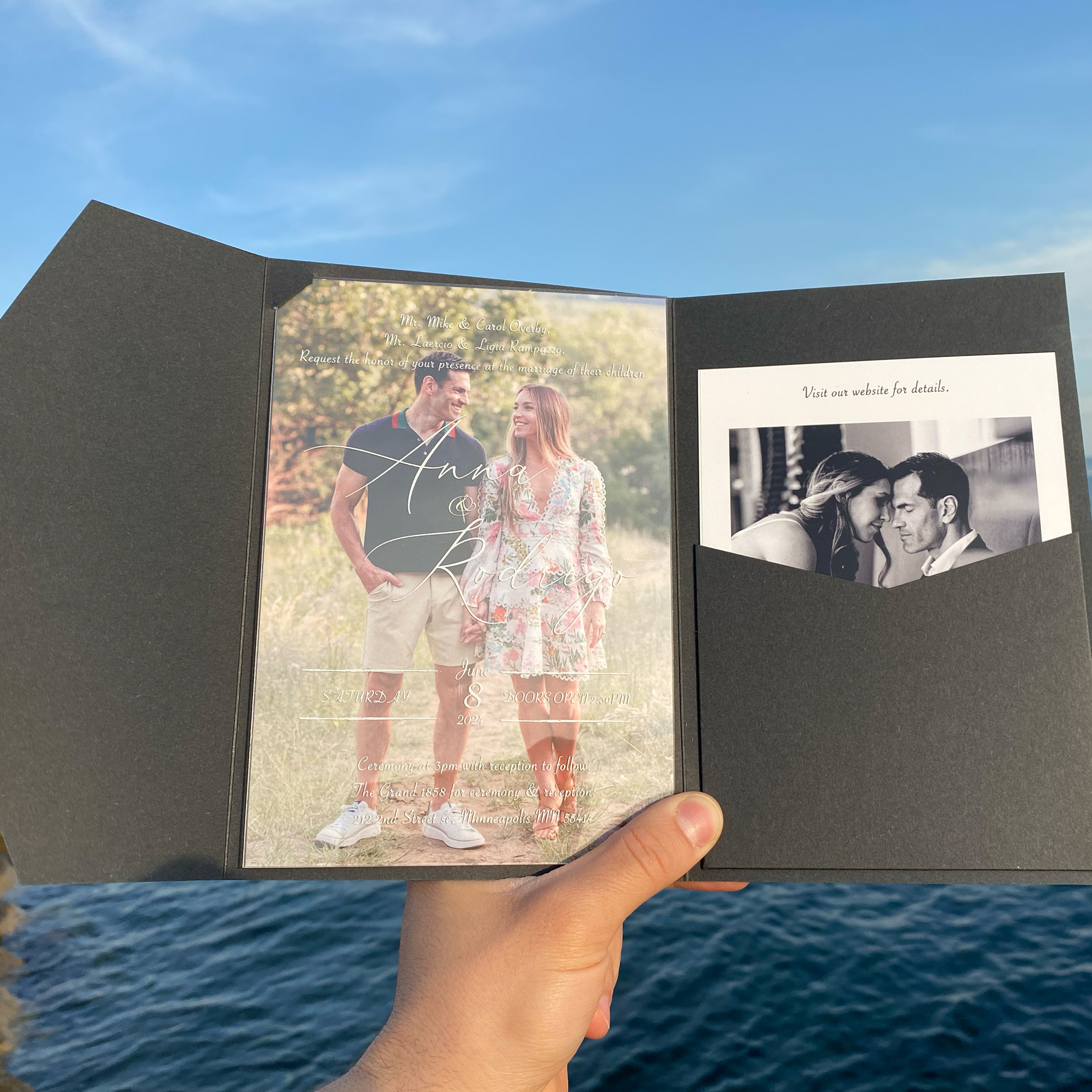 Acrylic wedding invitation, Wedding invitation with photo card, Invitation with photo, Wedding invitation, Black pocket envelope, Detail card