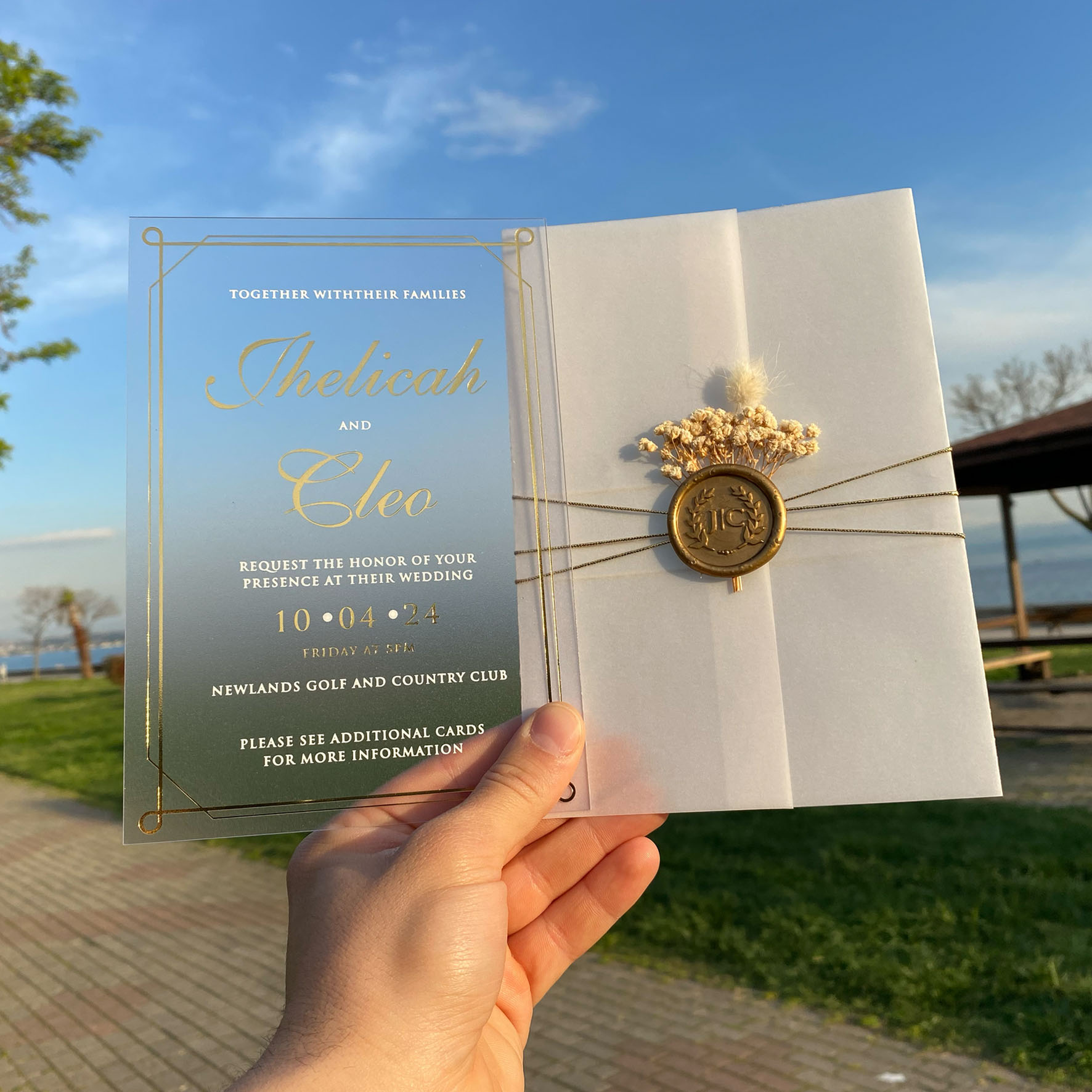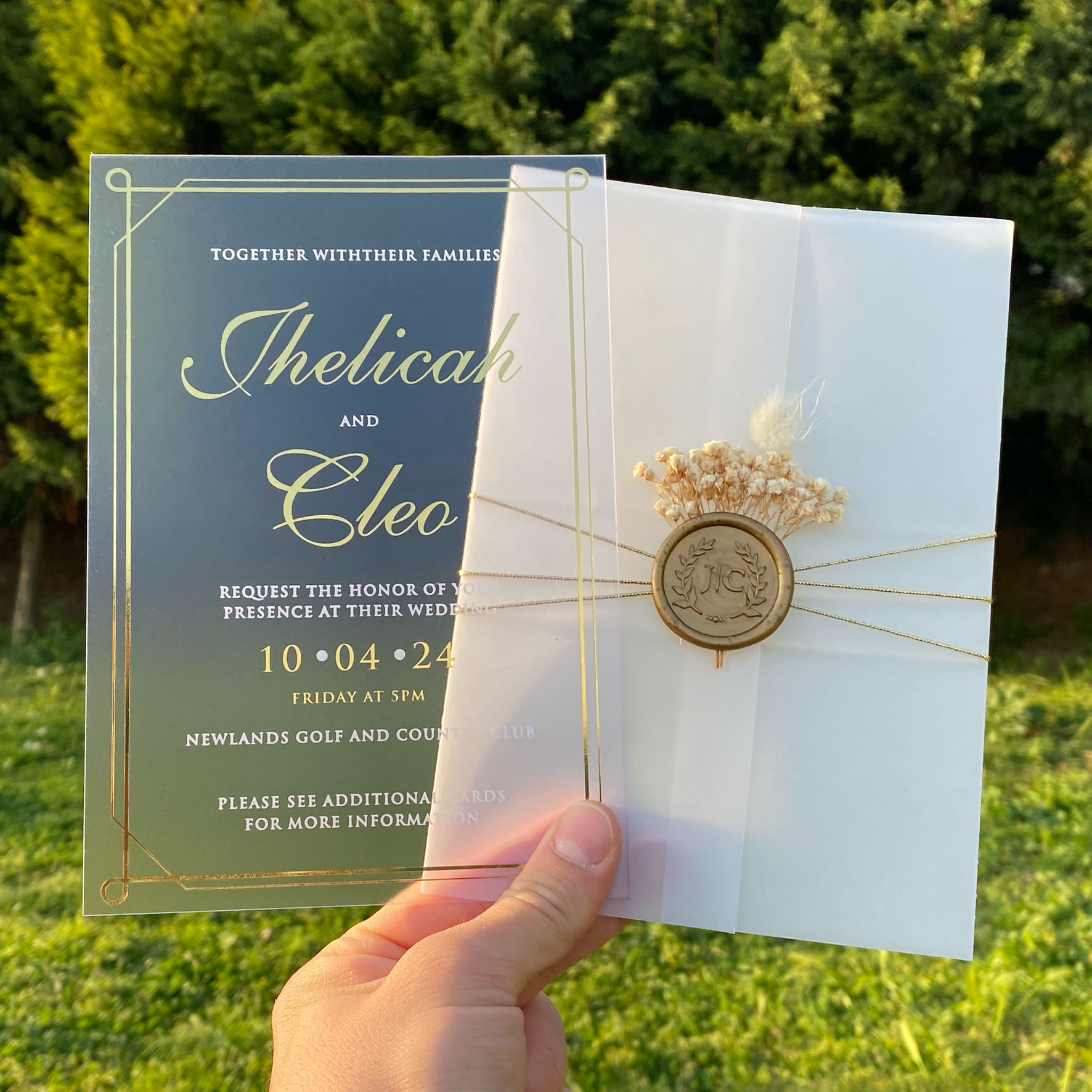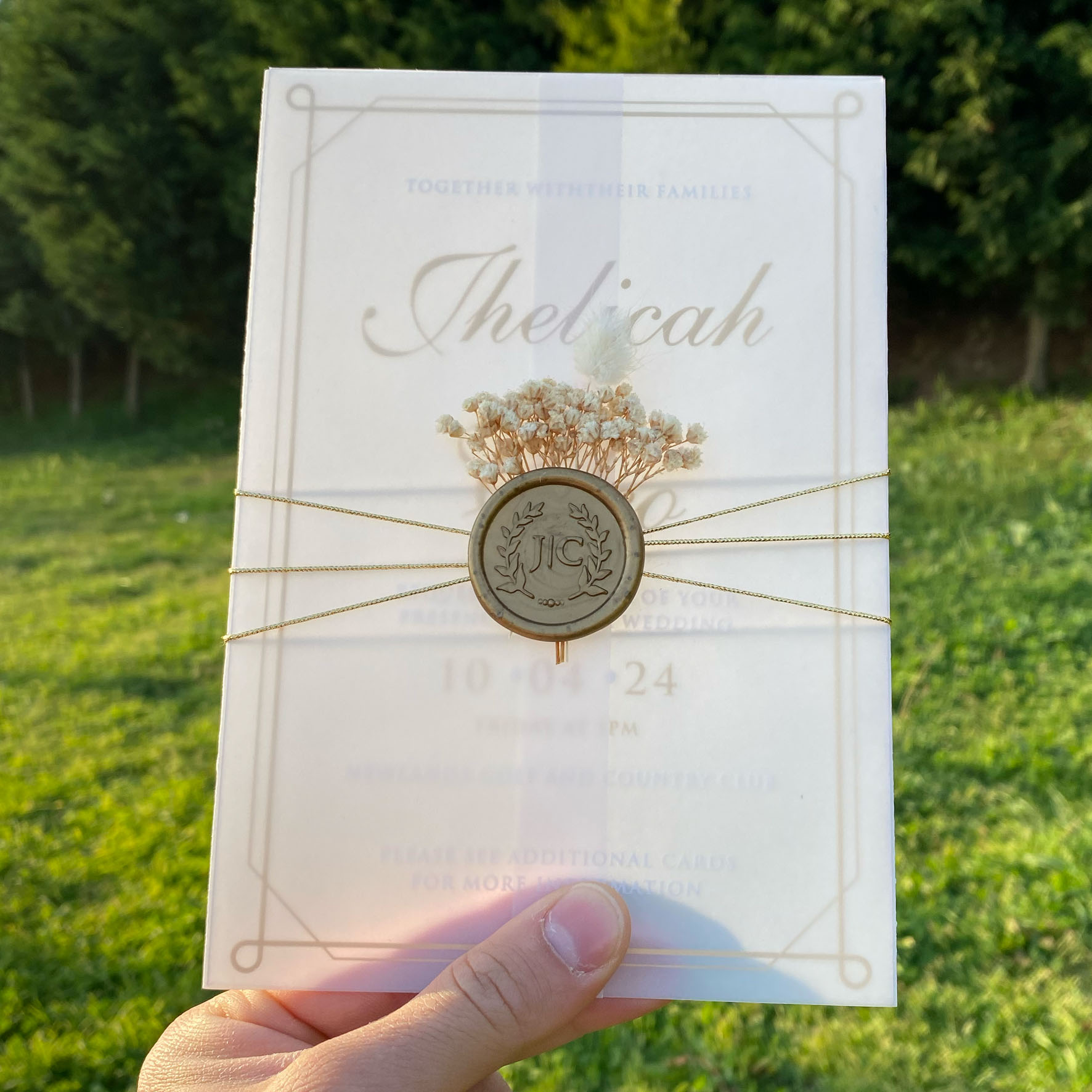 Frosted acrylic invitation, Acrylic wedding invitation, Wedding invitation, Parchment shirt, Golden wax seal and dried flowers