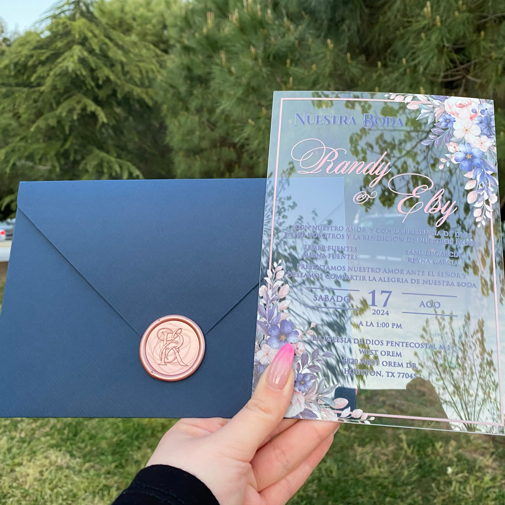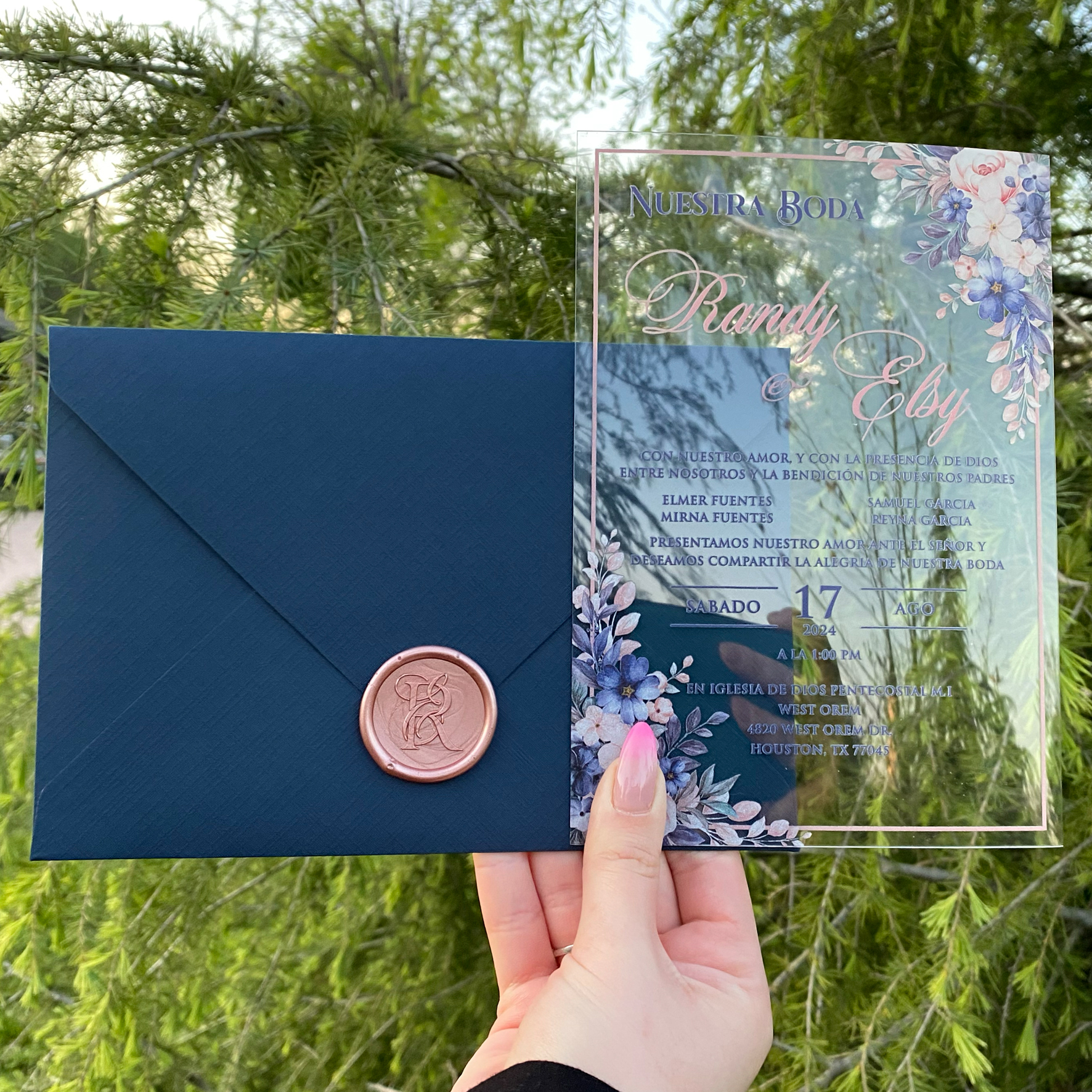 Tags: Floral wedding invitation, Blue floral invitation, Floral acrylic invitation wedding invitation, Navy blue envelope, UV print, Rose wax seal