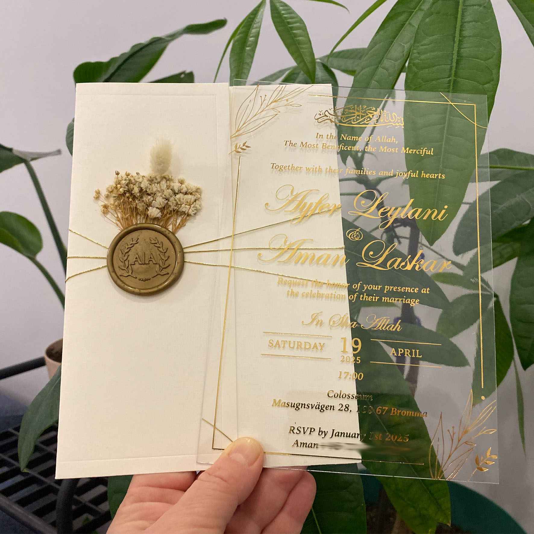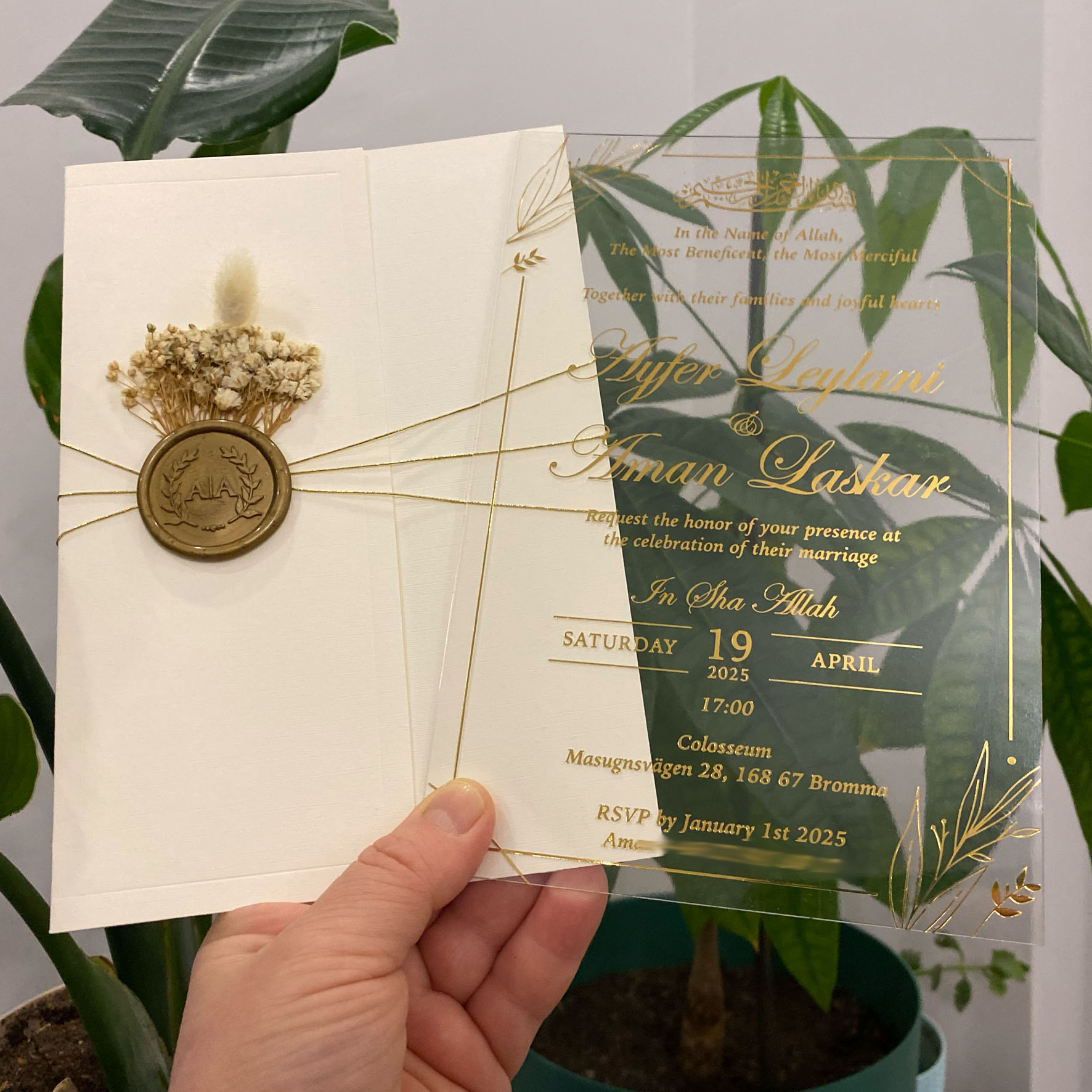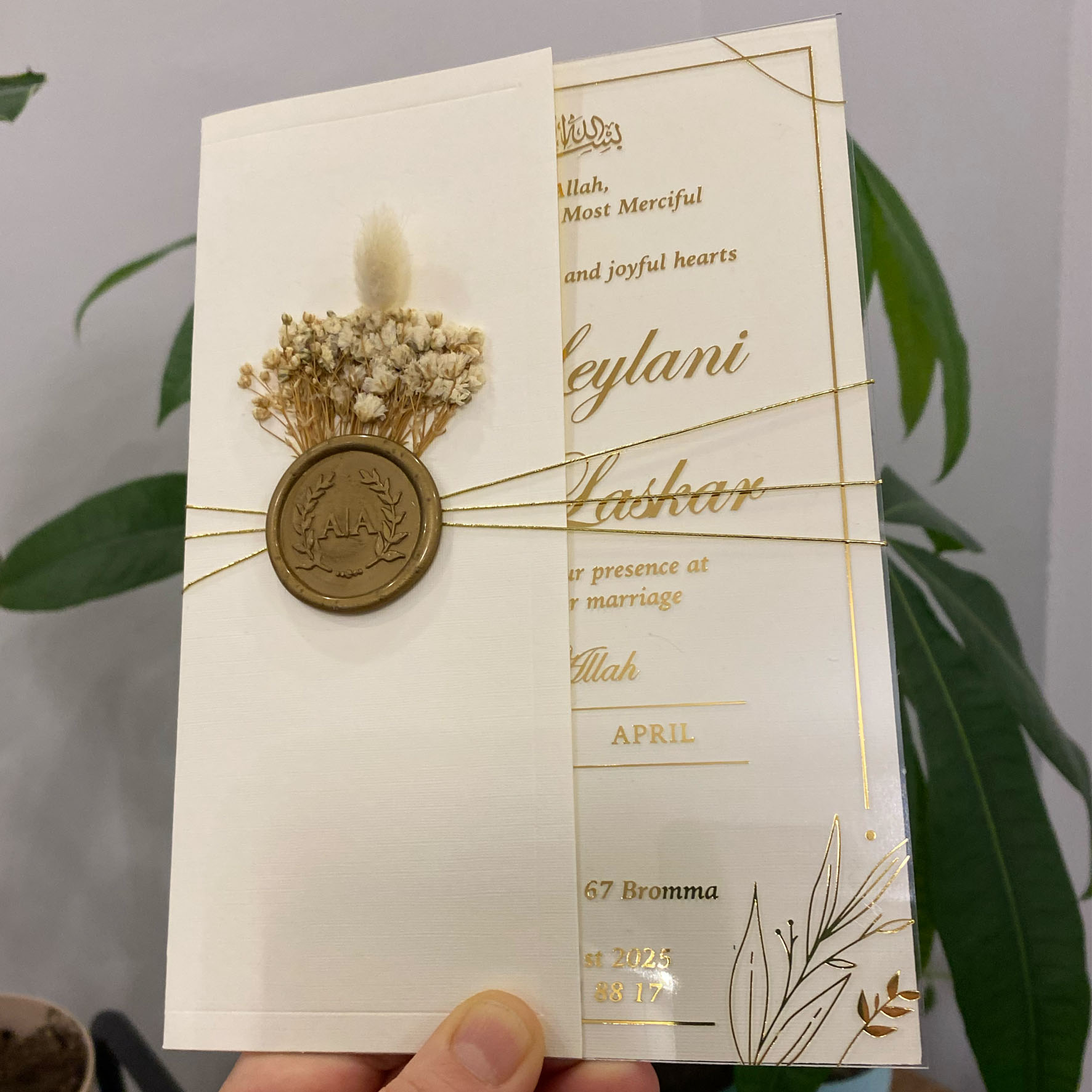 Acrylic wedding invitation, Wedding invitation, Gold foil printed invitation, Ivory half envelope, Gold wax seal and dried flowers. Ivory mailing envelope.