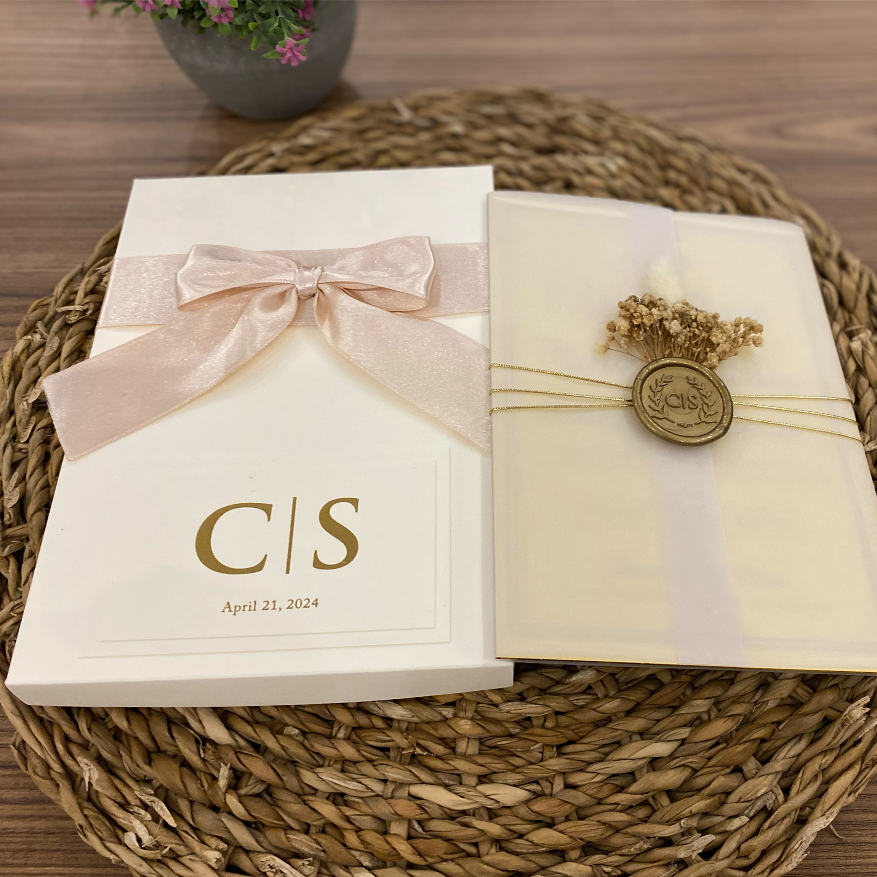 Gold Mirrored Plexiglass Invitation. White Print. Ivory Box With Gold Foil Print And Ribbon. Parchment Shirt. Wax Seal And Dried Flowers