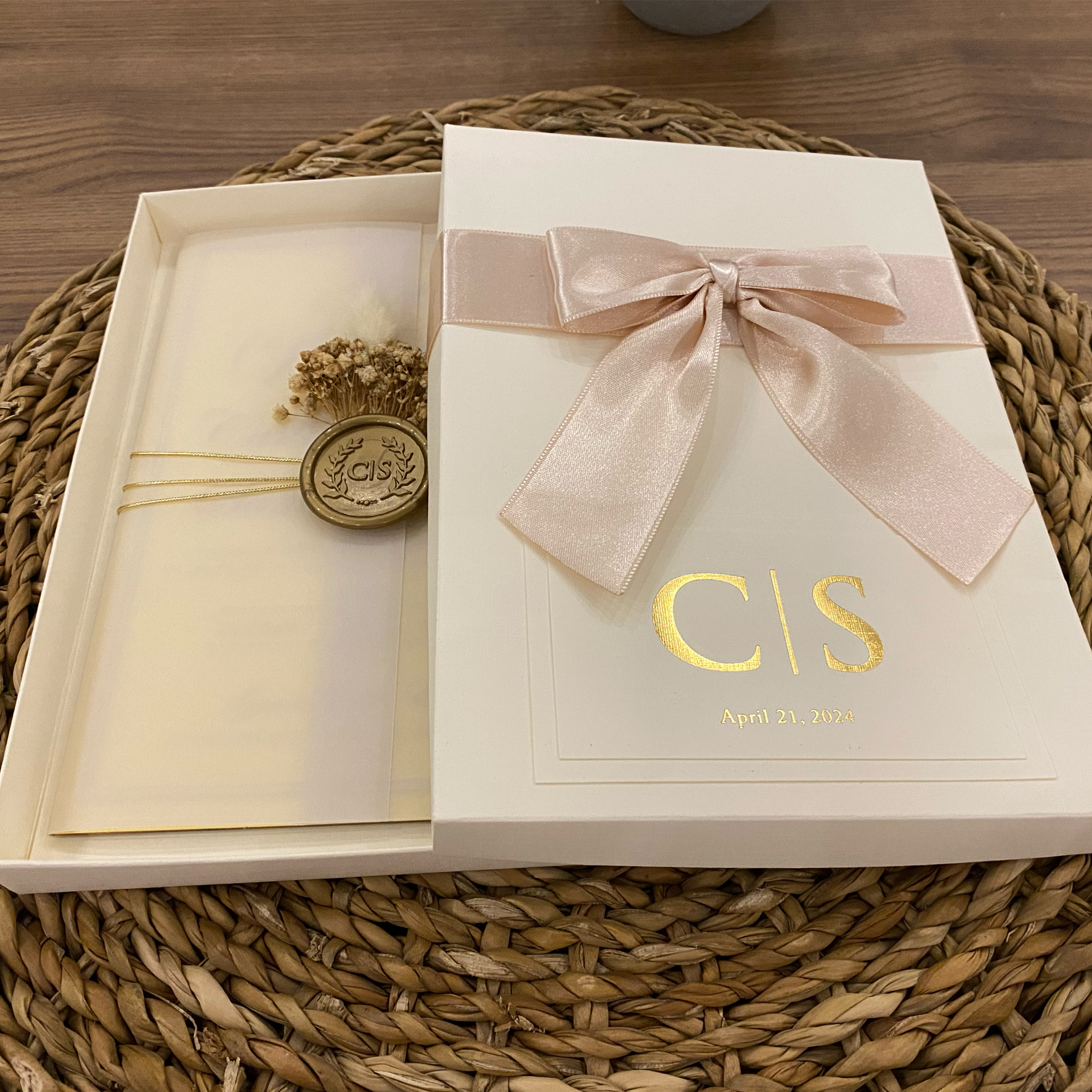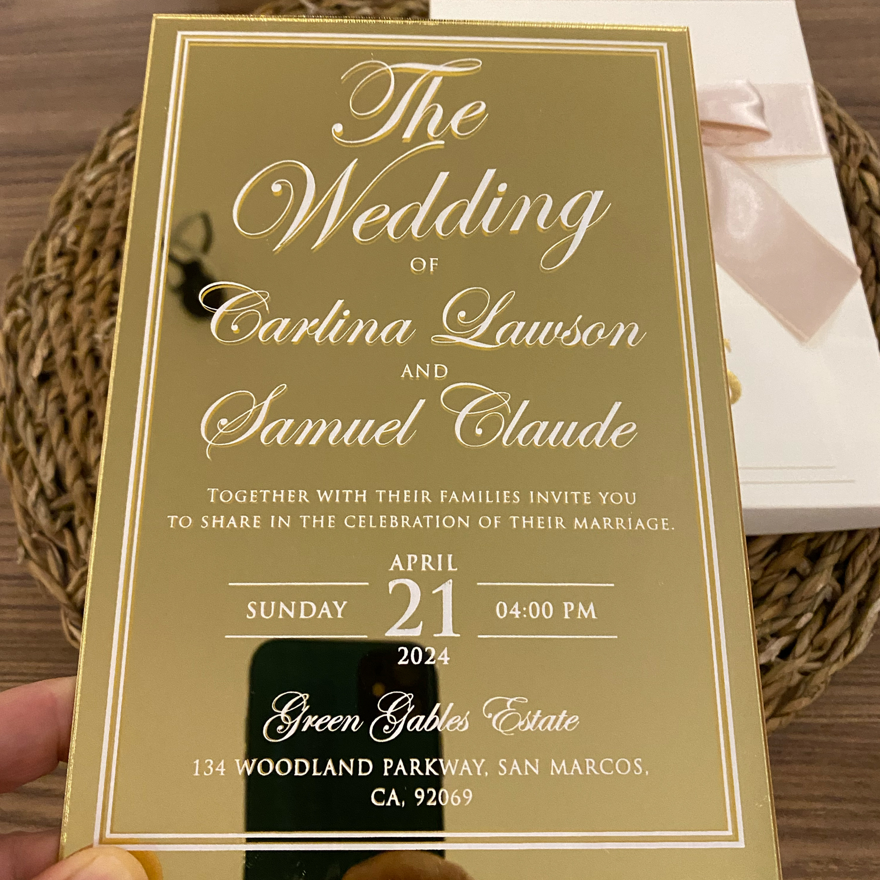 Tags: Gold mirrored wedding invitation, Gold mirror invitation, Mirror invitation, Ivory invitation box, Ivory boxed invitation, Custom design
