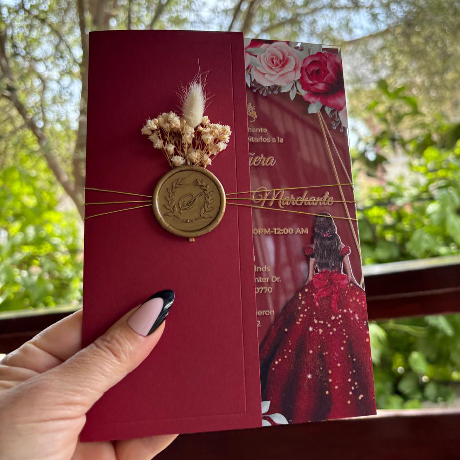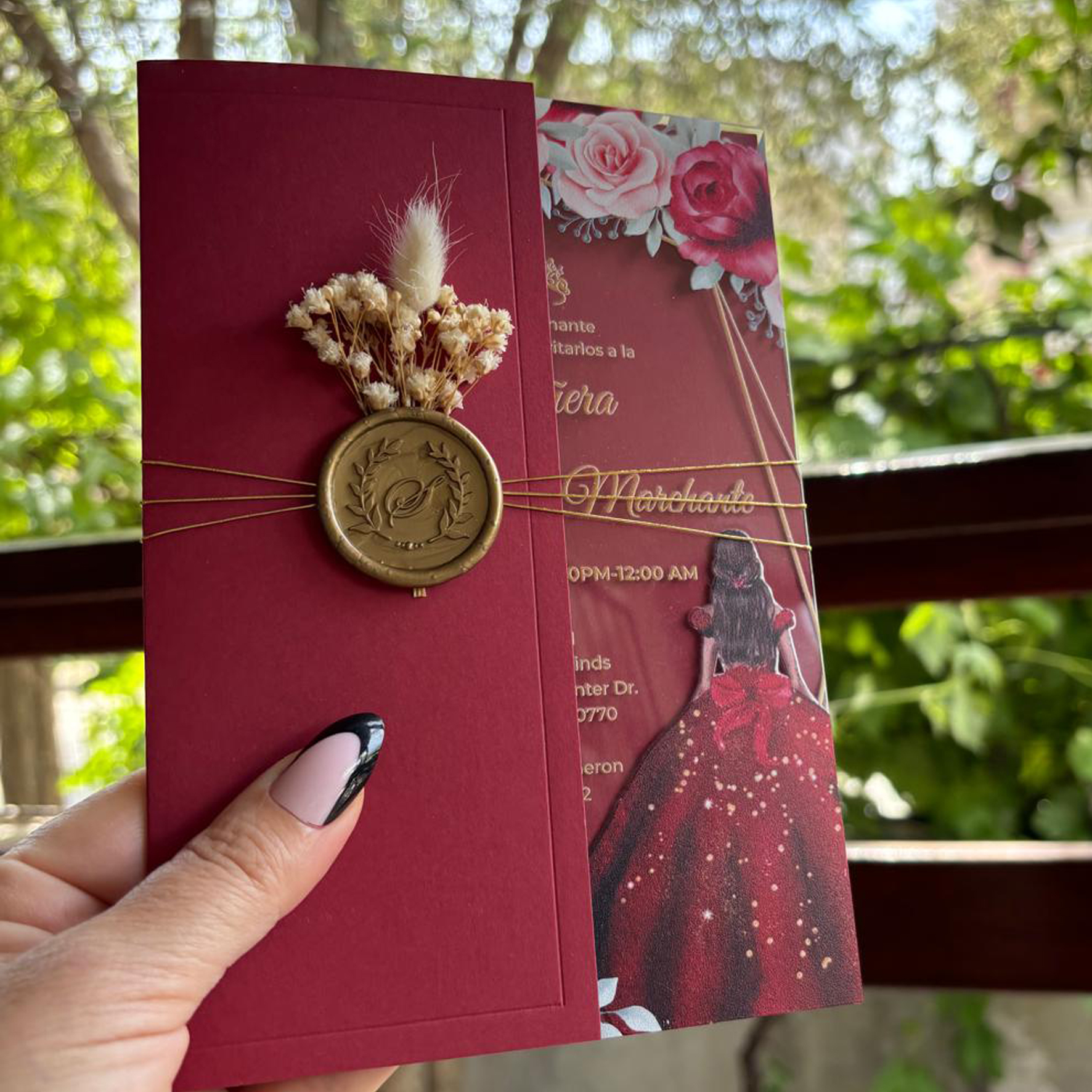 Tags: Princess invitation with red dress, Quinceañera invitation, Acrylic Quinceanera invitation, Red half envelope, Gold wax seal and dried flowers