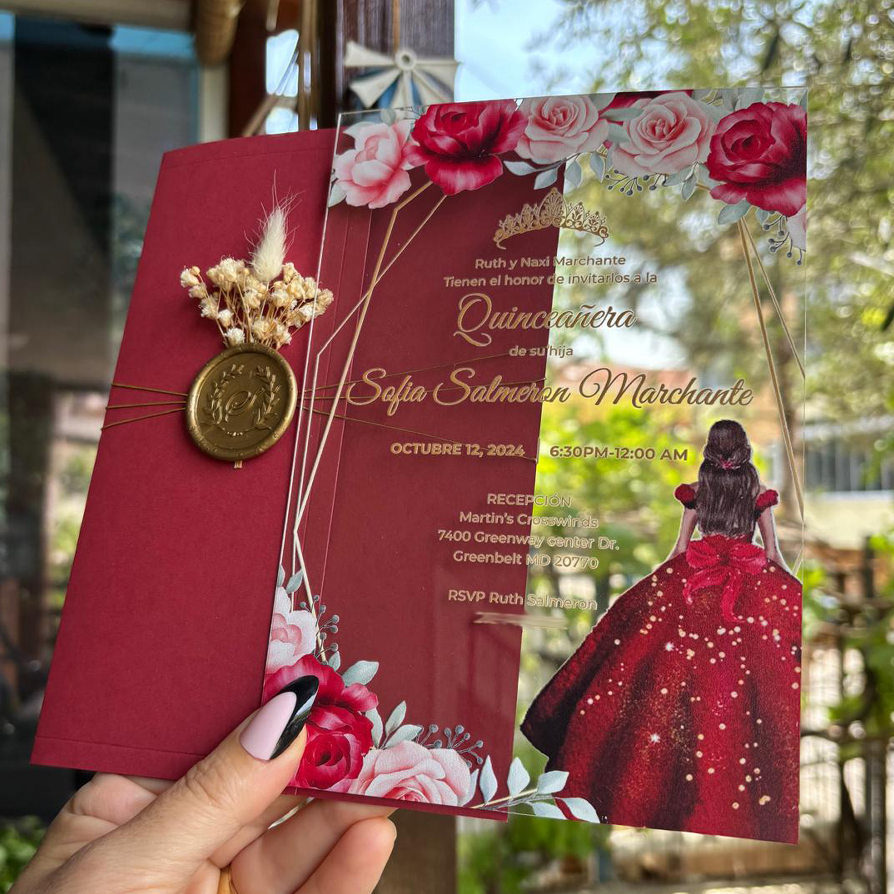 Princess invitation with red dress, Quinceañera invitation, Acrylic Quinceanera invitation, Red half envelope, Gold wax seal and dried flowers