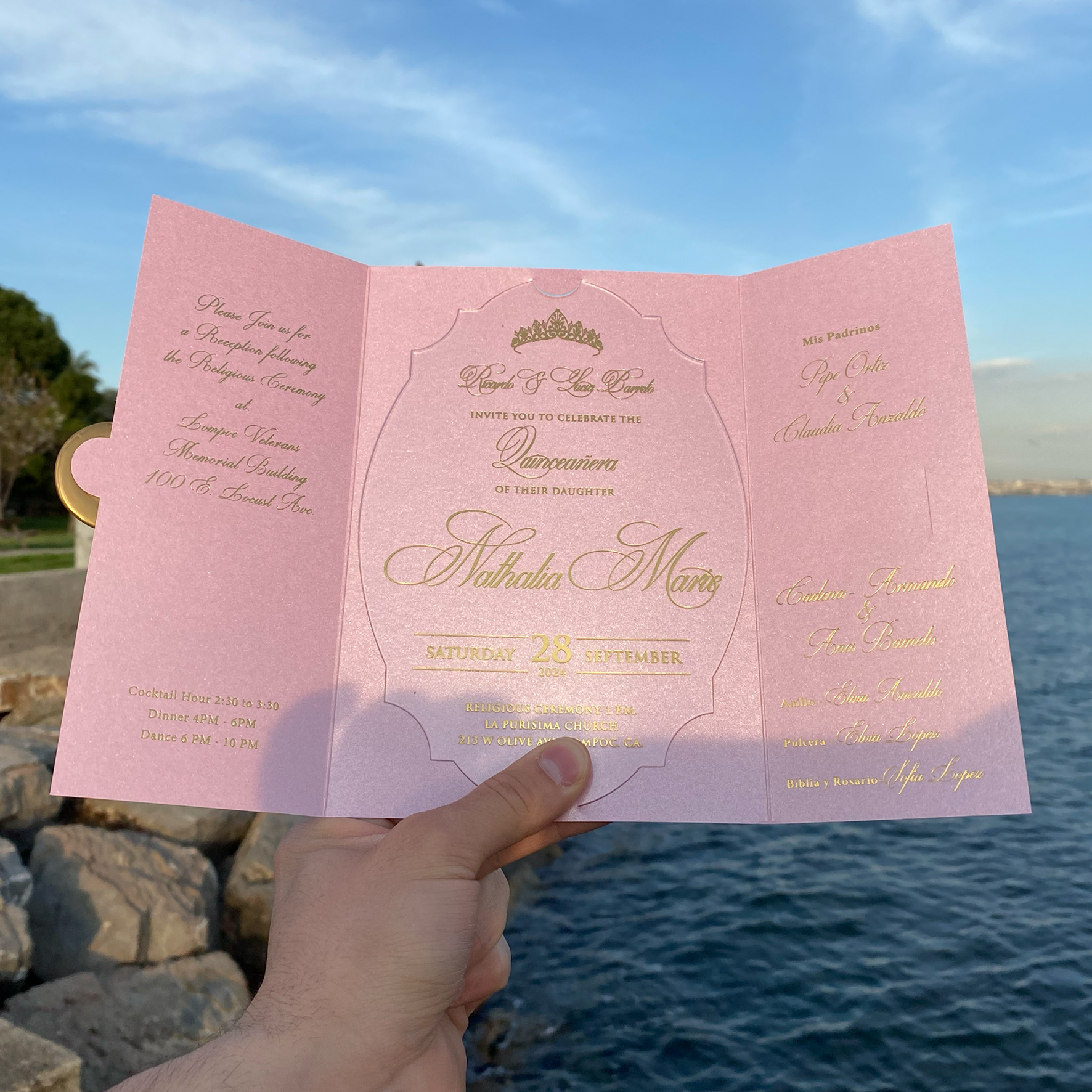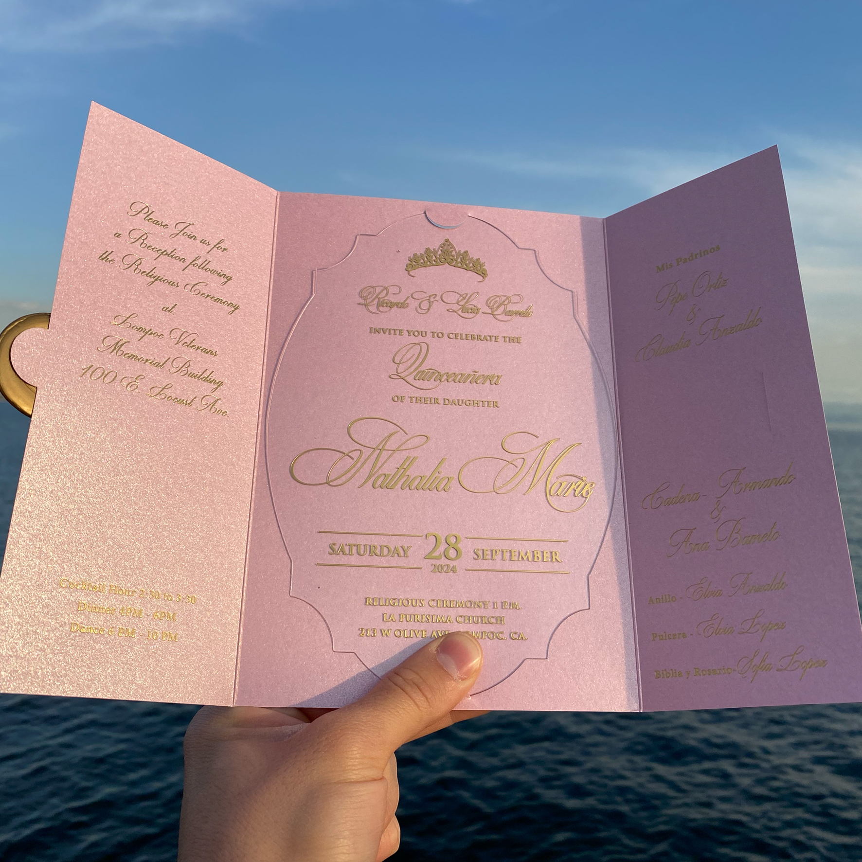 Tags: Quinceañera invitation, Acrylic Quinceañera invitation, Acrylic birthday invitation, Custom cut transparent acrylic invitation, Pink pearl envelope, Mailing envelope