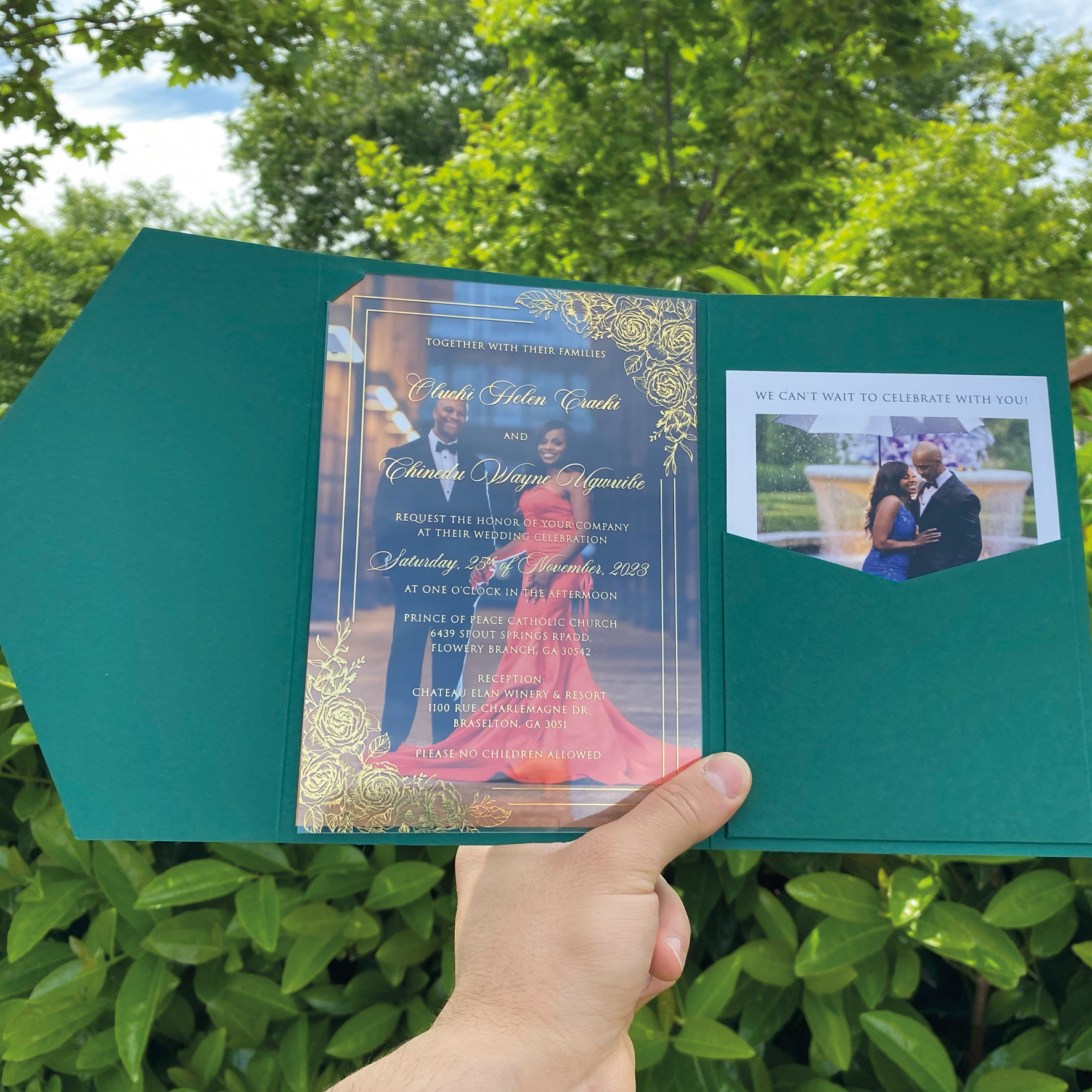 Acrylic wedding invitation with photo, Photo printed card, Pocket envelope, Gold wax seal, Emerald green or Ivory pocket envelope, Personally designed invitation